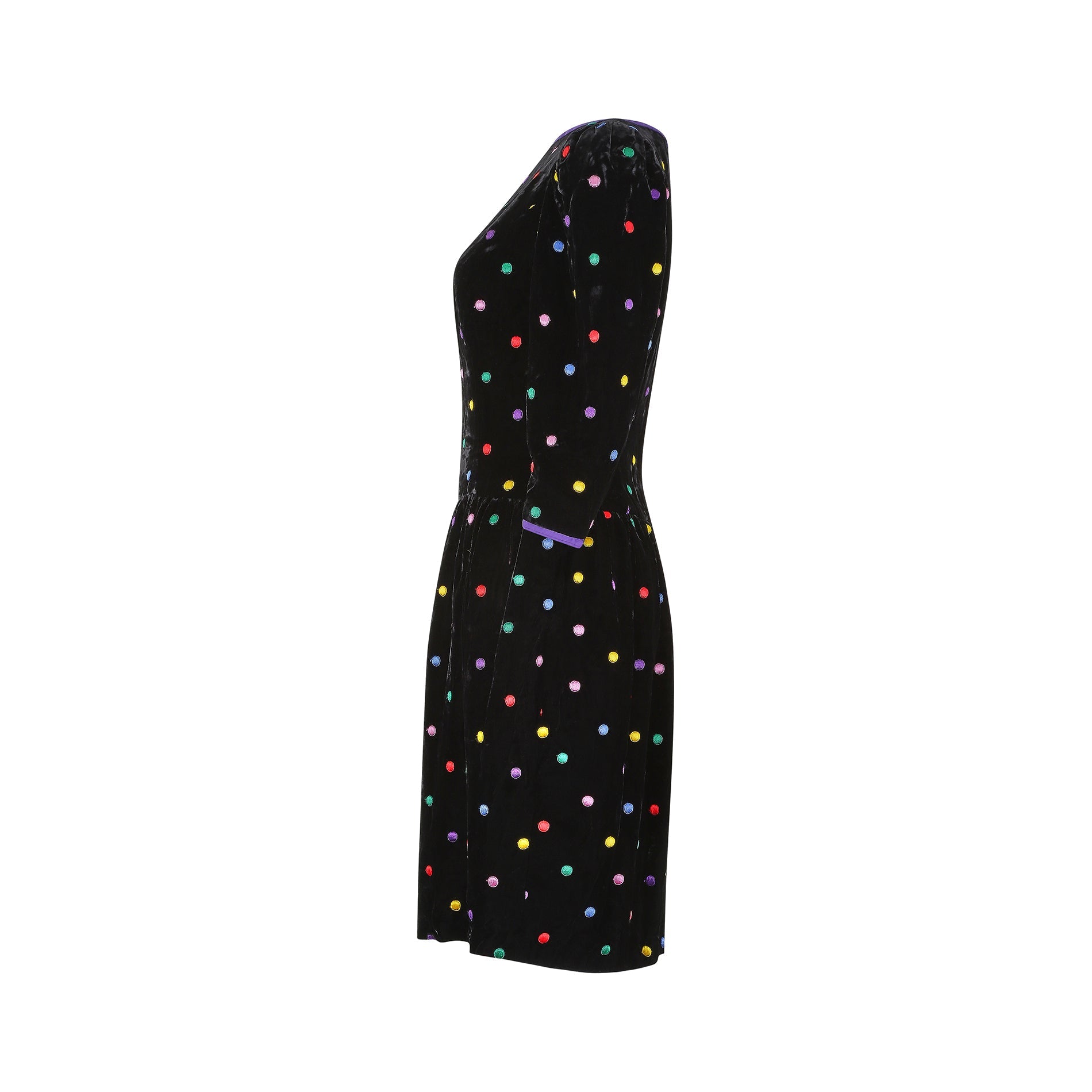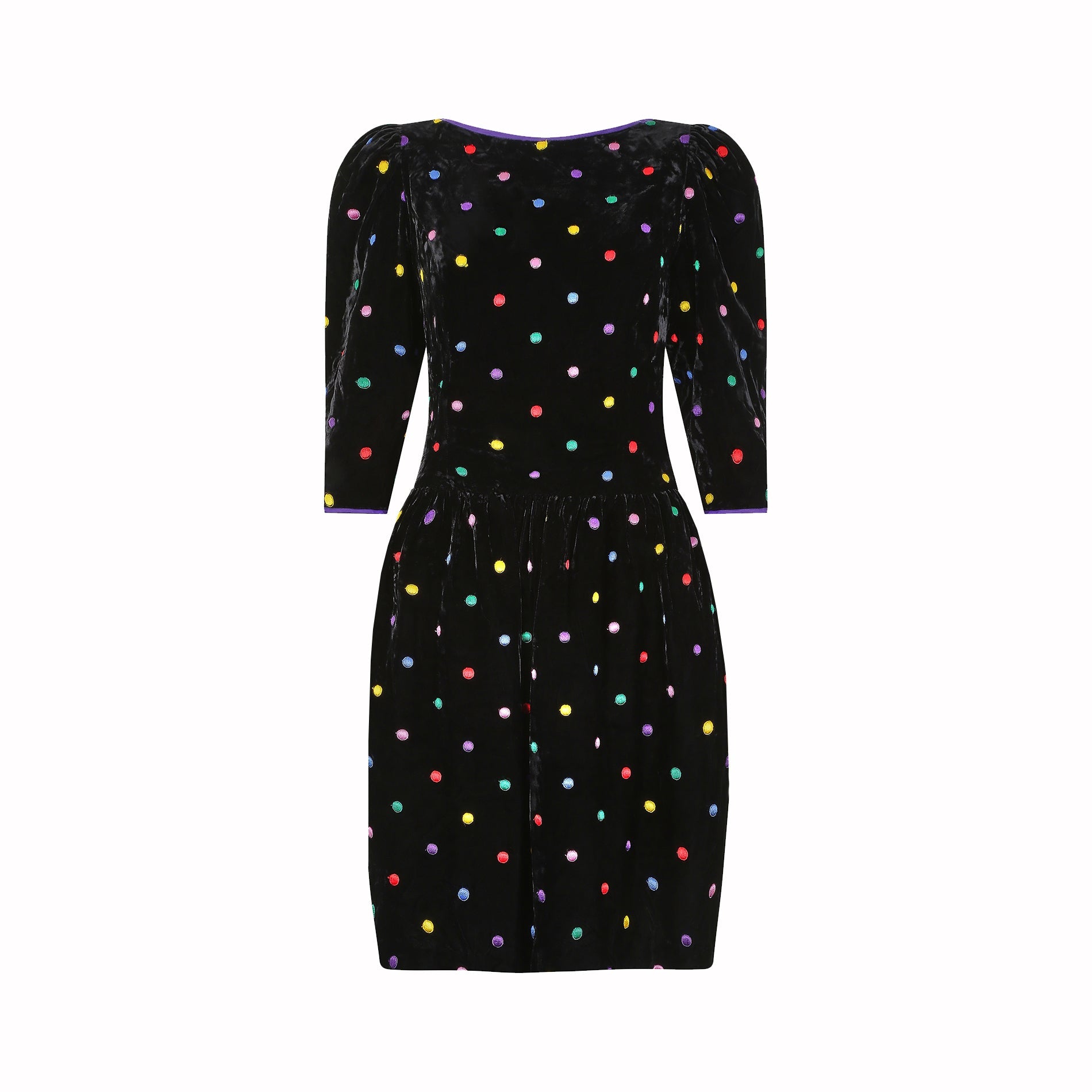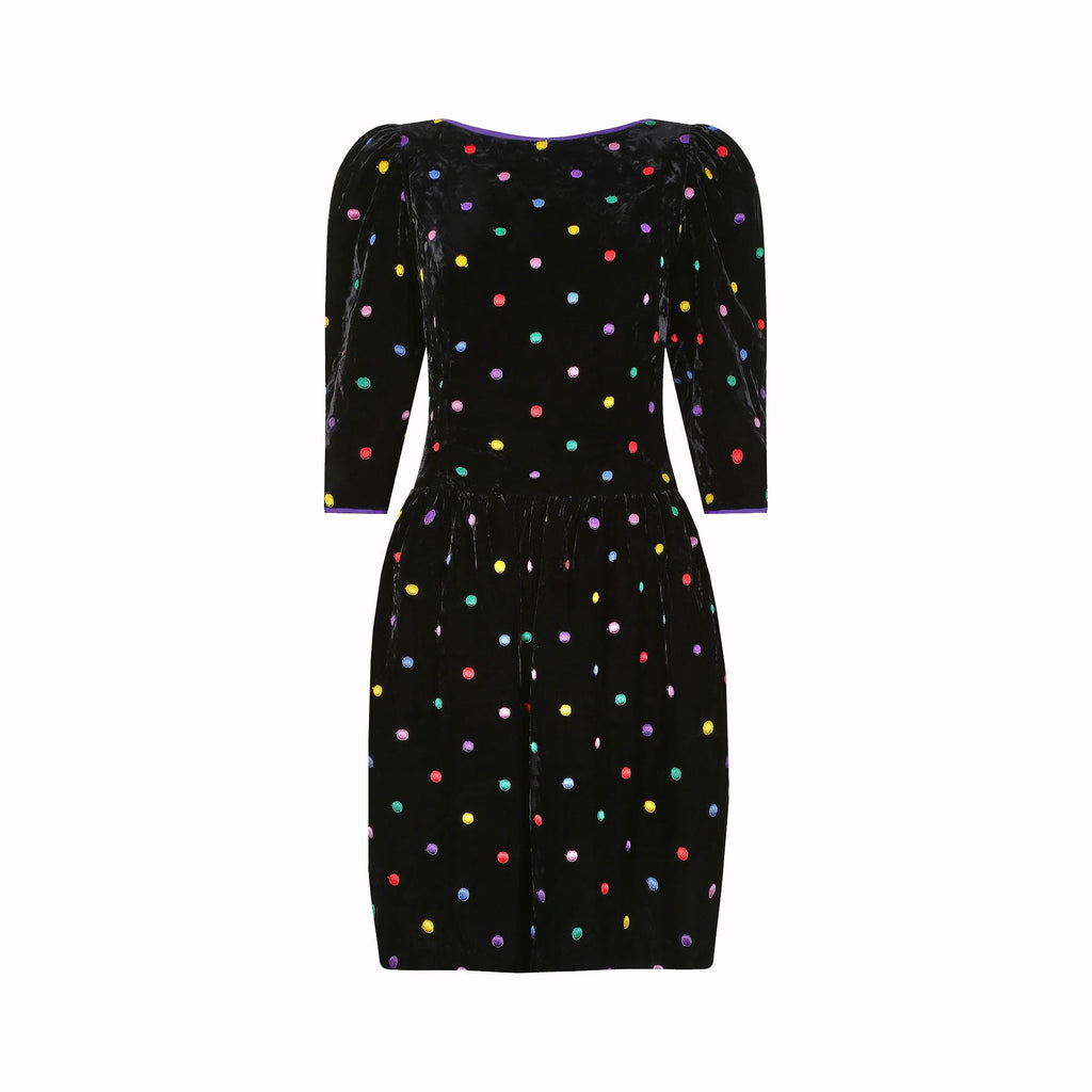 This late 1980s or early 1990s black velvet polka dot dress by Caroline Charles would make the perfect seasonal party piece! It features a wide boat neckline with purple silk contrast edge, and puff 3/4 length sleeves which add structure to the overall silhouette. The cuff of each sleeve is also finished with the same purple edge as the neckline. The dress has a slightly dropped waist (as was common for the styles of the era) and a gathered skirt which creates definition at the hip and falls to around knee length. The fabric is a lovely thick, soft velvet, with an embroidered polka dot pattern in shades of red, yellow, green, blue, purple and lilac. It is lined in a cool silky material and black net underpinning, to add a little extra volume, and fastens down the back with a simple zip closure.