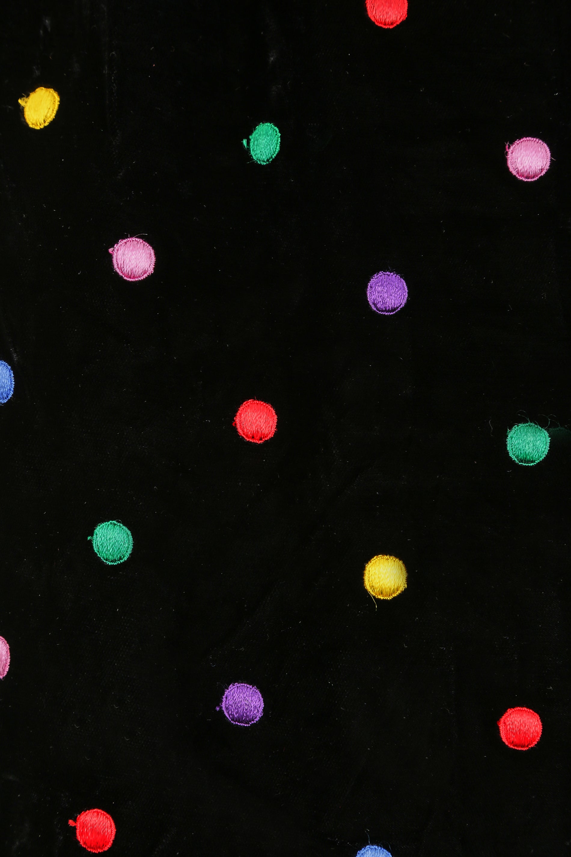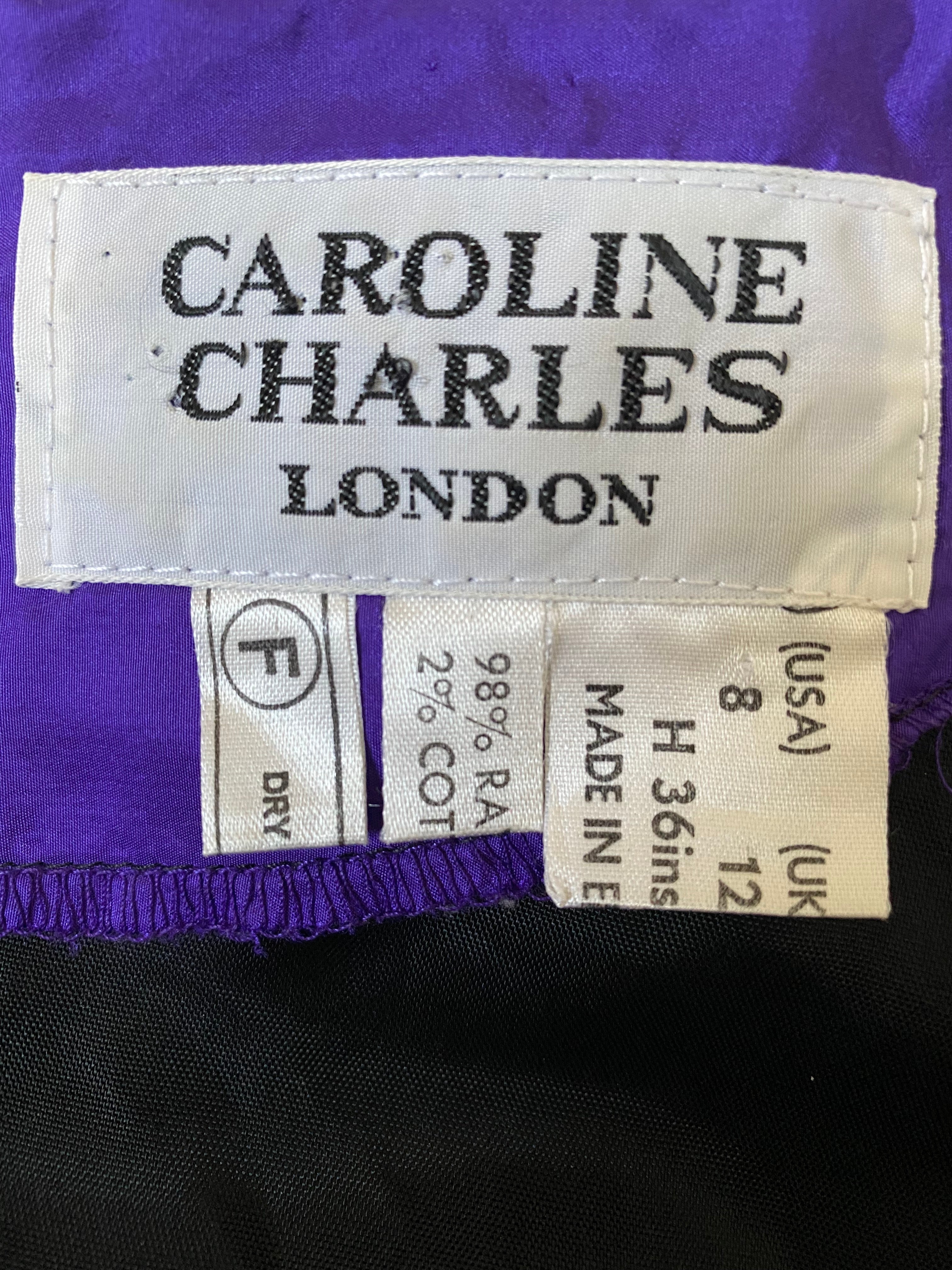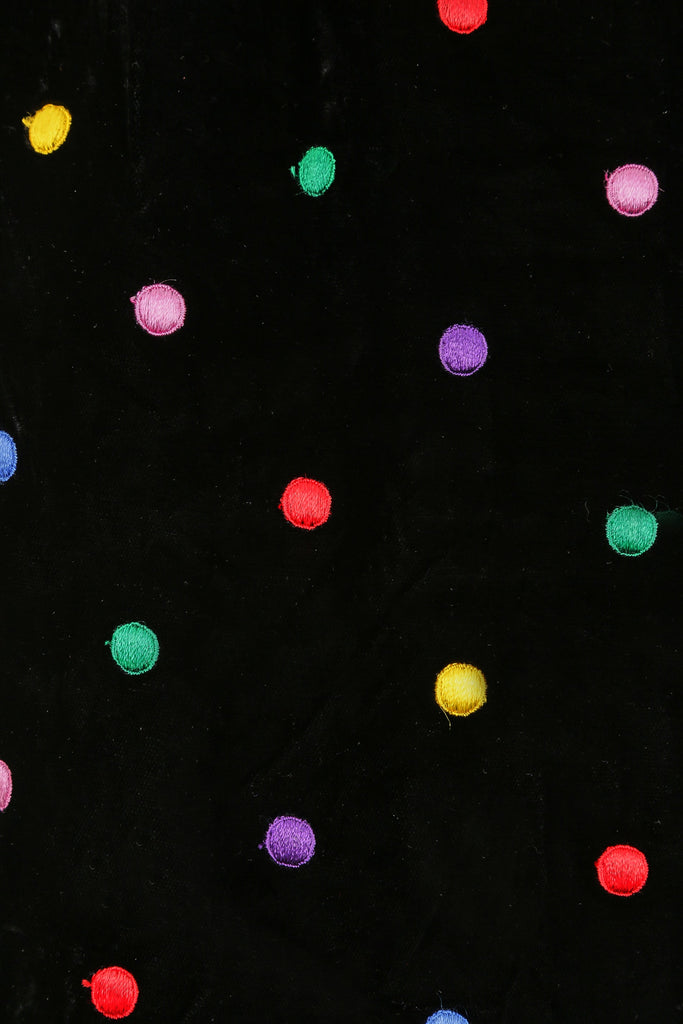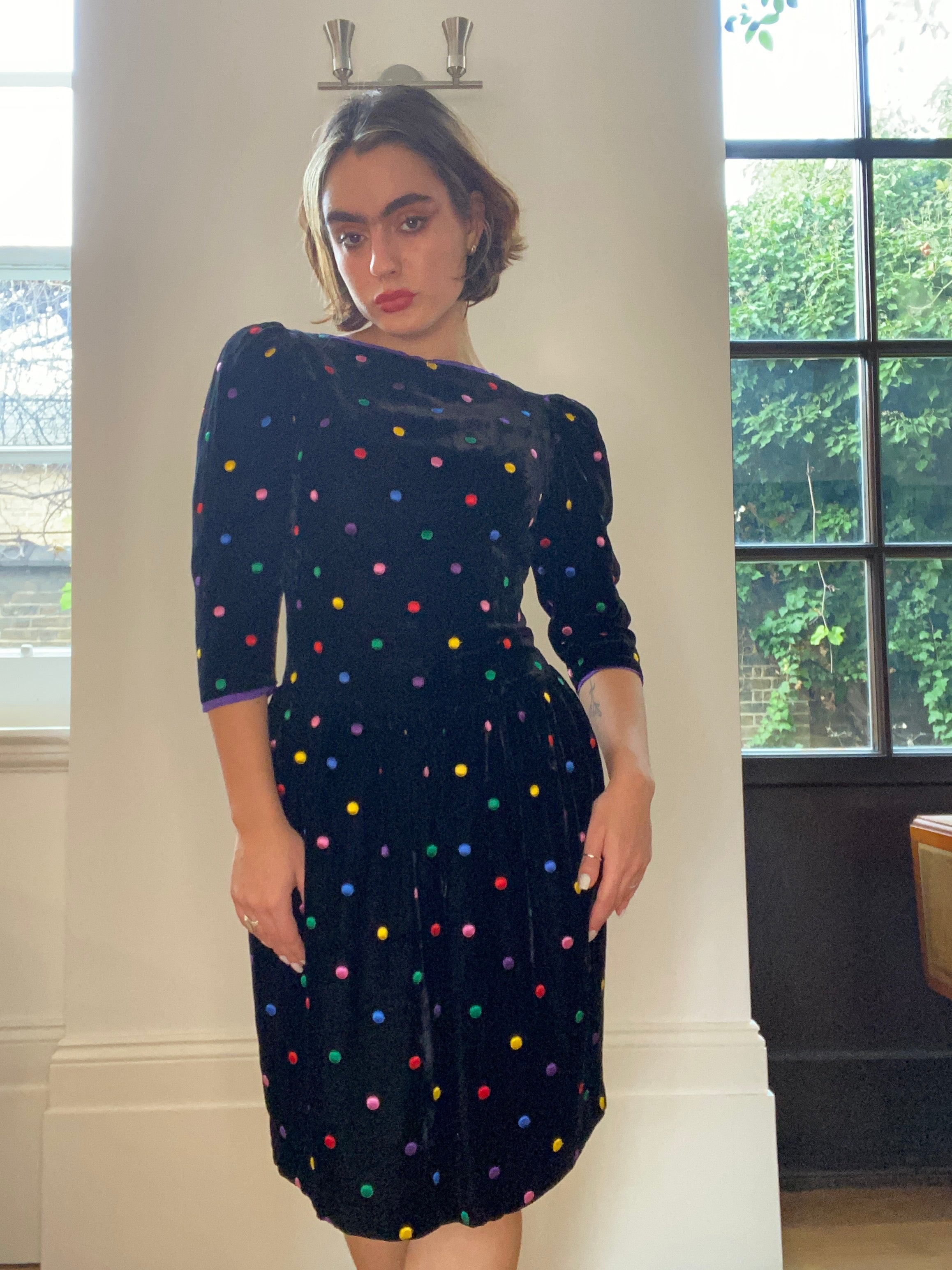 This late 1980s or early 1990s black velvet polka dot dress by Caroline Charles would make the perfect seasonal party piece! It features a wide boat neckline with purple silk contrast edge, and puff 3/4 length sleeves which add structure to the overall silhouette. The cuff of each sleeve is also finished with the same purple edge as the neckline. The dress has a slightly dropped waist (as was common for the styles of the era) and a gathered skirt which creates definition at the hip and falls to around knee length. The fabric is a lovely thick, soft velvet, with an embroidered polka dot pattern in shades of red, yellow, green, blue, purple and lilac. It is lined in a cool silky material and black net underpinning, to add a little extra volume, and fastens down the back with a simple zip closure.
