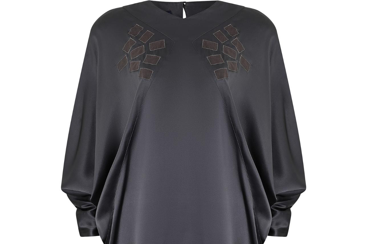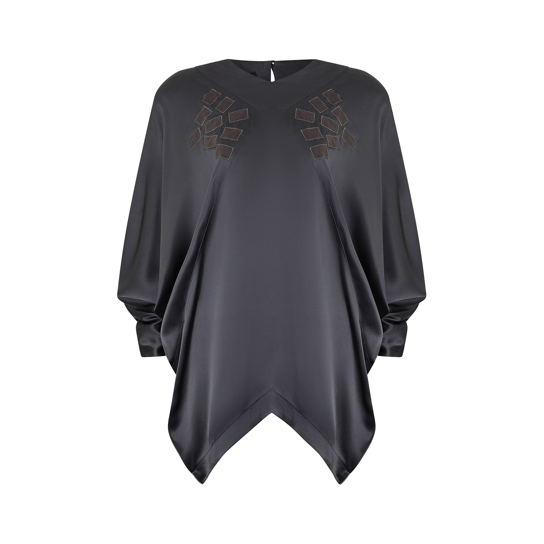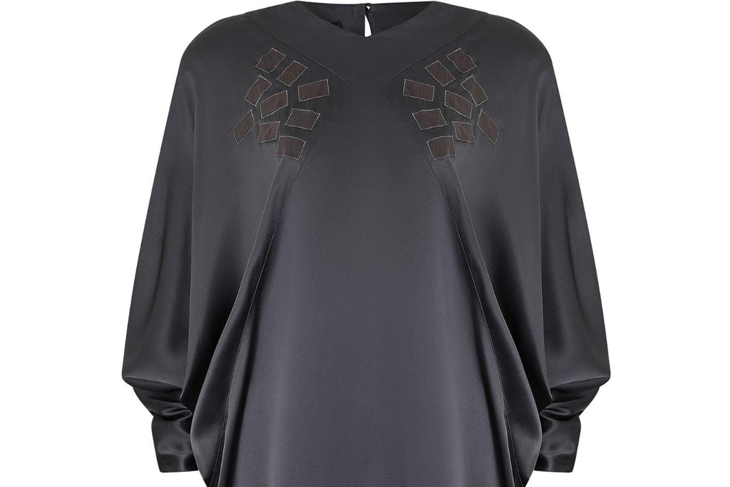 This 1980s Jean Muir batwing blouse is crafted from an incredibly soft silk, in a lovely deep gunmetal grey colour. It has shoulder padding to create a more structured silhouette and fastens at the back of the neck with a simple loop and button closure. The front features a geometric pattern of patchwork rectangles to both the left and right hand sides, a design very reminiscent of the abstract trends of the early part of the decade. Each rectangle is embroidered around the edge with a delicate silver thread, to add some extra sparkle. The full batwing sleeves of the blouse fasten in the same way as the neck, with a simple button closure to each tapered cuff.