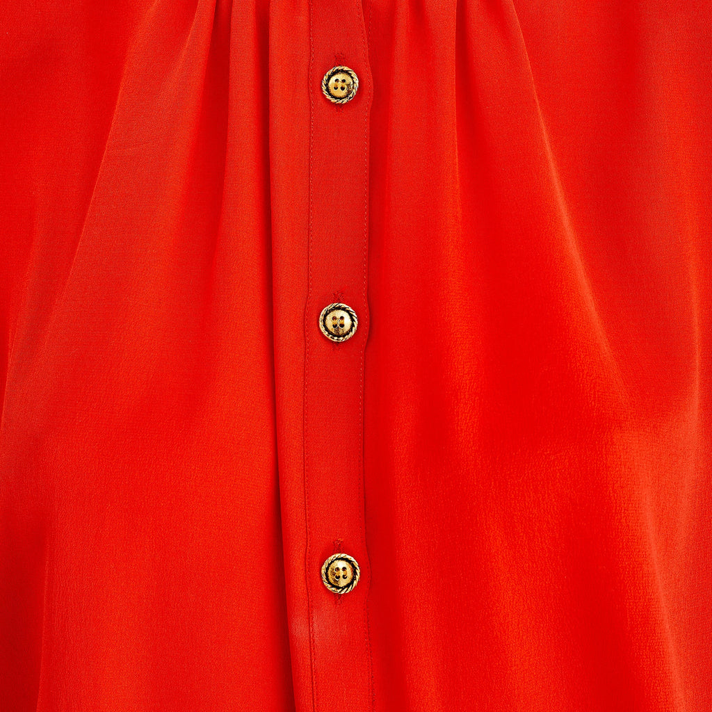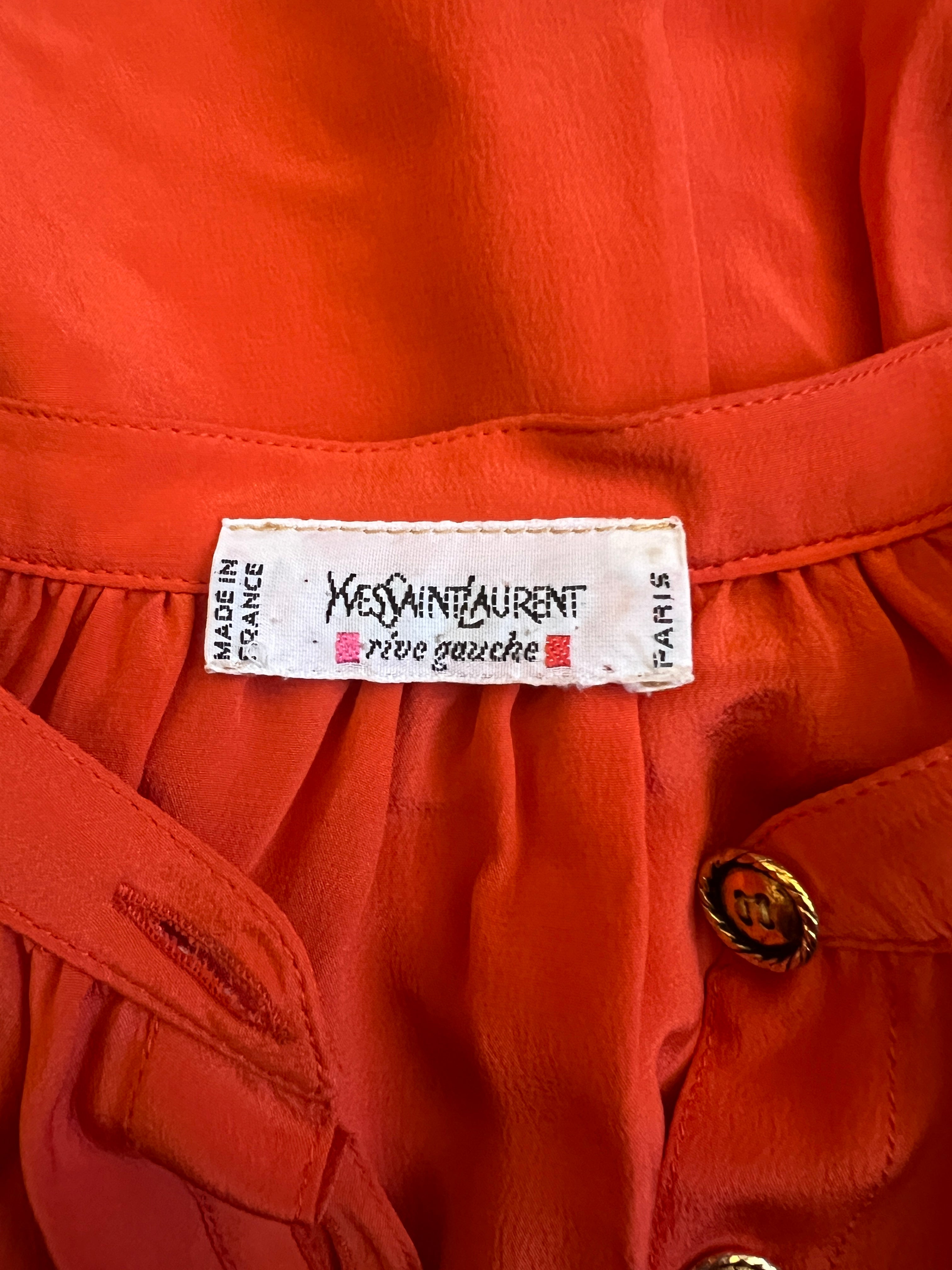 This timeless silk shirt was designed by French fashion house Yves Saint Laurent during the 1980s but could conceivably be a bit later, say early 1990s. Made in France, it is crafted from matte silk in vibrant tangerine orange. The label reads “Saint Laurent Rive Gauche”, a reference to Paris’s younger and trendier left bank. Cut to a high neck style, it is collarless. The fabric is gathered around the collar and the cuffs. It is tailored to a wide, straight silhouette; the resulting voluminous, floaty shape giving a romantic feel. The front lapels and cuffs are adorned with gold-tone metal buttons with carved braid detailing, adding to the casually luxurious feel of this piece.