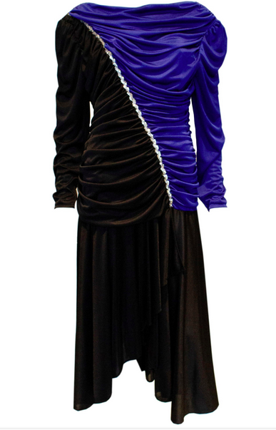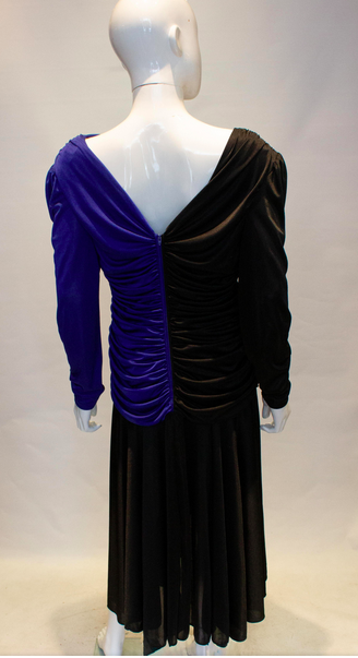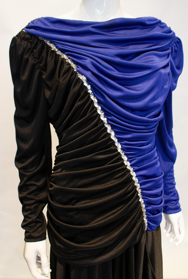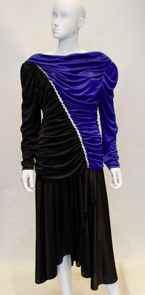 A very 1980s , but easy to wear evening dress by Filigree. The dress is in a blue and black combination with gathering and sequin detail. It has a central back fastening , is shorter at the front and great for dancing. Measurements: Bust 38'', length 53''