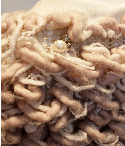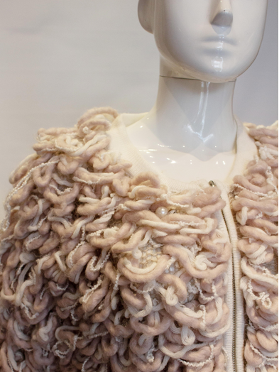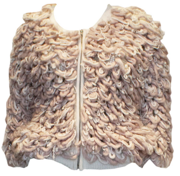 A fun vintage cardigan for fall. In a pink and cream knit with loop detail the cardigan has a zip front opening, sccop neckline. and scattered pearl and diamante detail. Measurements Bust up tp 44'', length 26''
