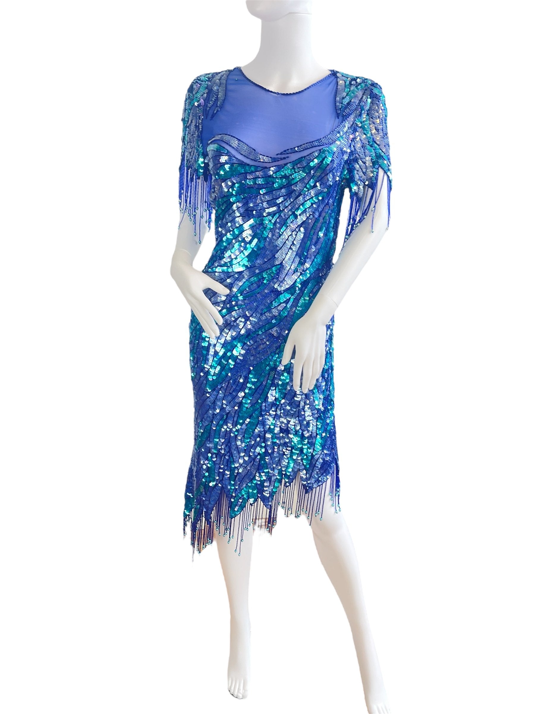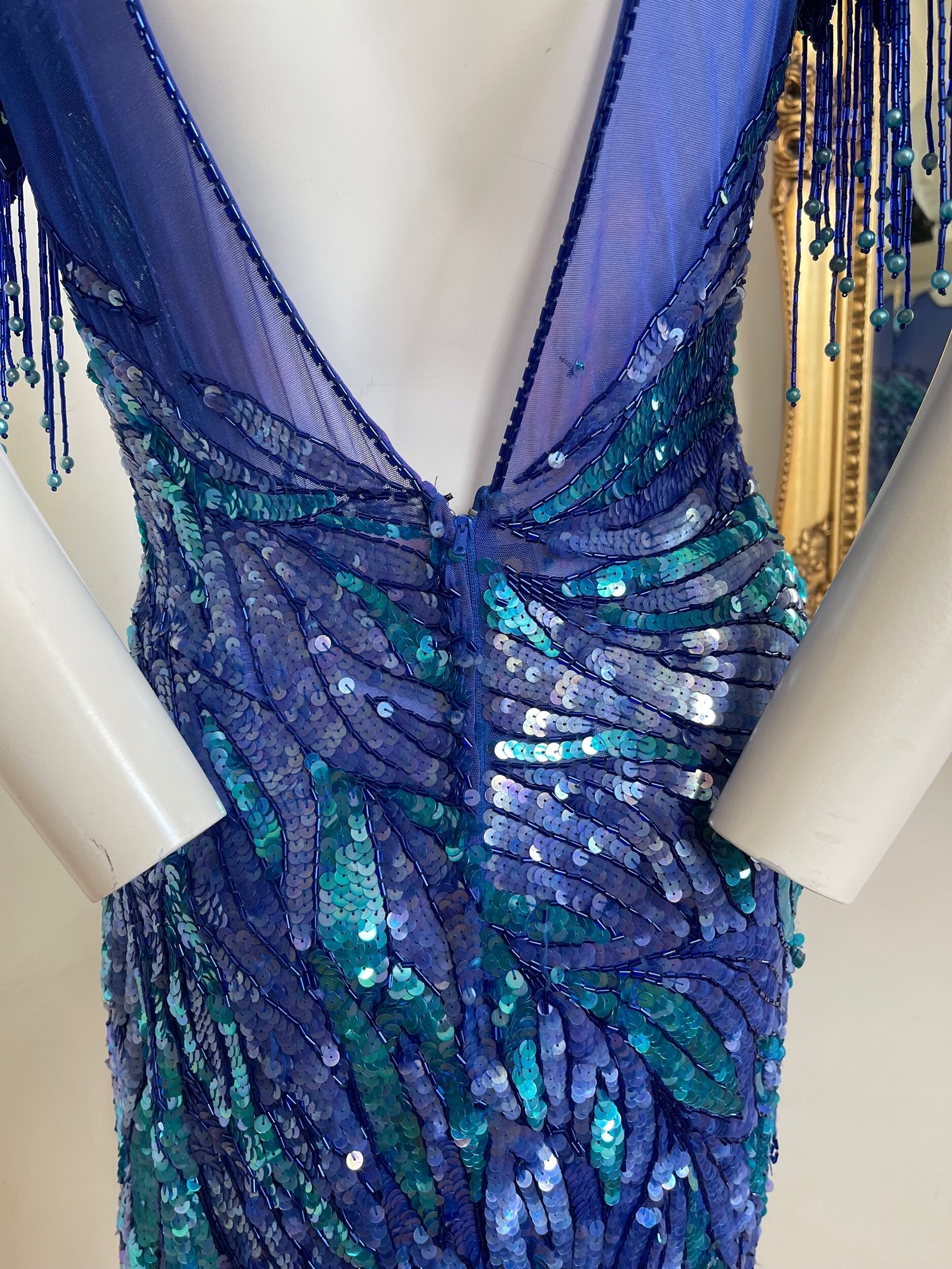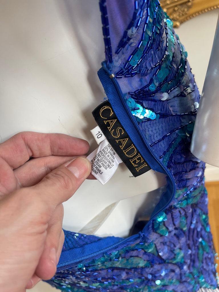 Discover the "Cher" Trophy Show Stopping Dress by Casadei, a true marvel of design and craftsmanship. This dress epitomizes elegance with its hand-beaded sequins on mesh, creating a shimmering effect that commands attention. Despite minor sequin loss from wear, the mesh fabric cleverly disguises any imperfections, ensuring a flawless appearance when worn. Ideal for sizes 8-10, this dress promises to elevate your evening with its undeniable charm and sophistication. Embrace the allure of the "Cher" Dress by Casadei and prepare to make a statement at any event.
