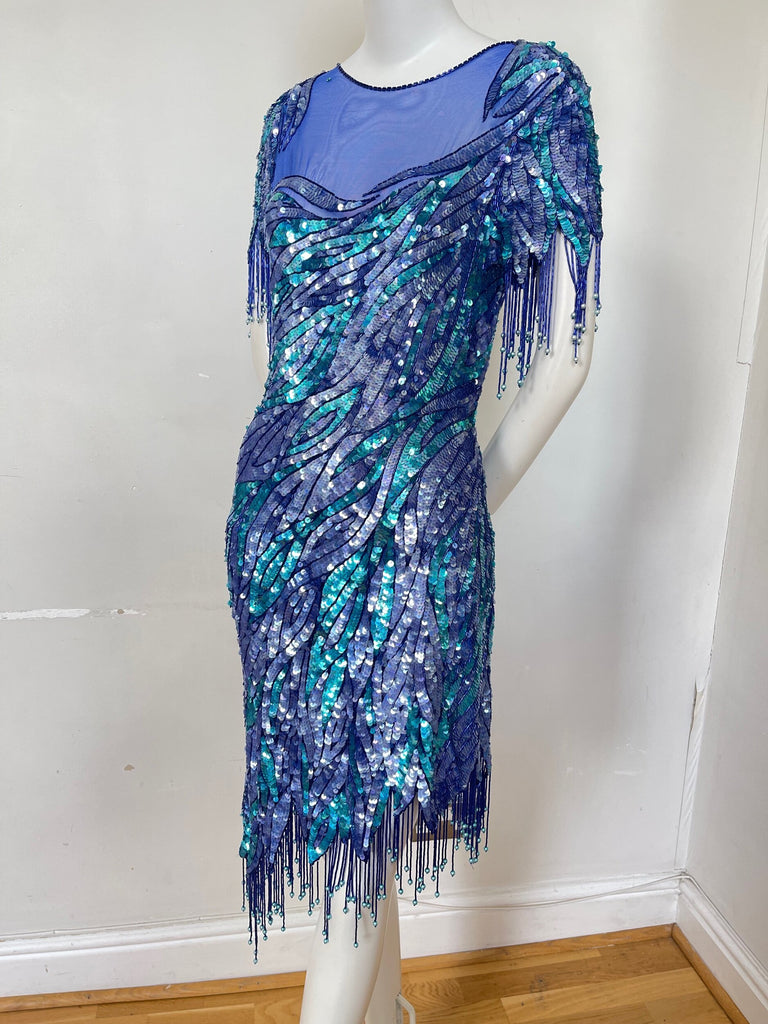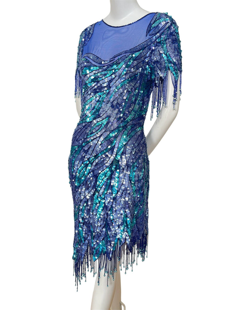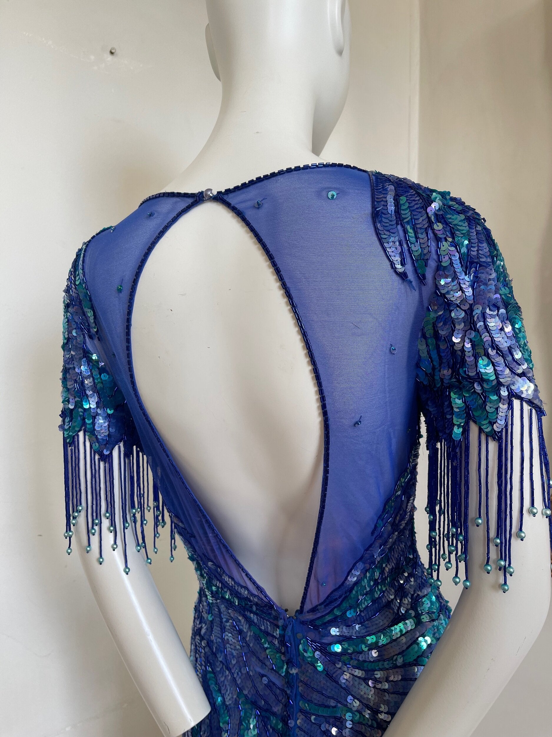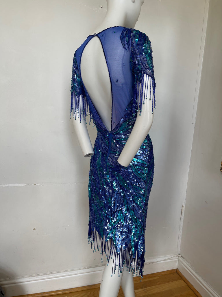 Discover the "Cher" Trophy Show Stopping Dress by Casadei, a true marvel of design and craftsmanship. This dress epitomizes elegance with its hand-beaded sequins on mesh, creating a shimmering effect that commands attention. Despite minor sequin loss from wear, the mesh fabric cleverly disguises any imperfections, ensuring a flawless appearance when worn. Ideal for sizes 8-10, this dress promises to elevate your evening with its undeniable charm and sophistication. Embrace the allure of the "Cher" Dress by Casadei and prepare to make a statement at any event.