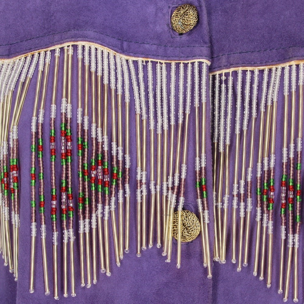 A.N.G.E.L.O. Vintage cult purple suede 90s jacket. Classic collar, fringed multicolor beads, closure with golden metal buttons.