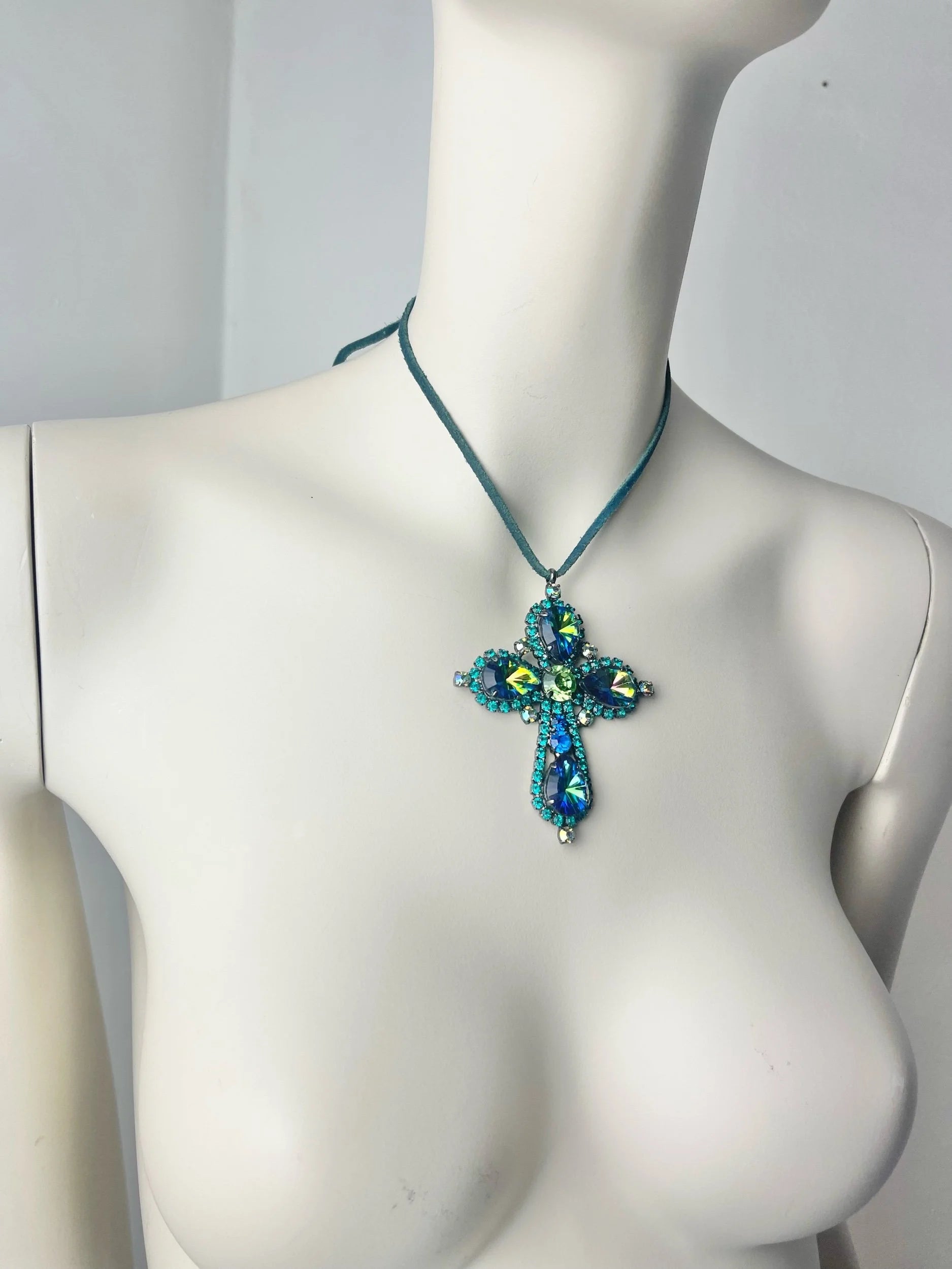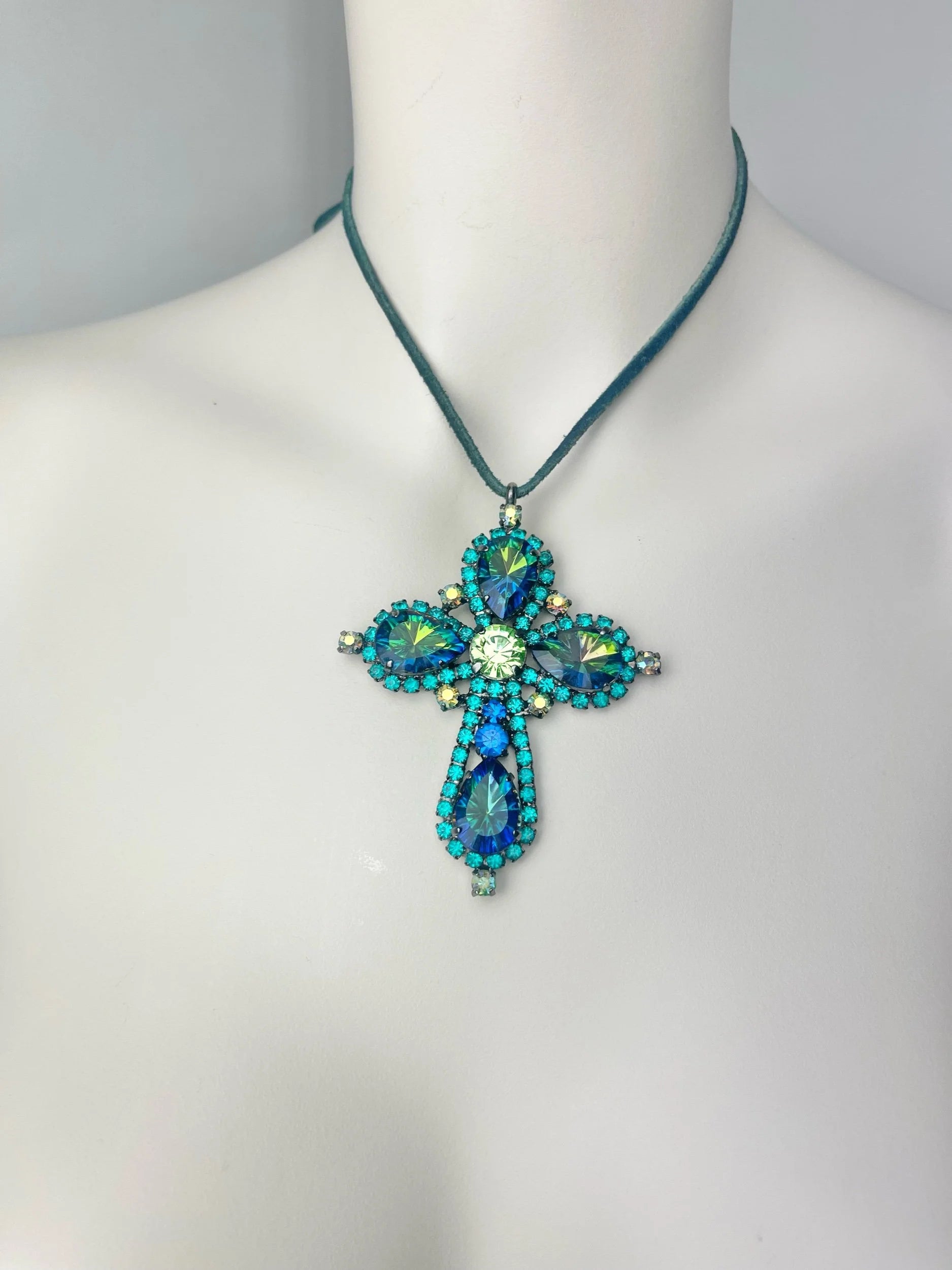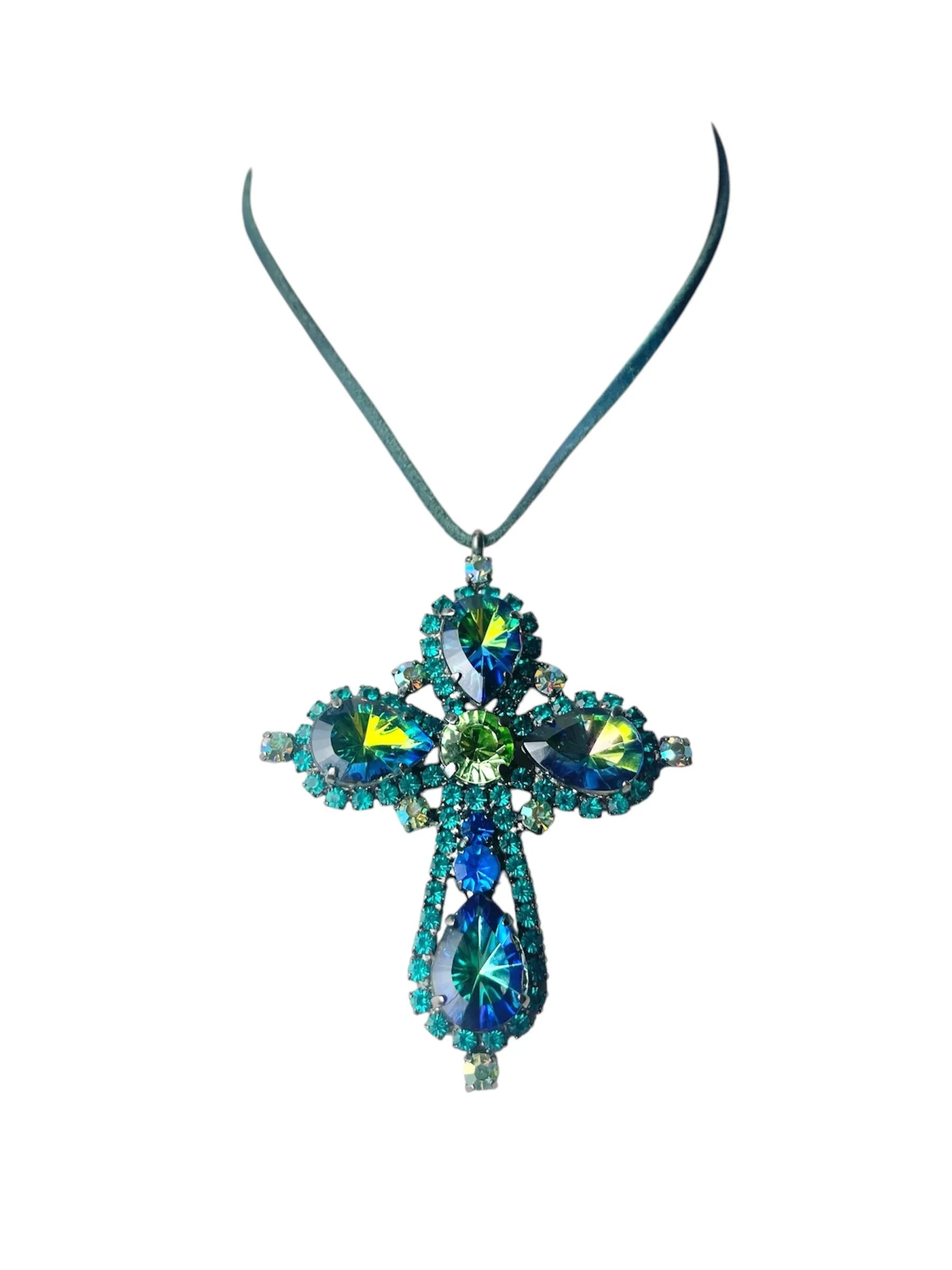 Make a bold statement with this stunning Butler & Wilson vintage cross pendant, a true showpiece from the iconic 1990s era. Measuring approximately 3 inches long by 2.2 inches across, this beautifully crafted design features vivid blue, green, and yellow crystals that shimmer with captivating iridescence.