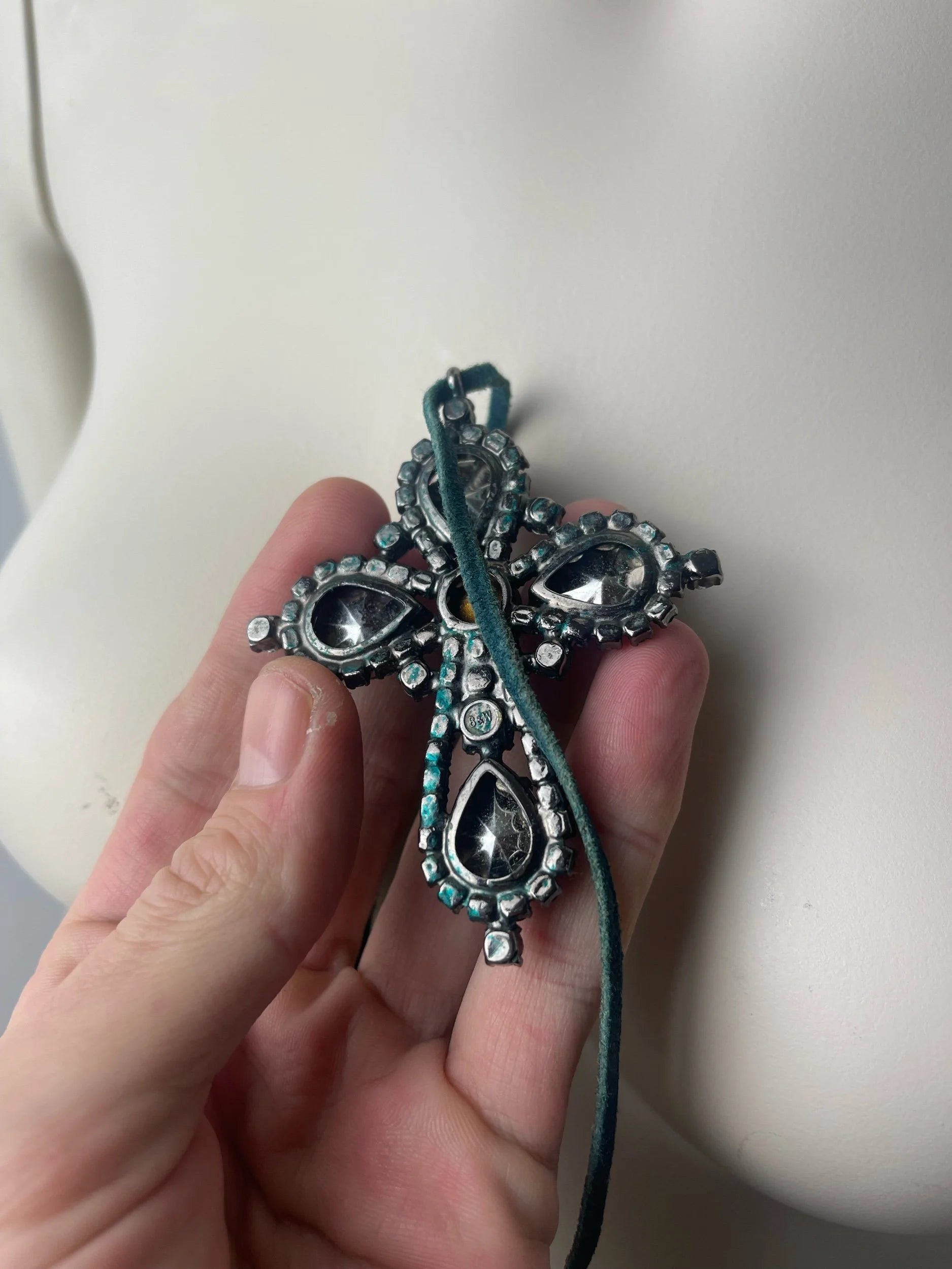Butler & Wilson 1990s Vintage Crystal Cross Pendant on Leather Tie