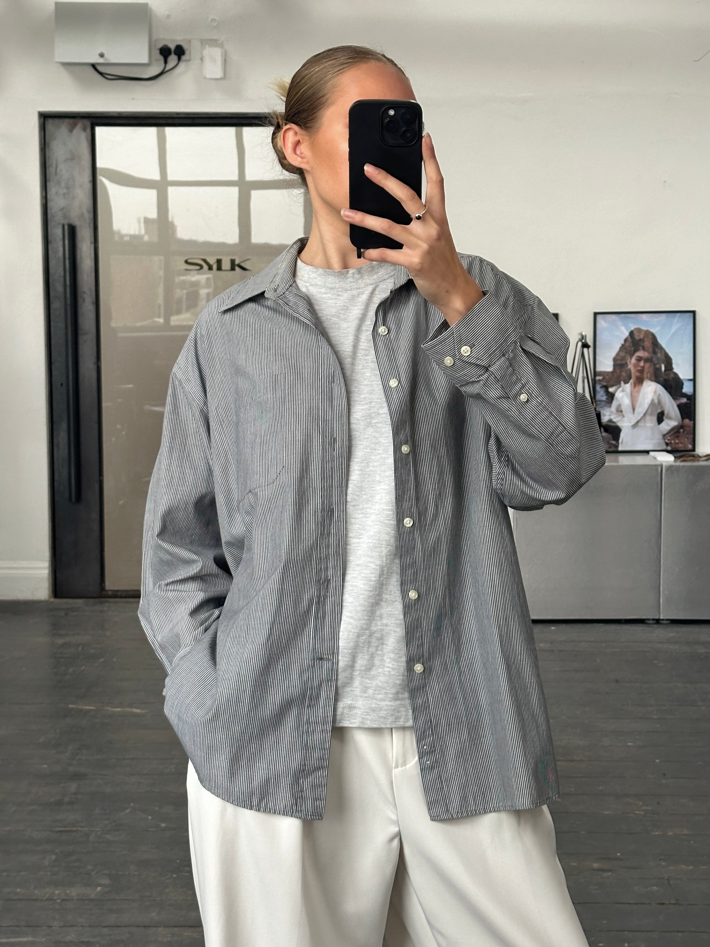 Vintage Christian Dior striped shirt crafted in a soft cotton polyester blend, featuring a pointed collar, single chest pocket and button-down front. Lightweight and relaxed with fine monochrome pinstripes, typical of Dior’s understated 1990s shirting.