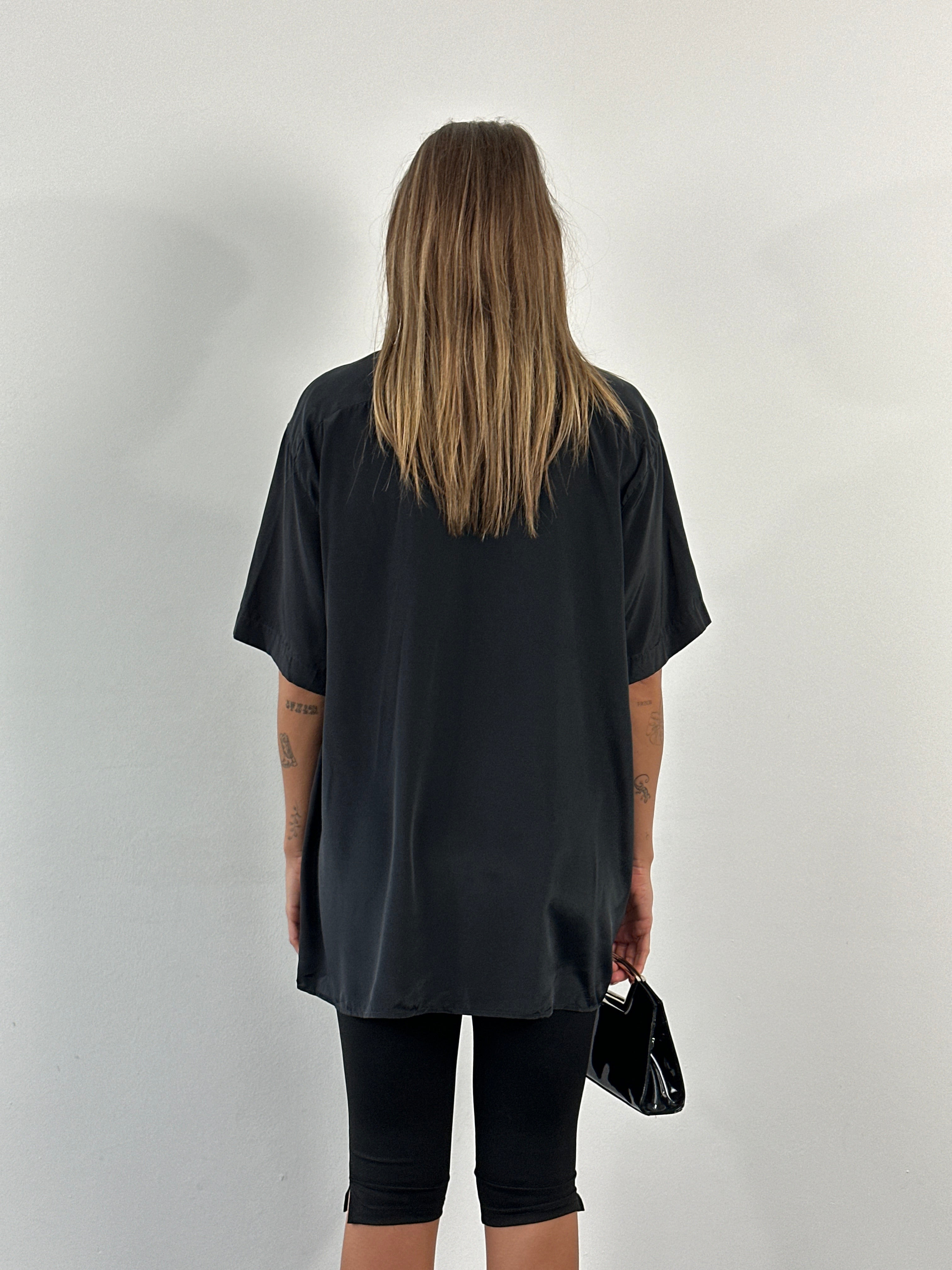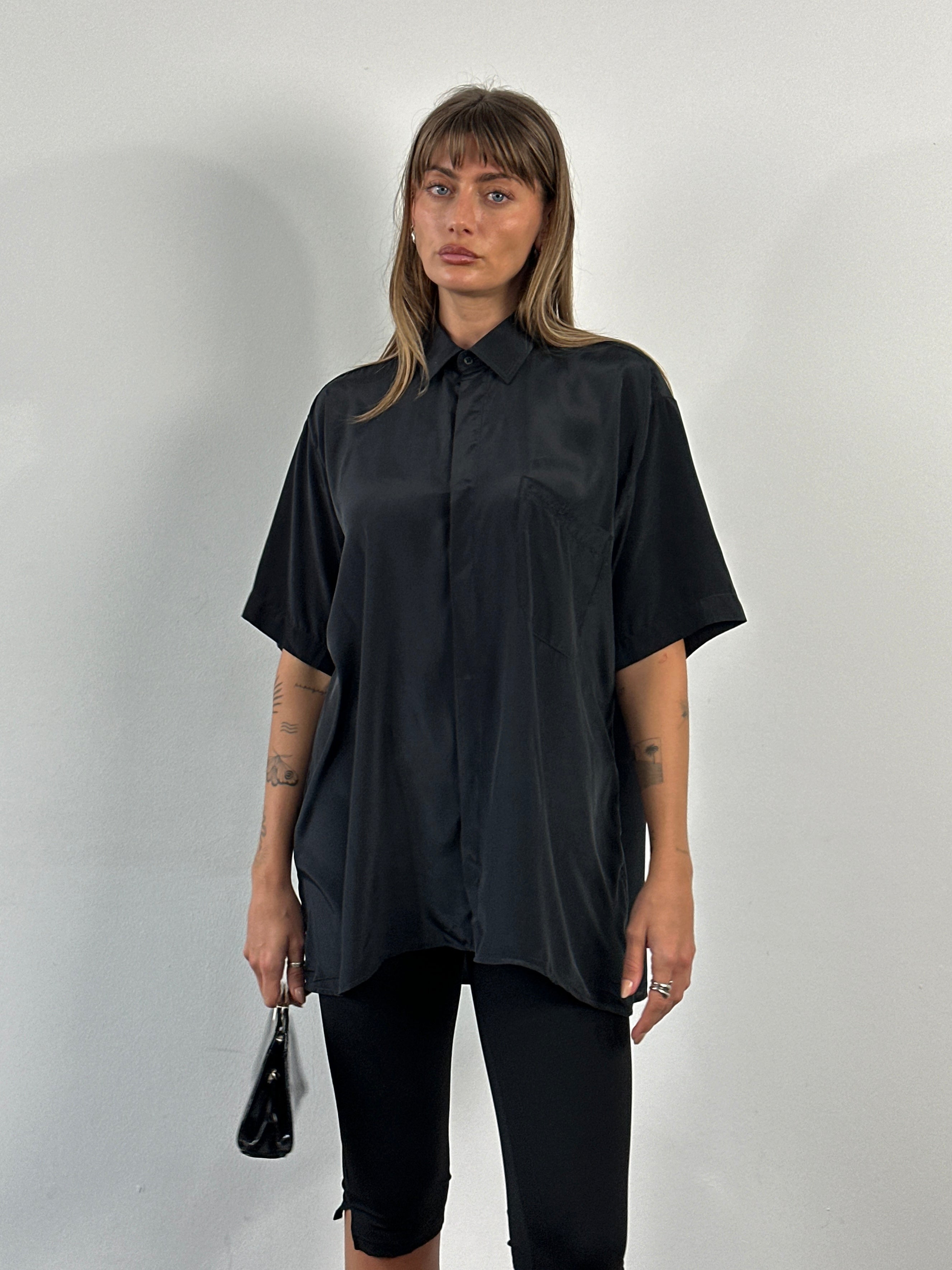 A vintage 1990s Christian Dior Paris short sleeve shirt in a deep black tone. A fluid pure silk silhouette with a concealed placket and quiet embroidered detailing.