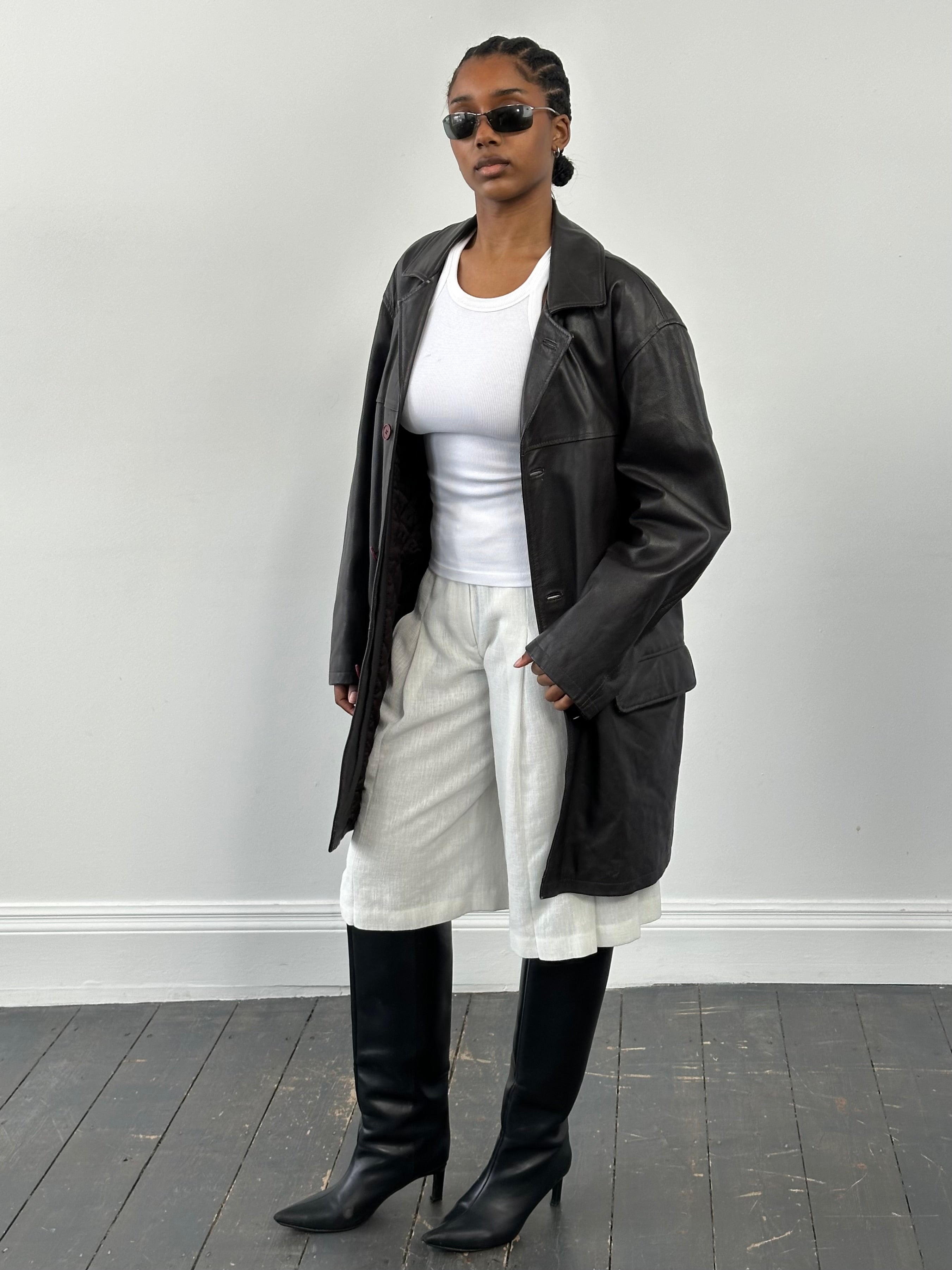 Conbipel 1990s vintage leather trench coat in deep brown genuine leather with a lightly padded quilted lining. Features a relaxed straight silhouette, notch lapels, front button fastening and subtle panel construction for a clean structured shape.