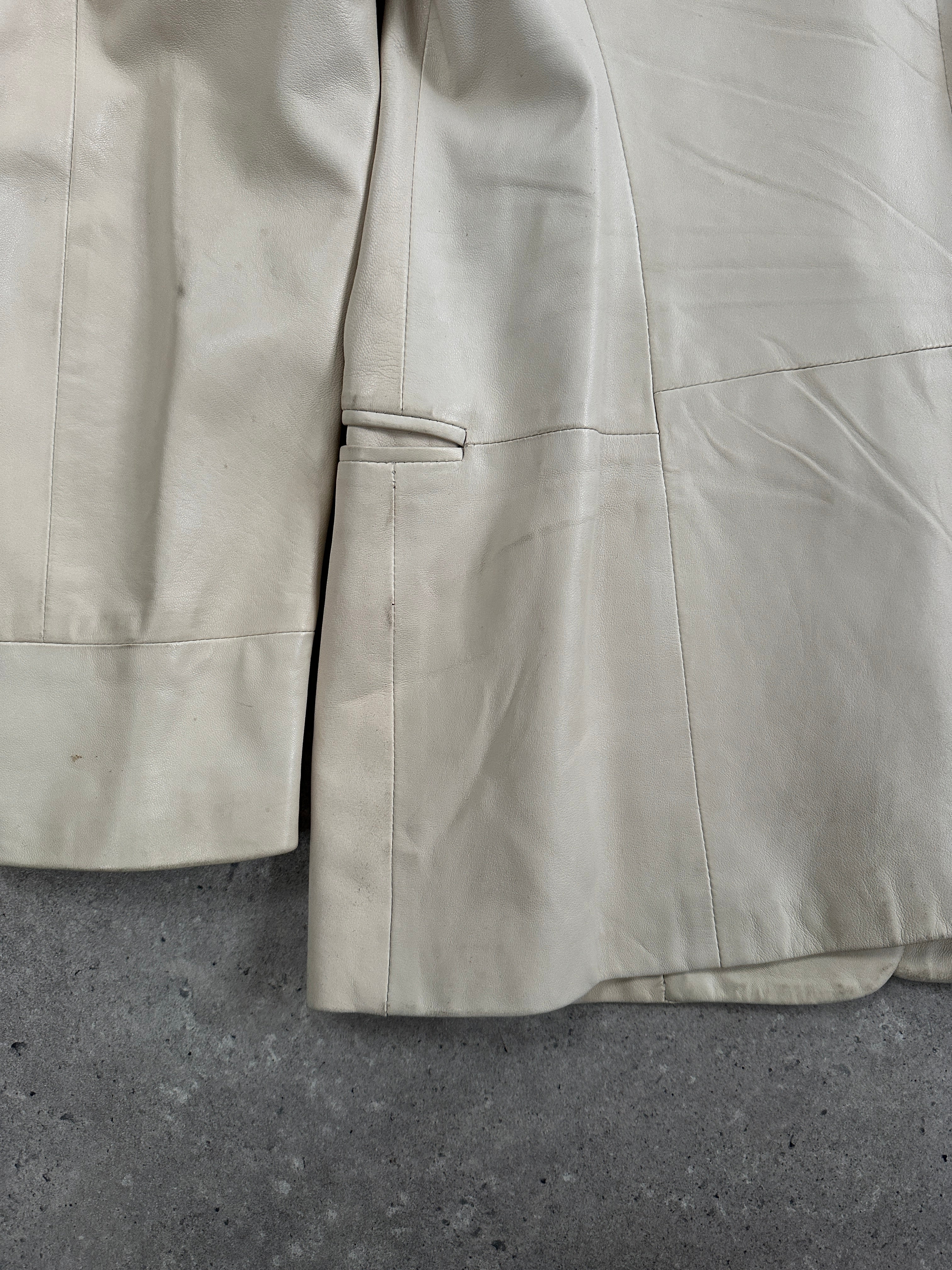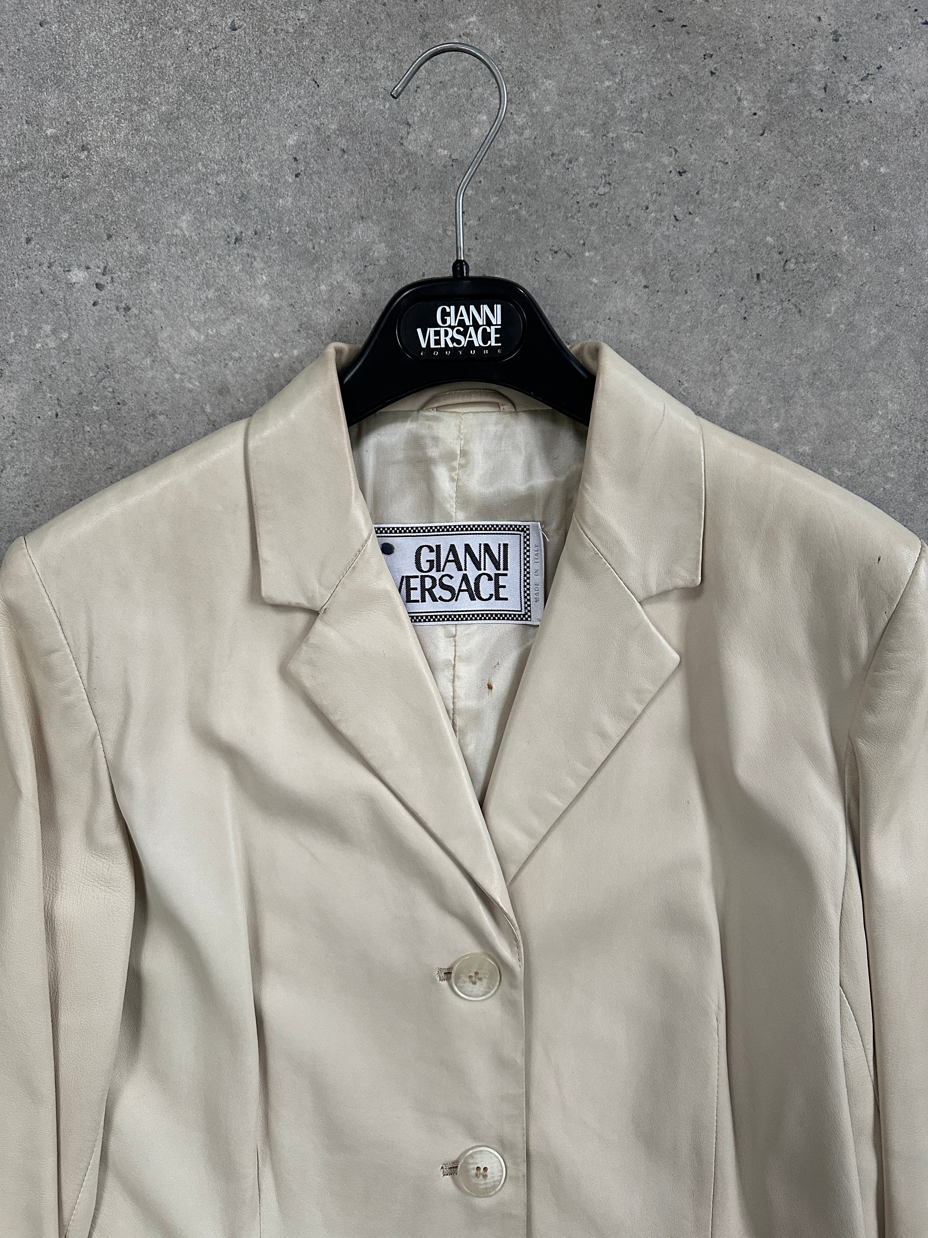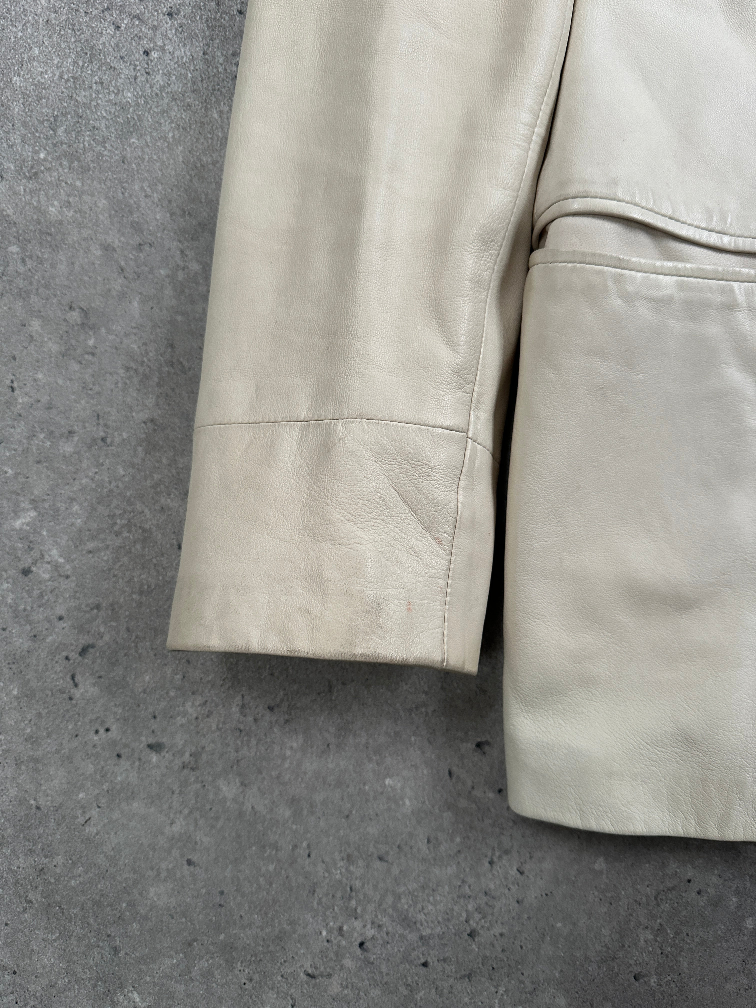 Vintage 1990s Gianni Versace cream leather jacket with a softly tailored silhouette and clean minimalist detailing. The smooth hand of the leather and the gentle shaping at the waist give this piece a quietly elevated finish.