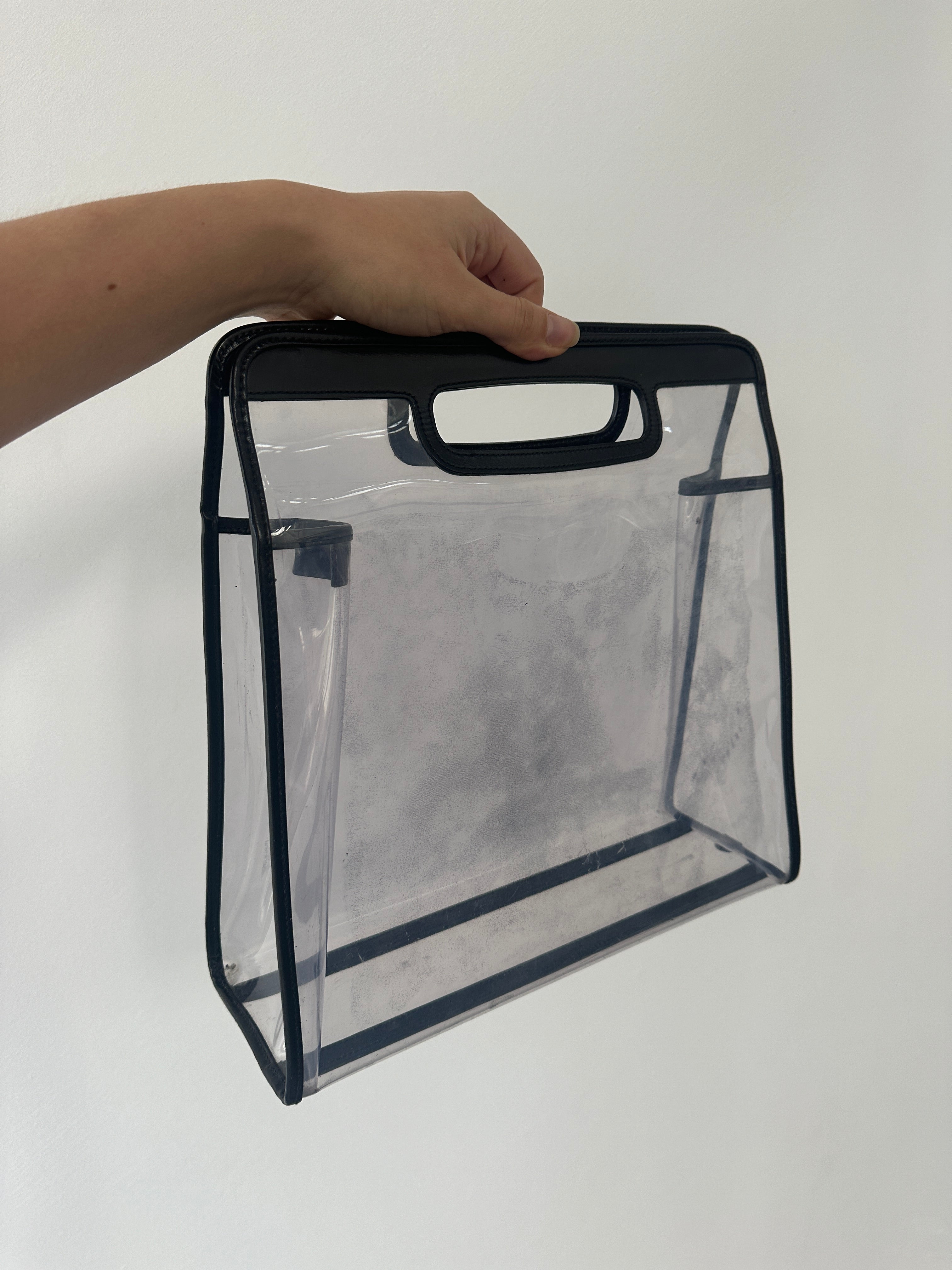 Flaws: inside of leather bag has wear & is peeling, vinyl bag has scratches & ink transfer
