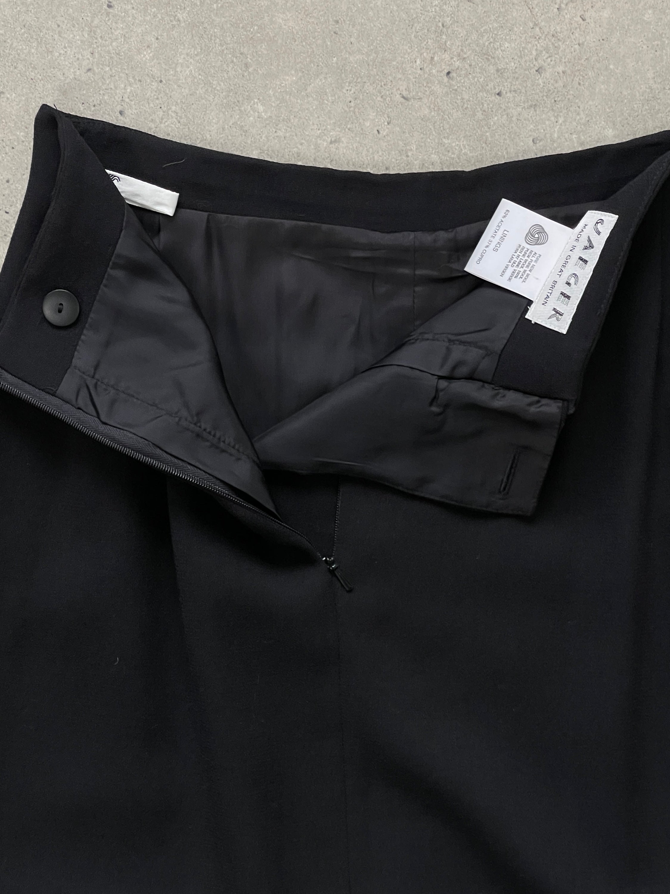 Jaeger full length maxi skirt in deep black pure new wool with a clean straight silhouette and central split. Designed with a subtle double layered front panel that creates soft movement through the hem, offering refined 1990s minimal tailoring.
