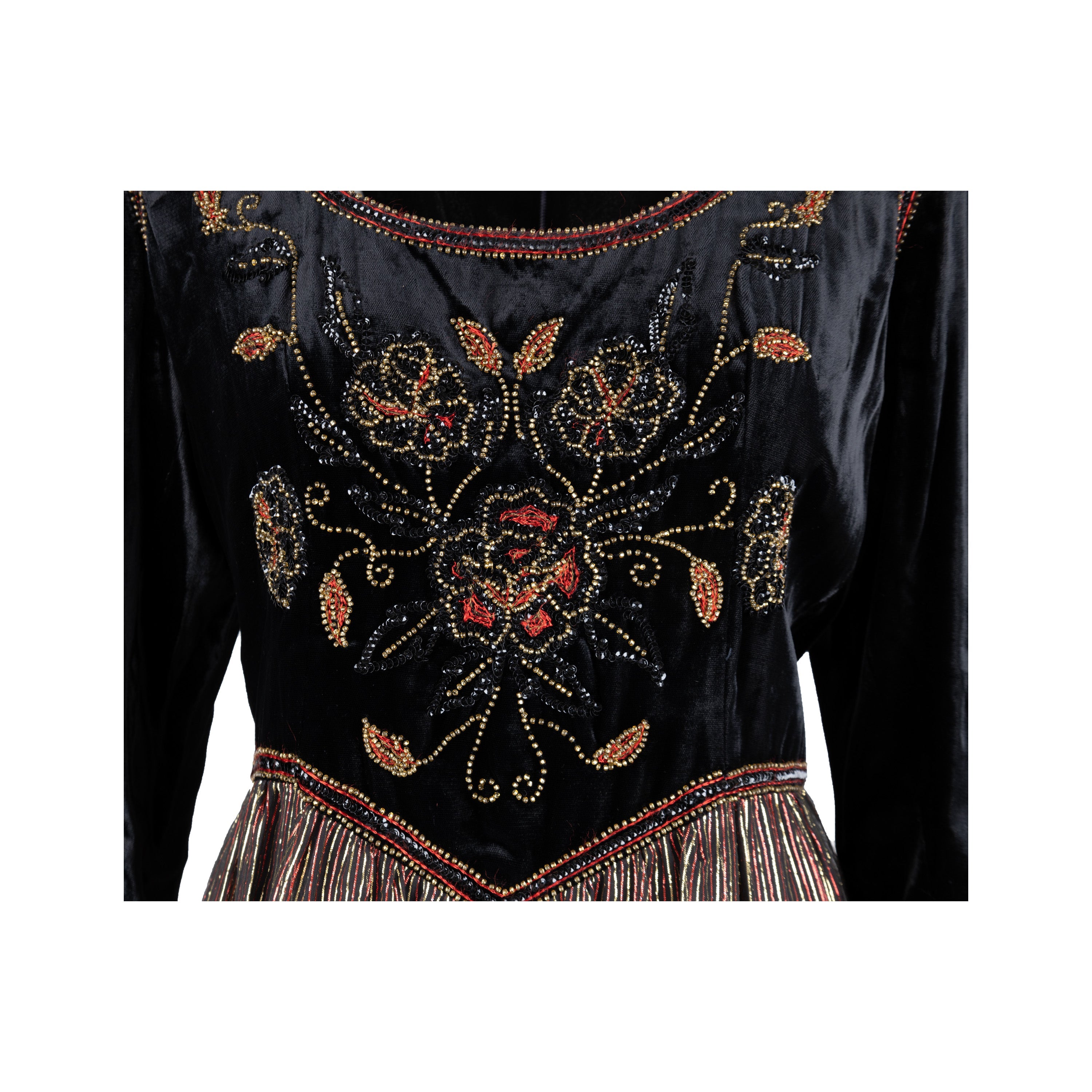 This vintage-style dress from Lancetti is sure to make you feel like the belle of the ball. Crafted using a combination of black velvet and sheer shimmer fabric, it is embellished with multicolor beads, sequins and threads. Its full sleeve and round neckline provide a flattering silhouette, while the black underskirt ensures extra coverage.