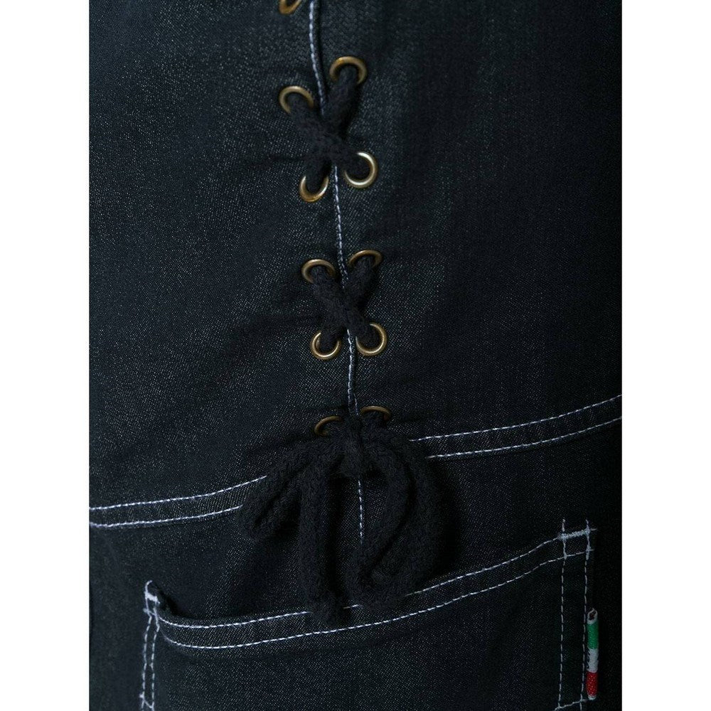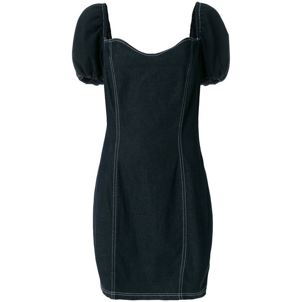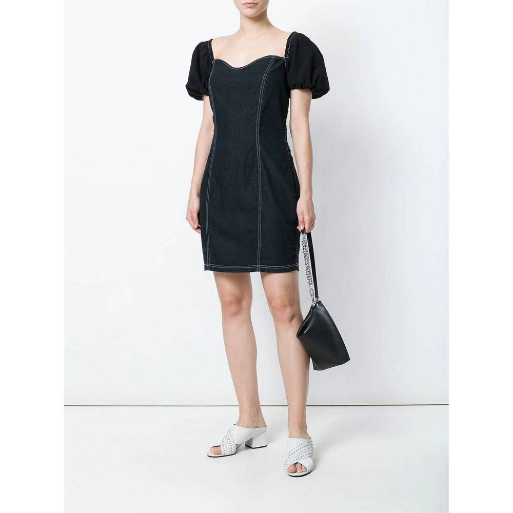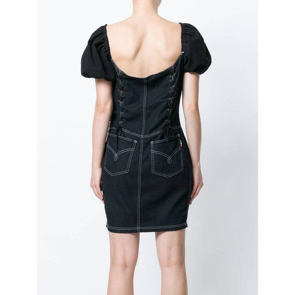 Moschino black cotton blend denim dress with white decorative stitching. Sweetheart neckline, short balloon sleeves and side zip closure. Wide neckline on the back with corset style laces.