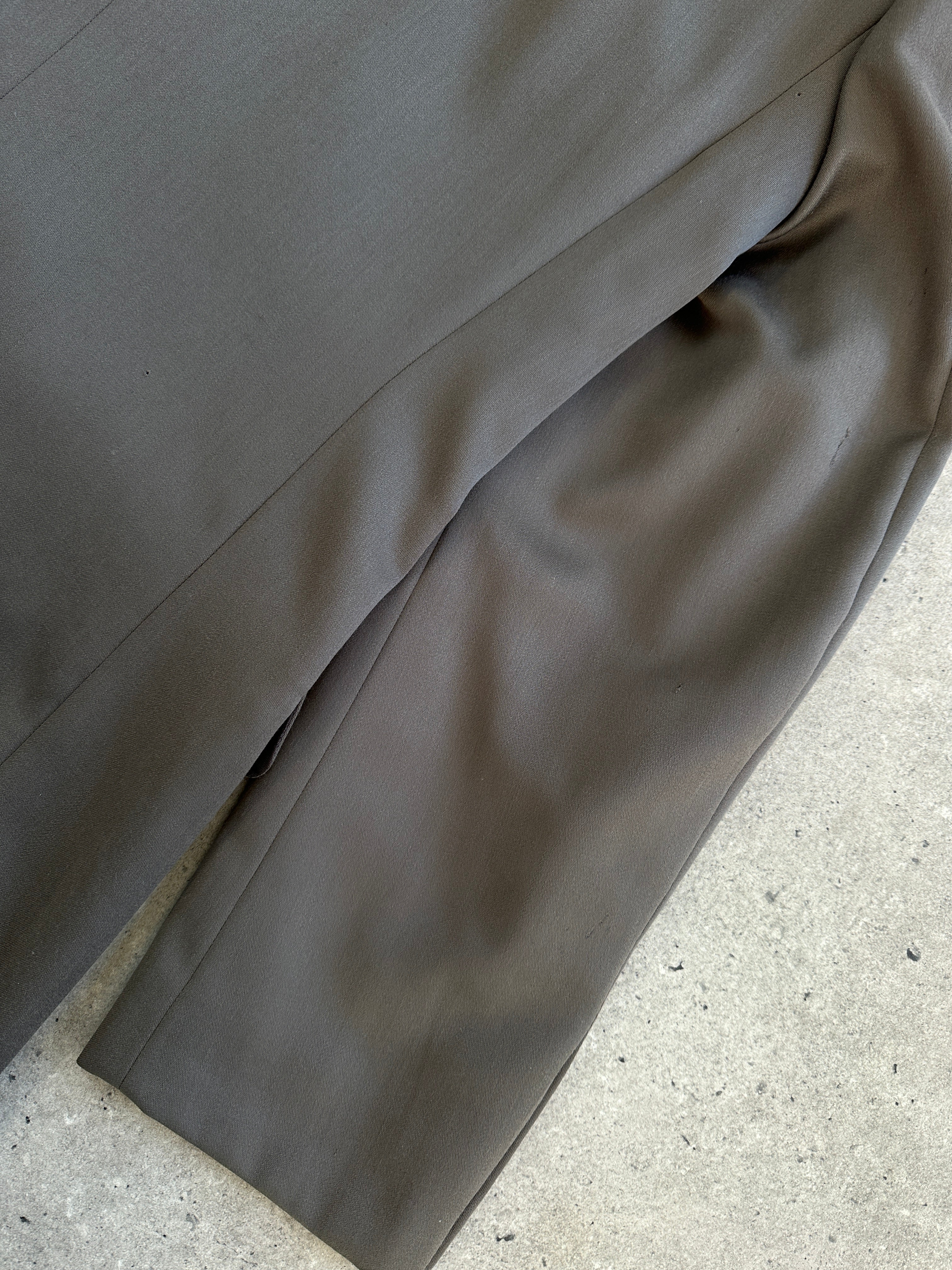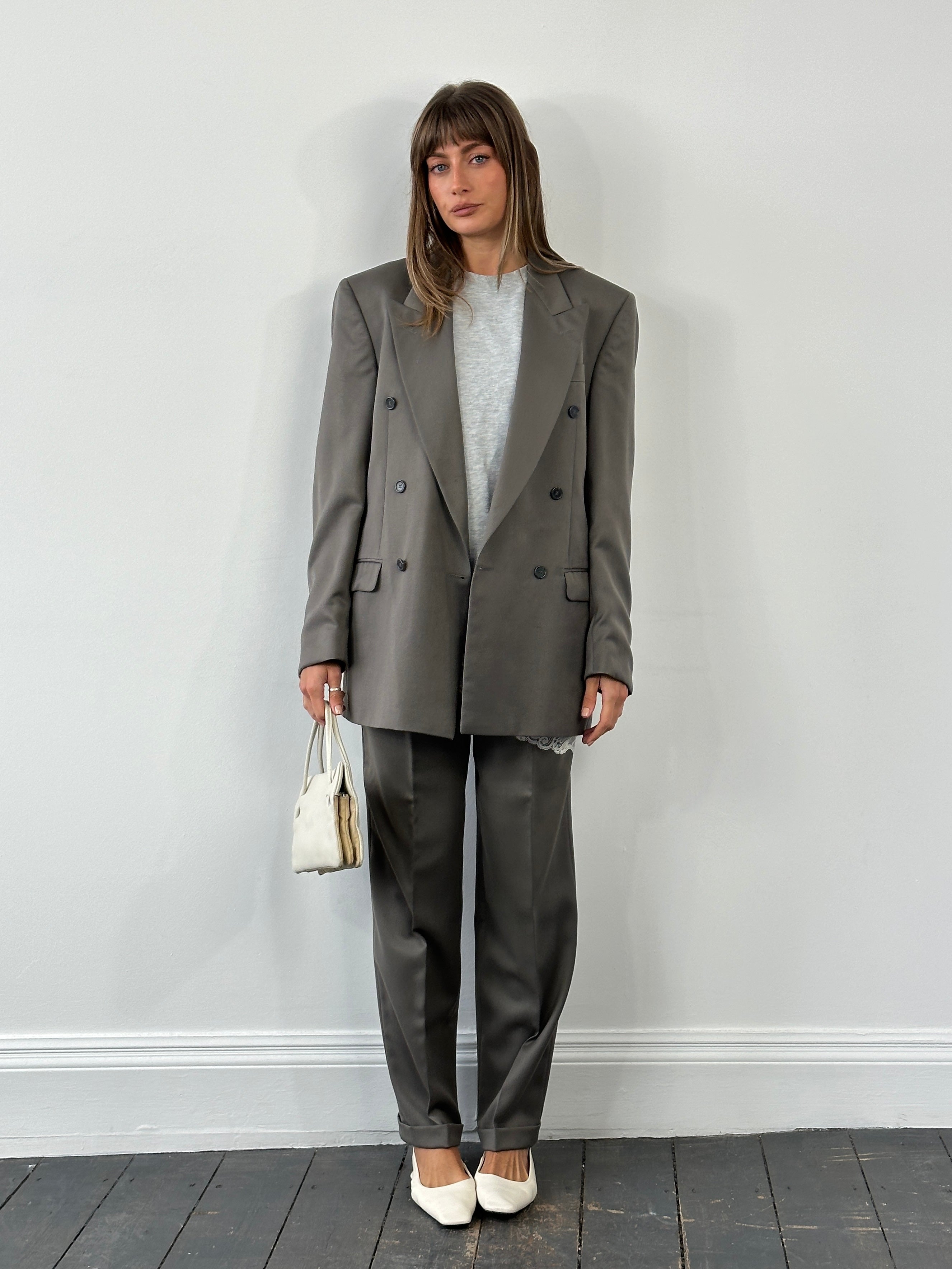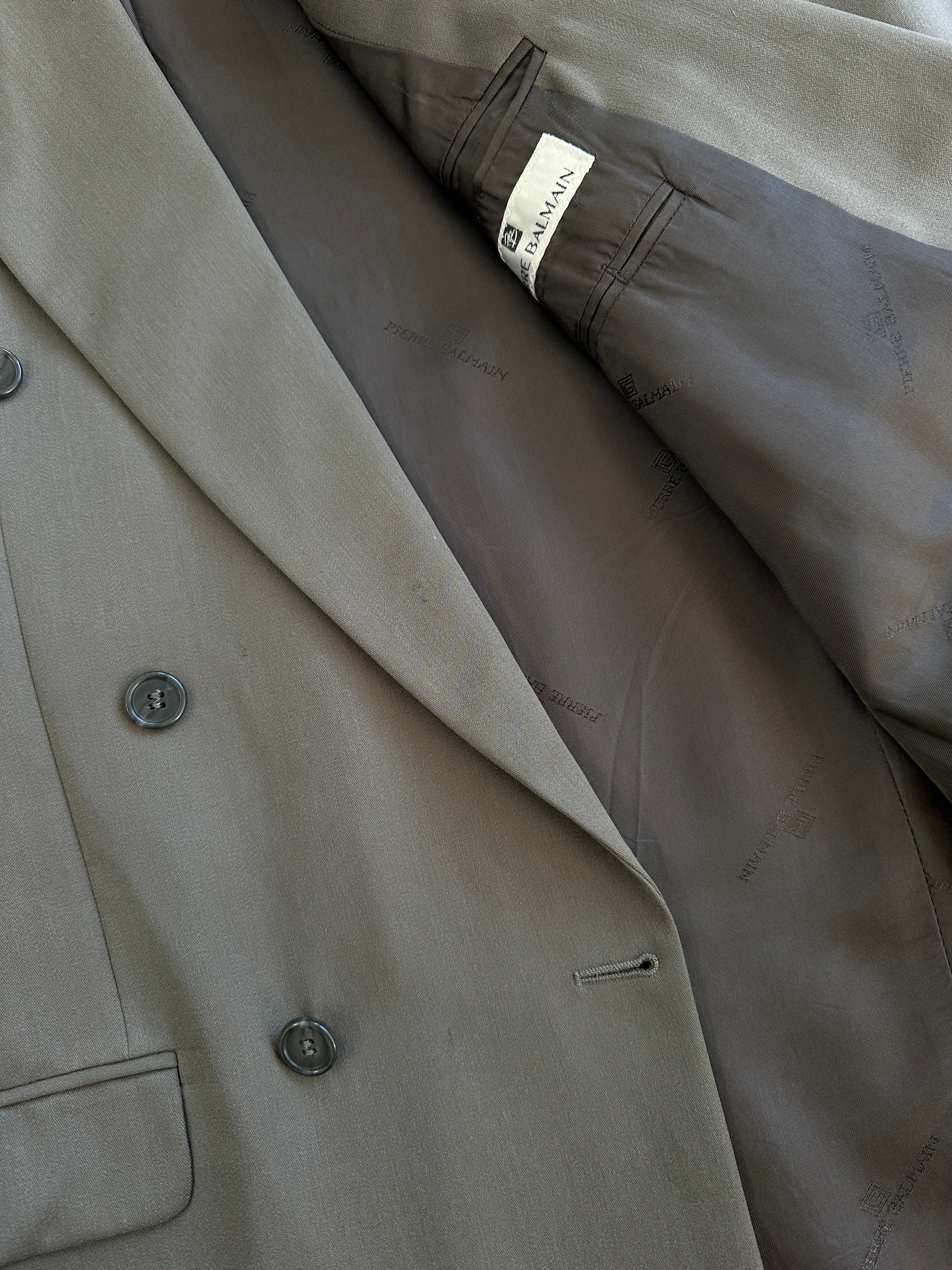 A muted green 1990s Pierre Balmain suit featuring a sharp double-breasted blazer with wide peak lapels and matching pleated trousers. Quiet luxury tailoring with clean Parisian structure and contemporary wearability.