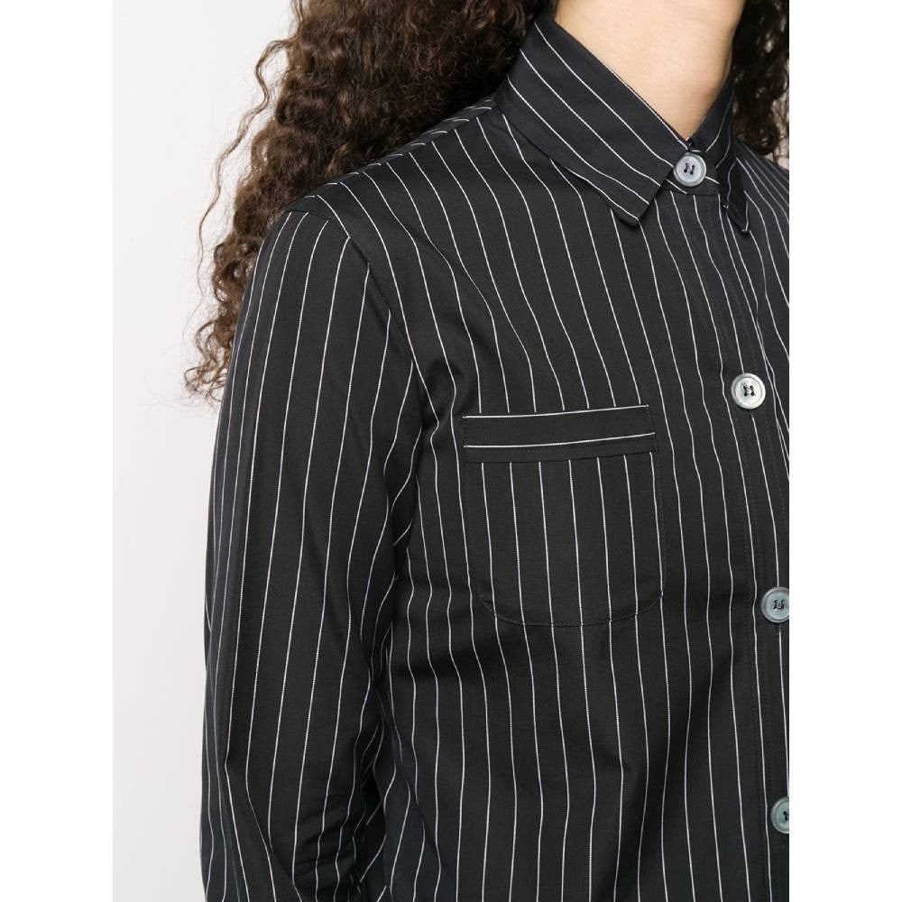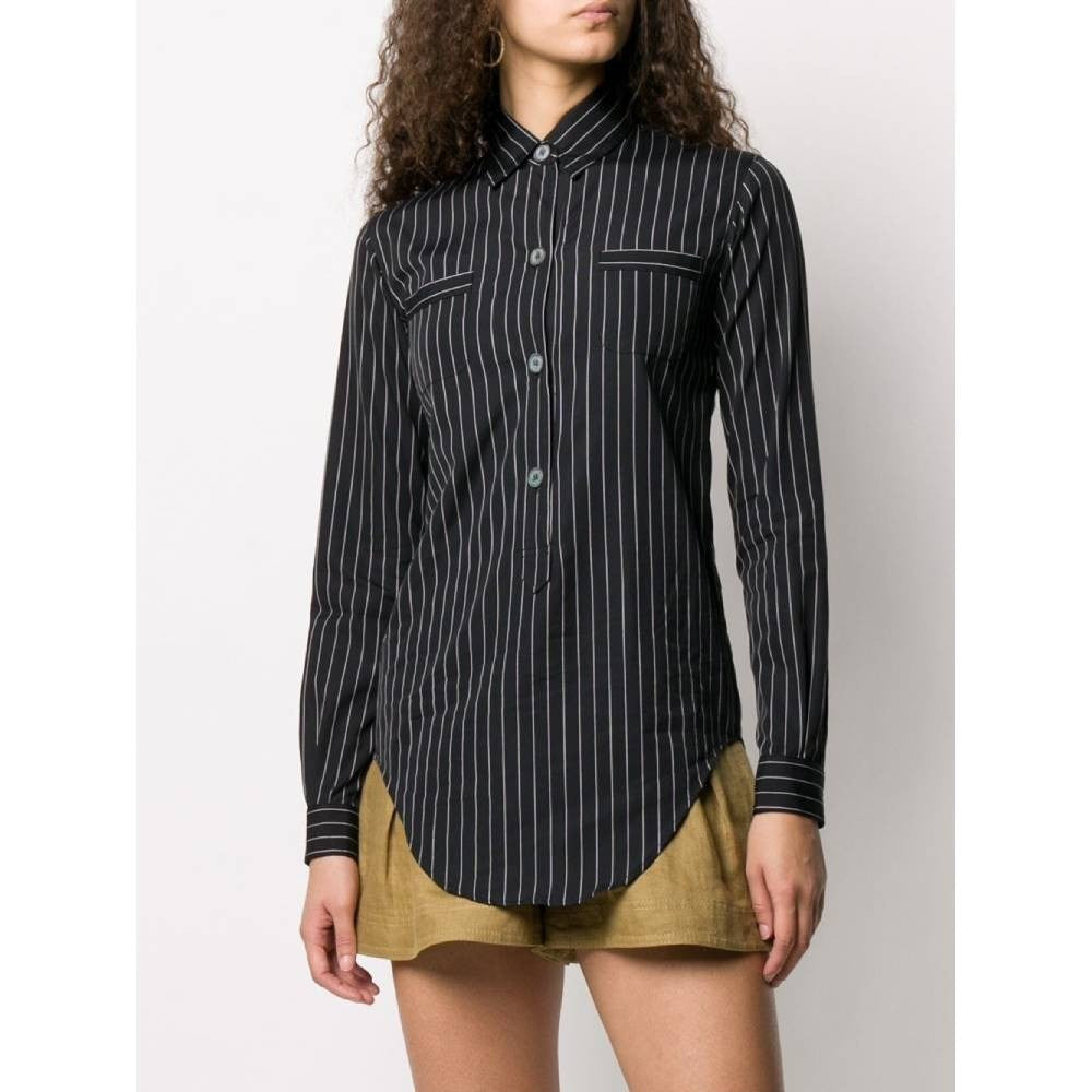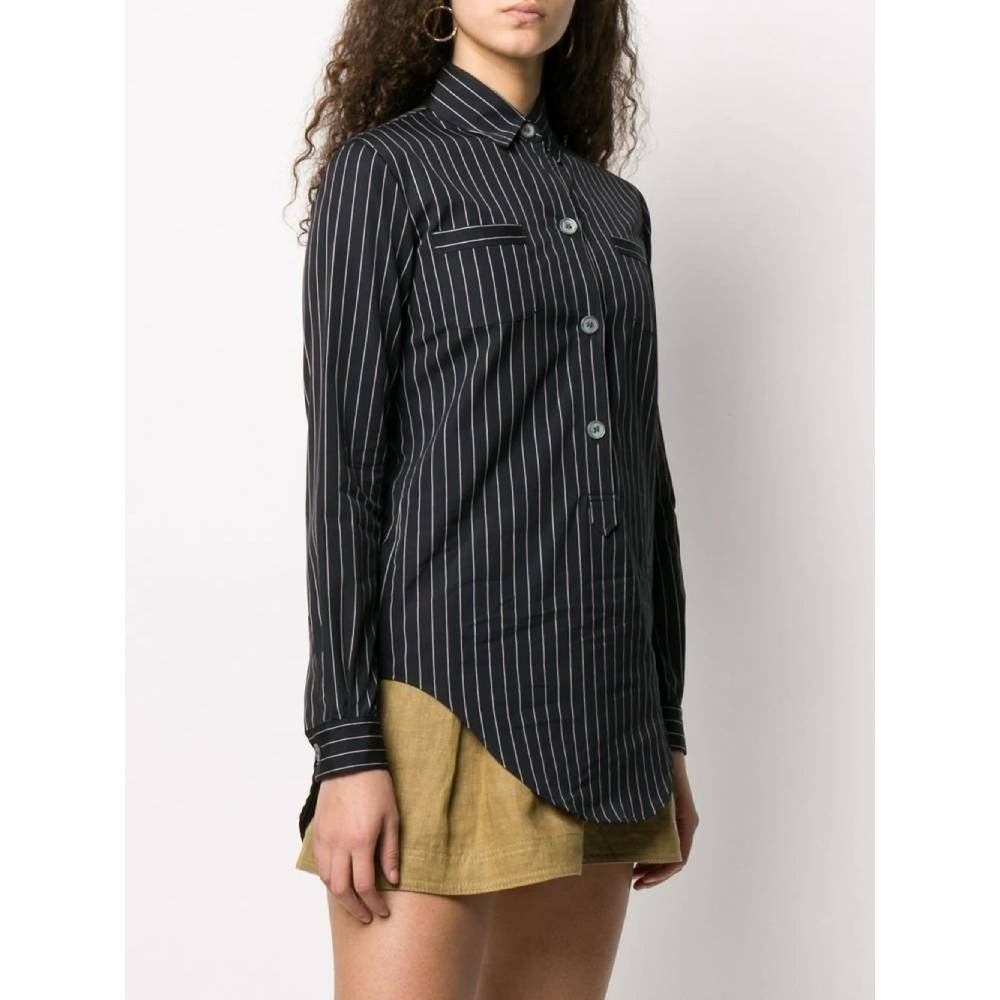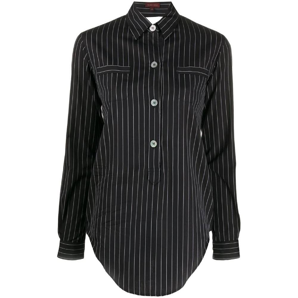 Romeo Gigli black pinstripe shirt. Classic collar and back cut-out detail. Front buttoning, long sleeves, buttoned cuffs and two chest pockets. Curved hem.