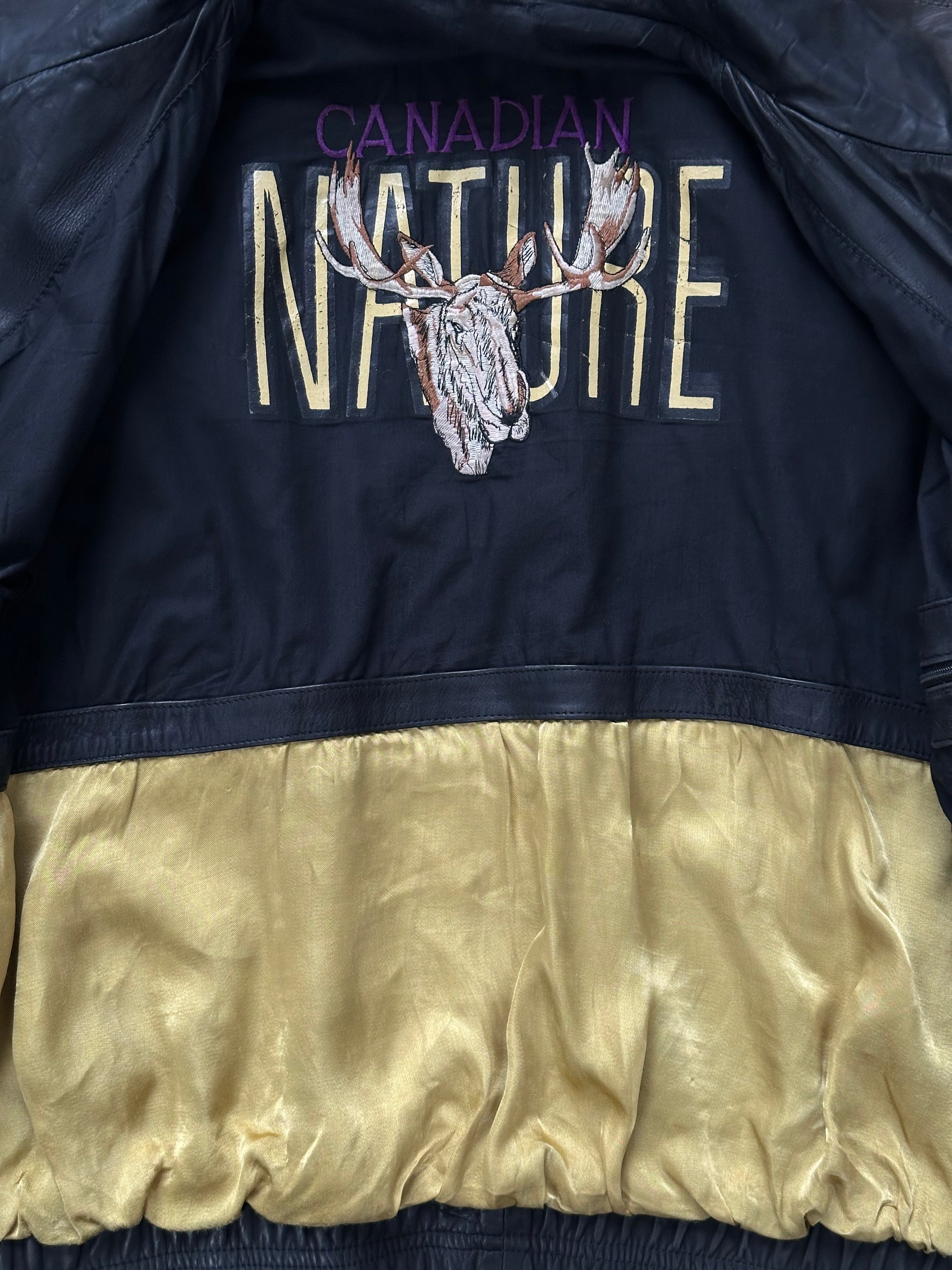 Vintage 1990s brown leather bomber jacket featuring a high neck fastening and subtle fading throughout, giving the jacket a naturally aged, worn finish. The interior is finished with a bold Canadian nature graphic lining and a contrasting yellow lining detail.