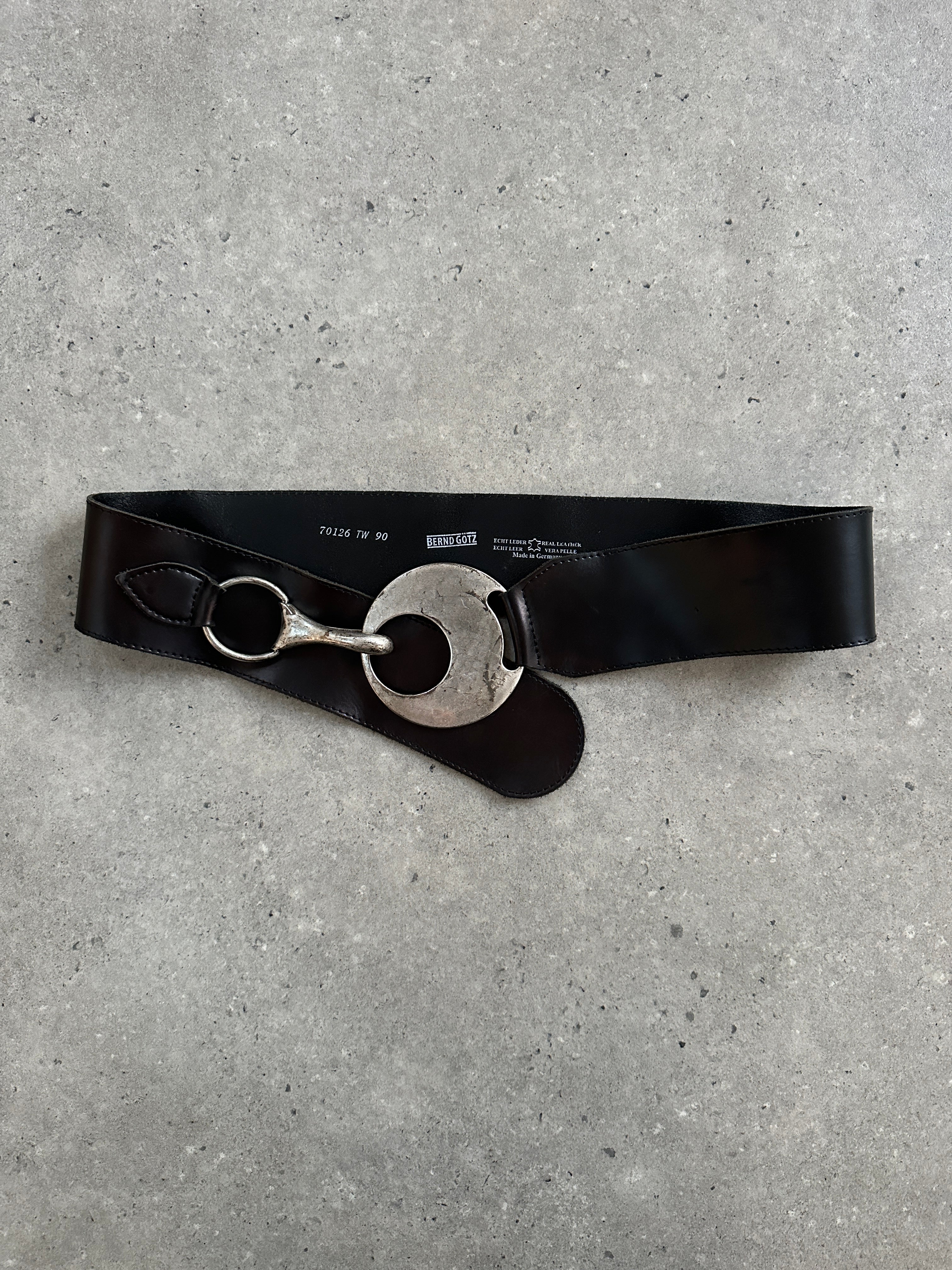 A black vintage 1990s German-made leather belt featuring sculptural silver hardware, minimal shaping and a softly structured silhouette.