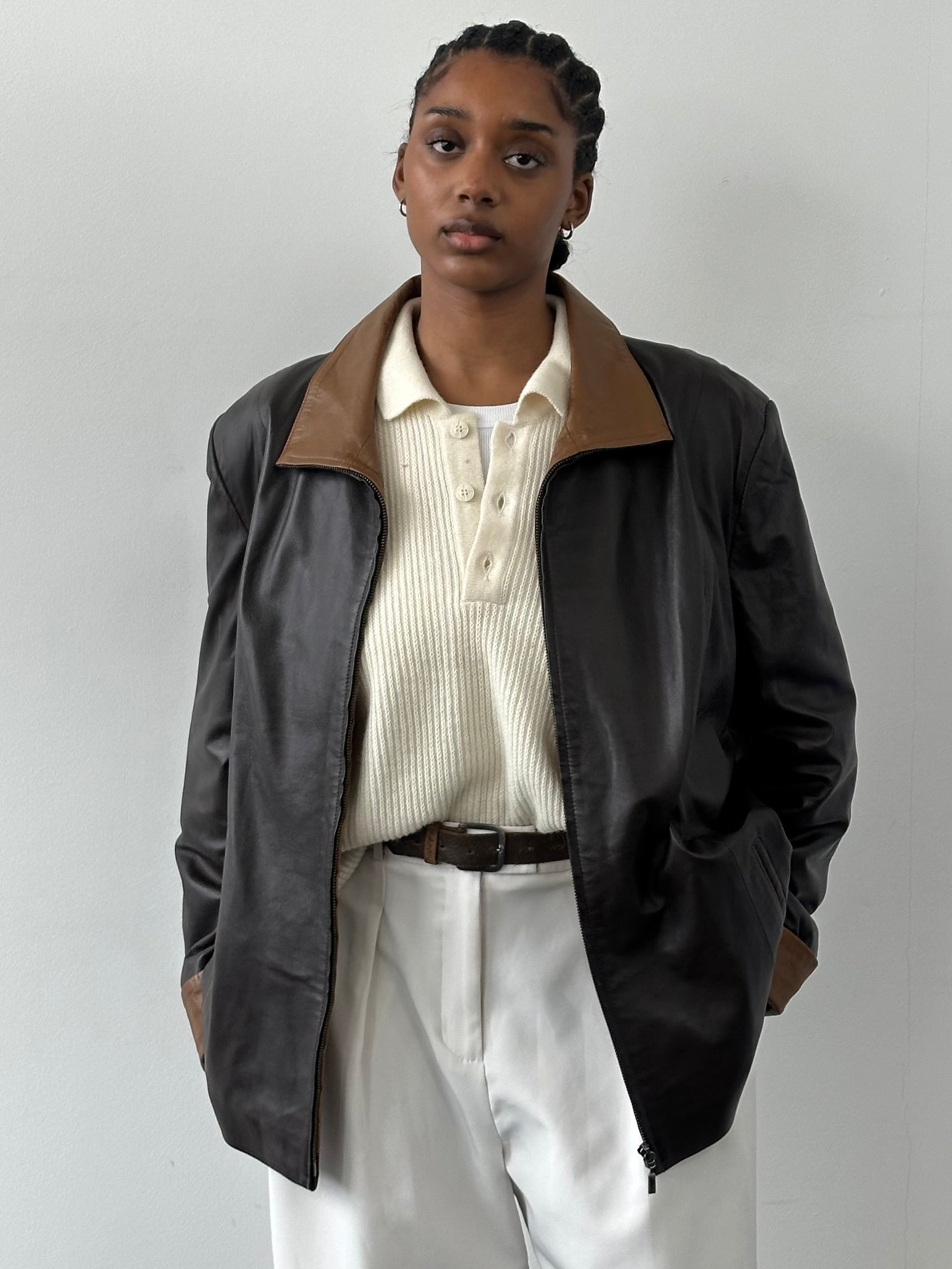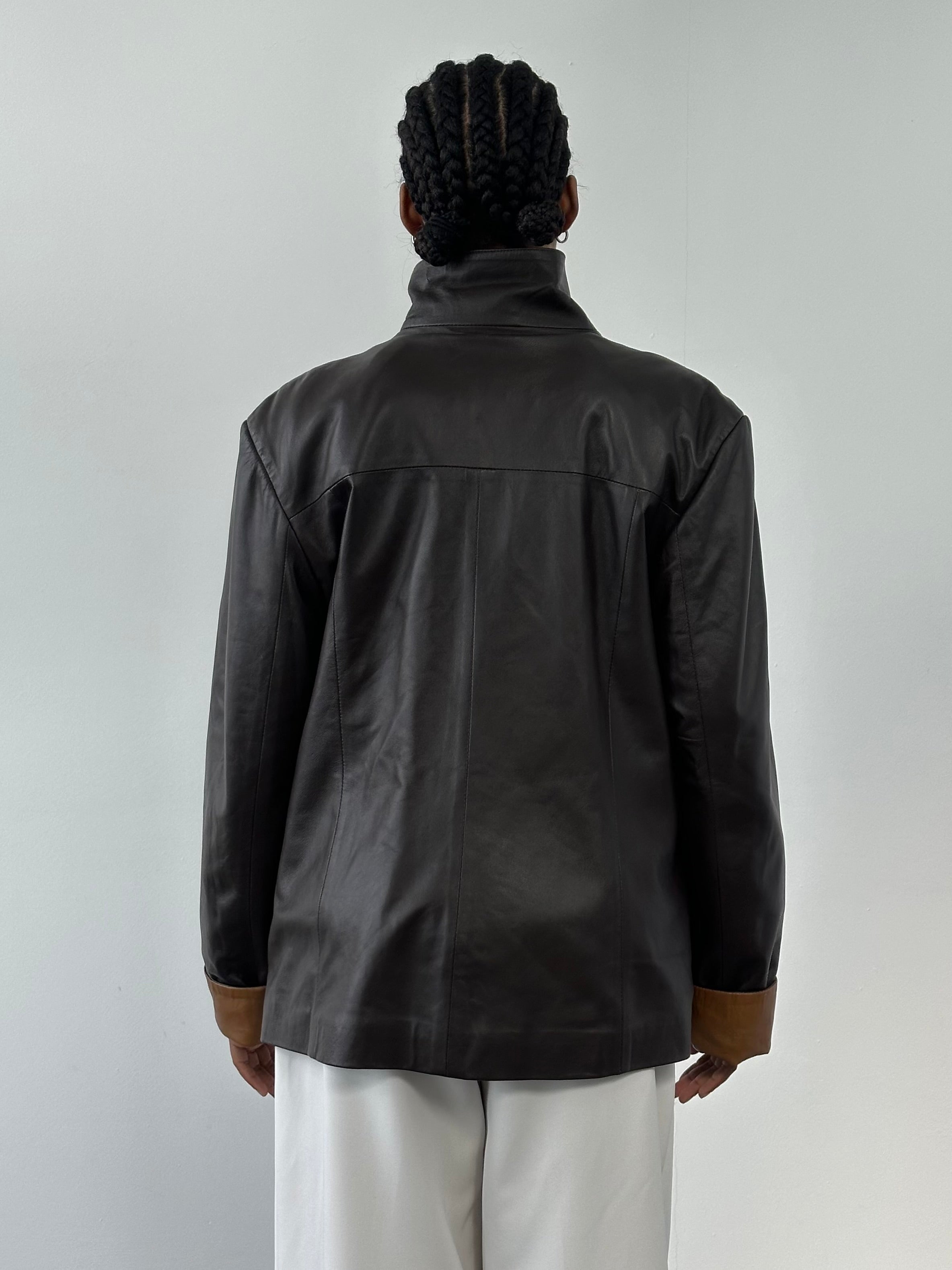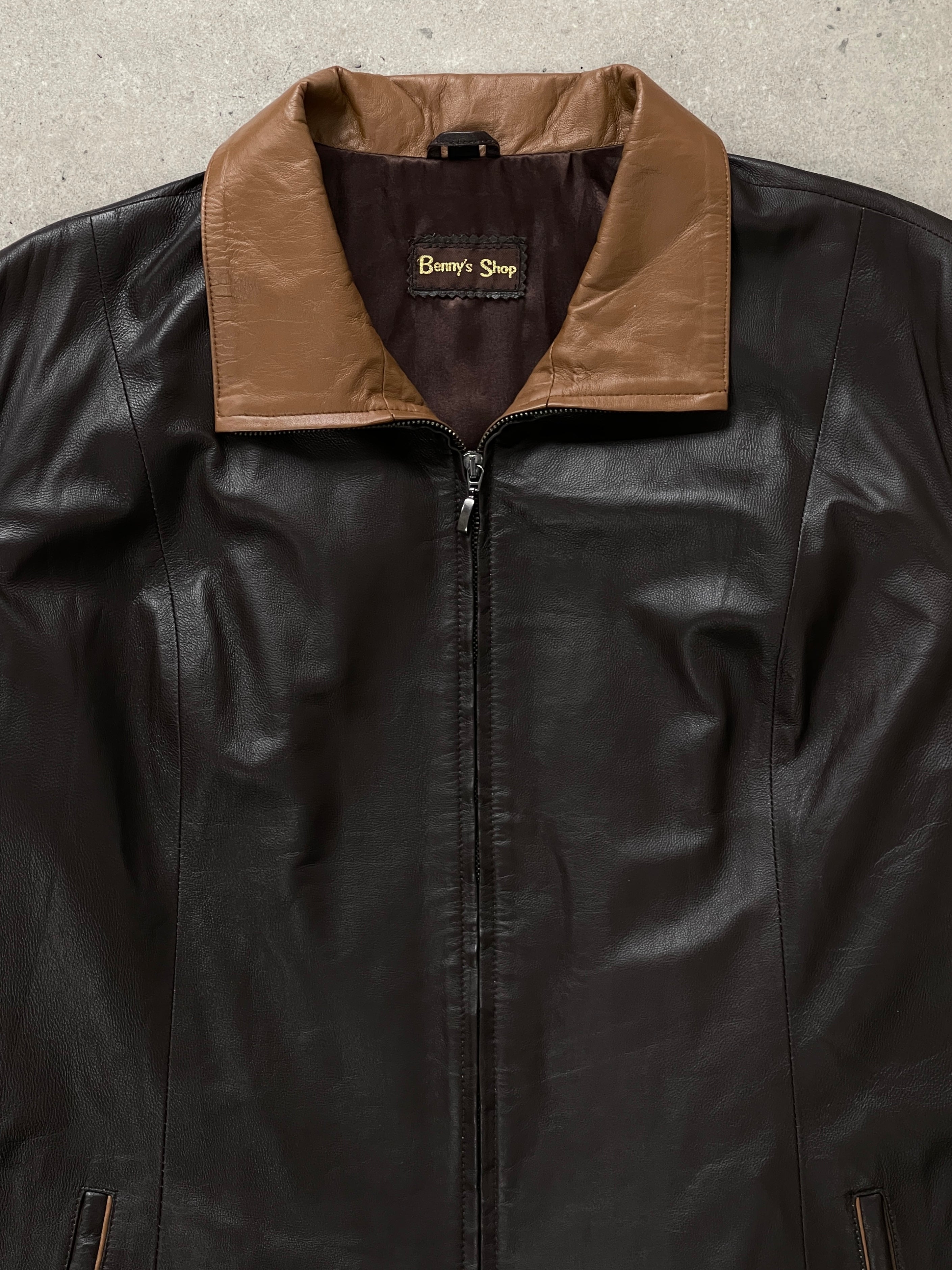 Benny's Shop 1990s vintage soft leather jacket in deep brown with contrasting tan high neck leather collar and cuffs. Features a clean zip front silhouette with the option to wear the collar hidden when fully zipped or styled open for contrast detail.