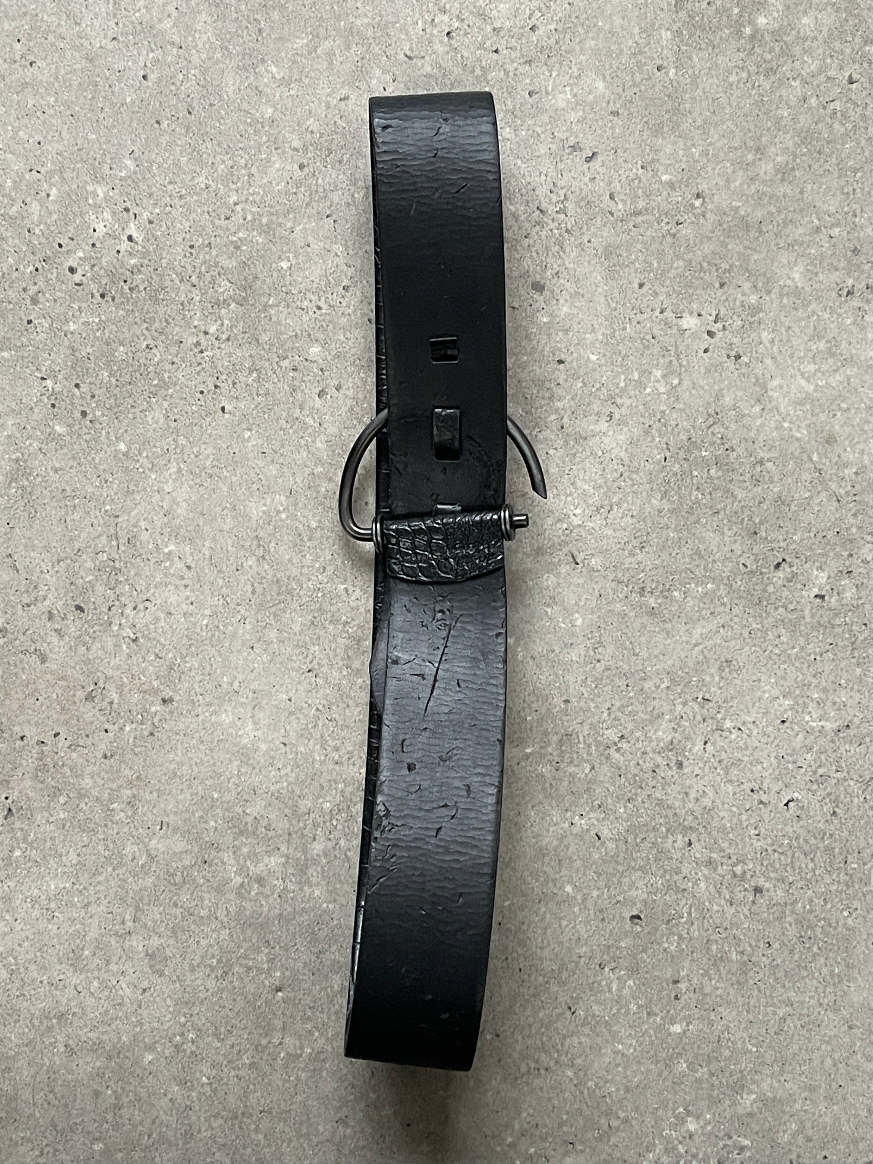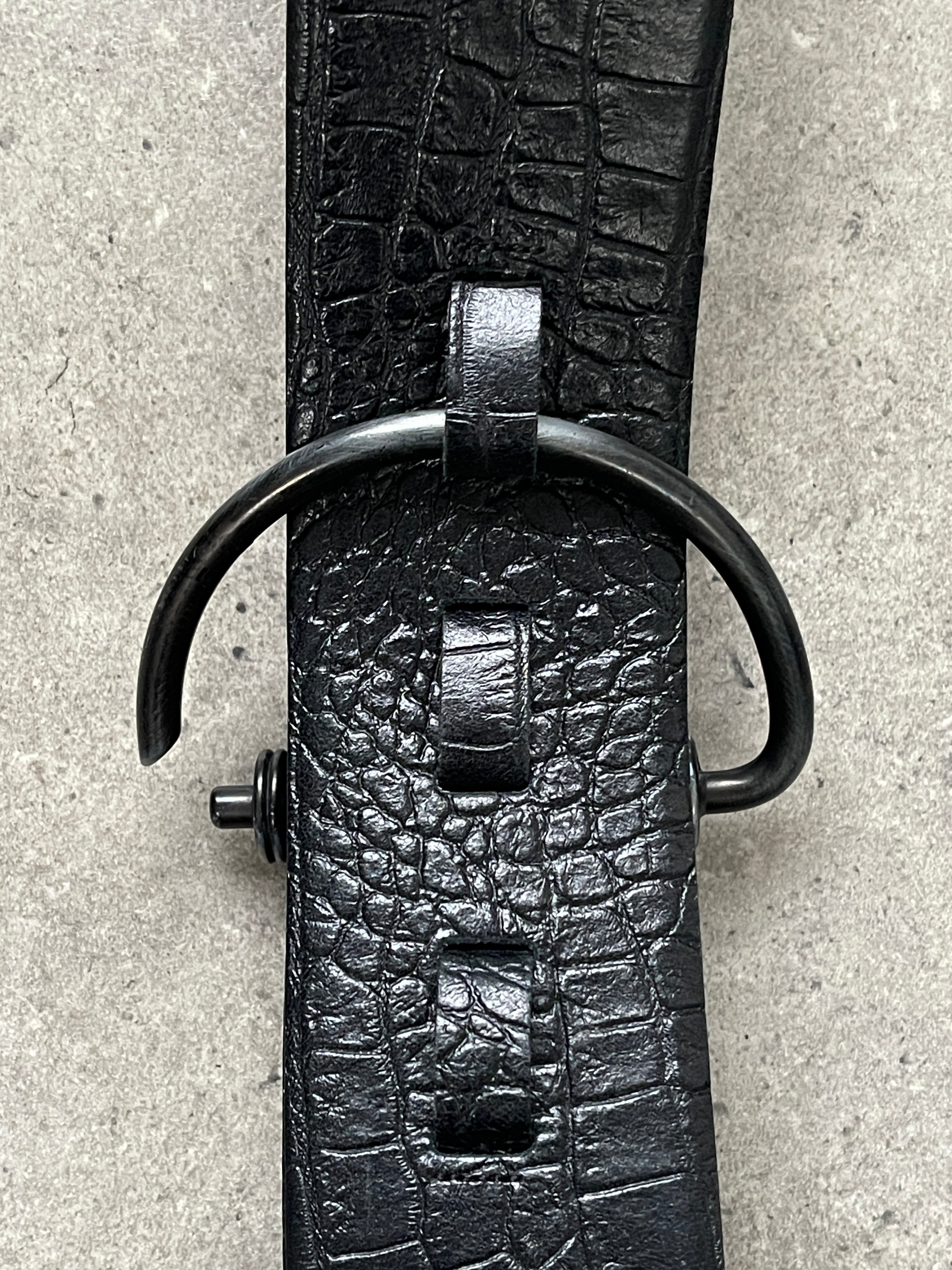 Vintage black leather belt by Stephen Collins featuring a chunky profile with croc embossed texture and a brushed metal D ring buckle. A strong statement accessory designed to sit comfortably at the waist or hip with a structured, utilitarian feel.