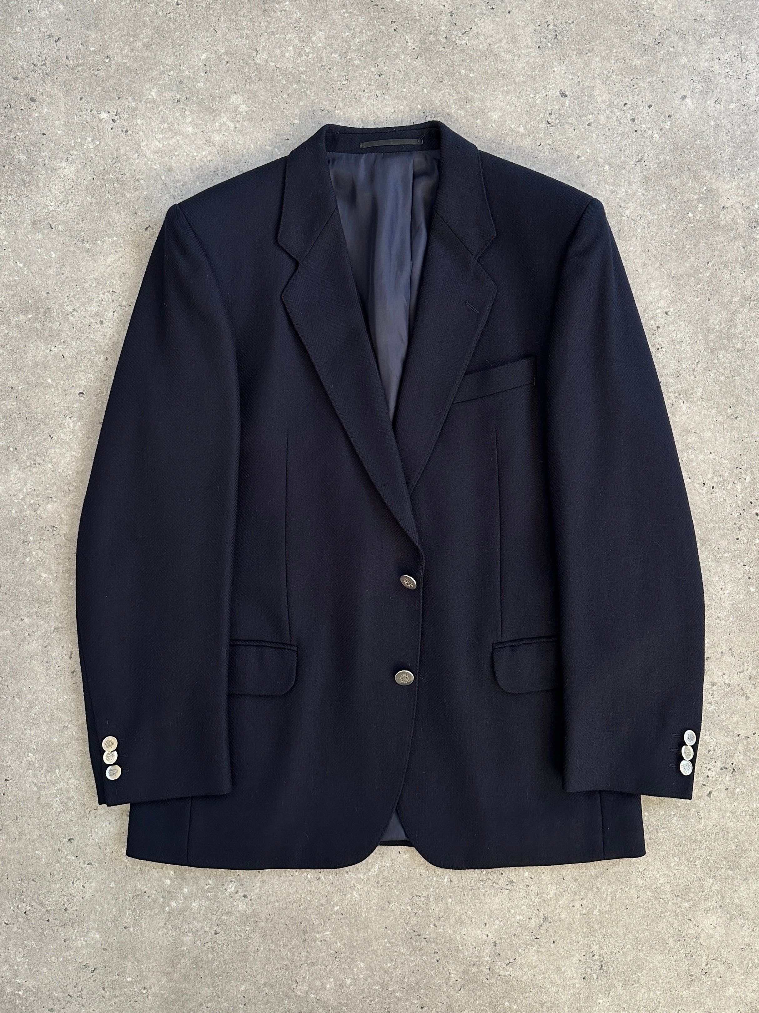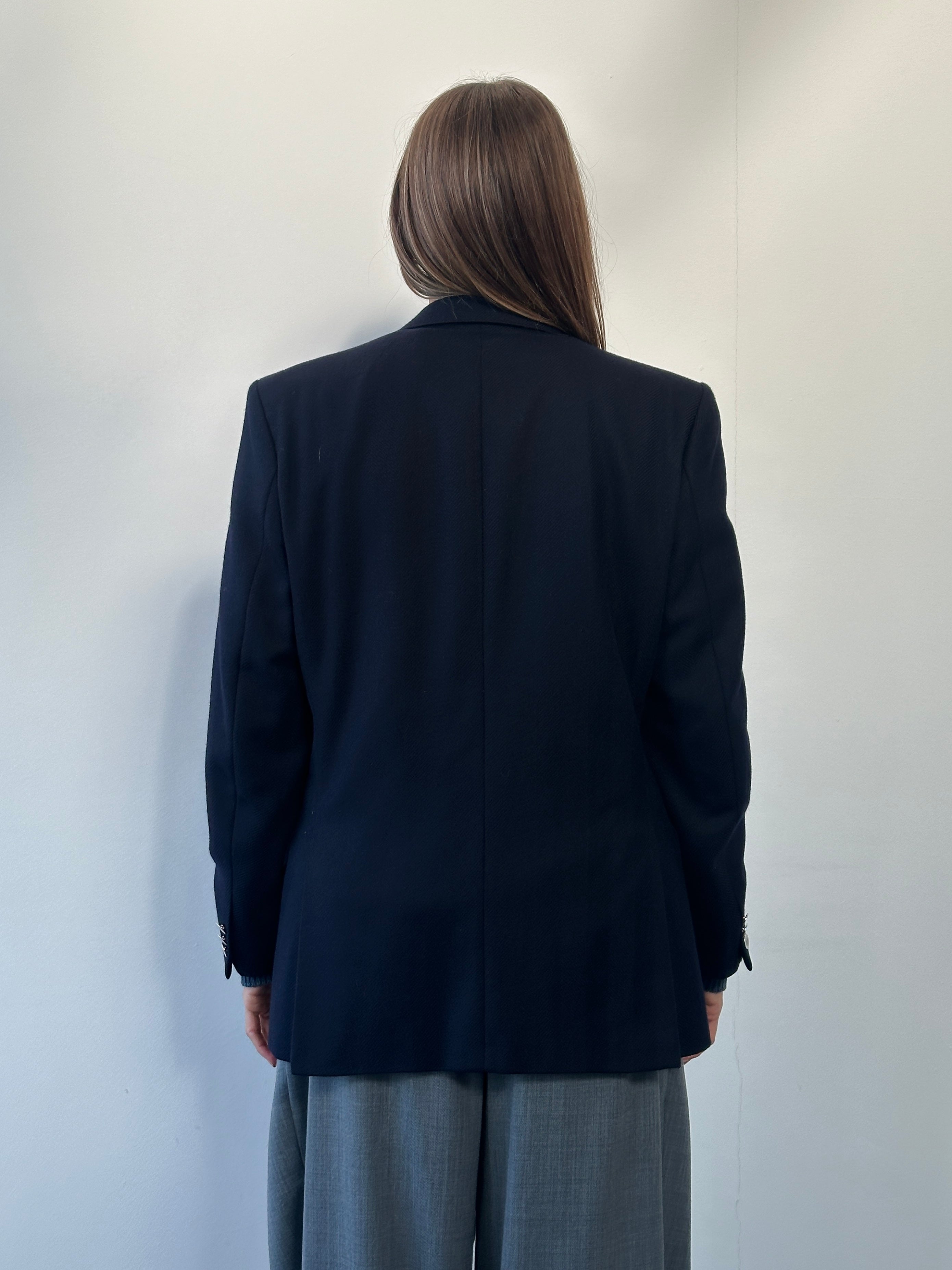 Vintage 1990s navy pure wool single breasted blazer with bespoke silver metal crest buttons and clean structured tailoring. A refined Swiss-made piece with a timeless minimal silhouette.