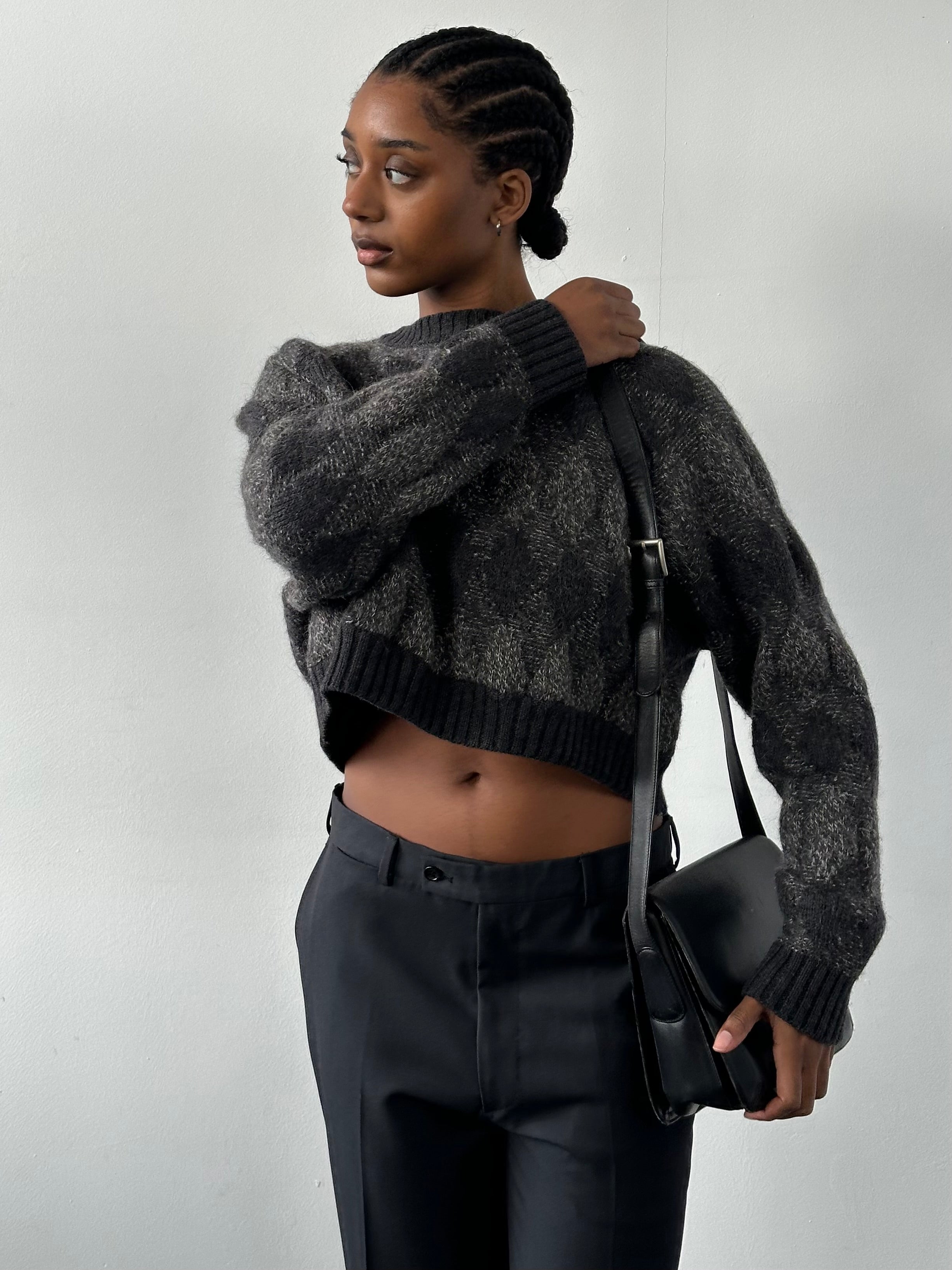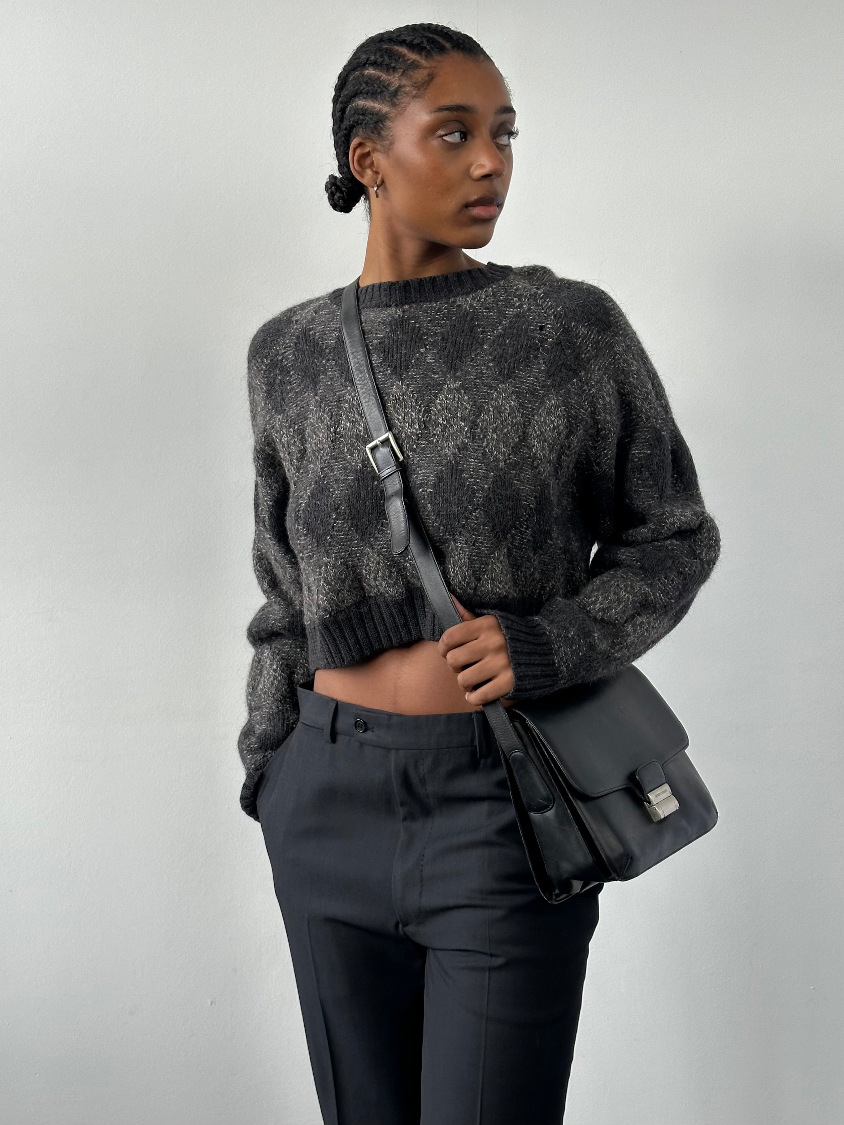 Vintage 1990s cropped jumper in grey with subtle tonal diamond pattern and a soft wool mohair blend texture. Features a relaxed boxy silhouette, ribbed neckline, cuffs and hem with a gently dropped shoulder shape.