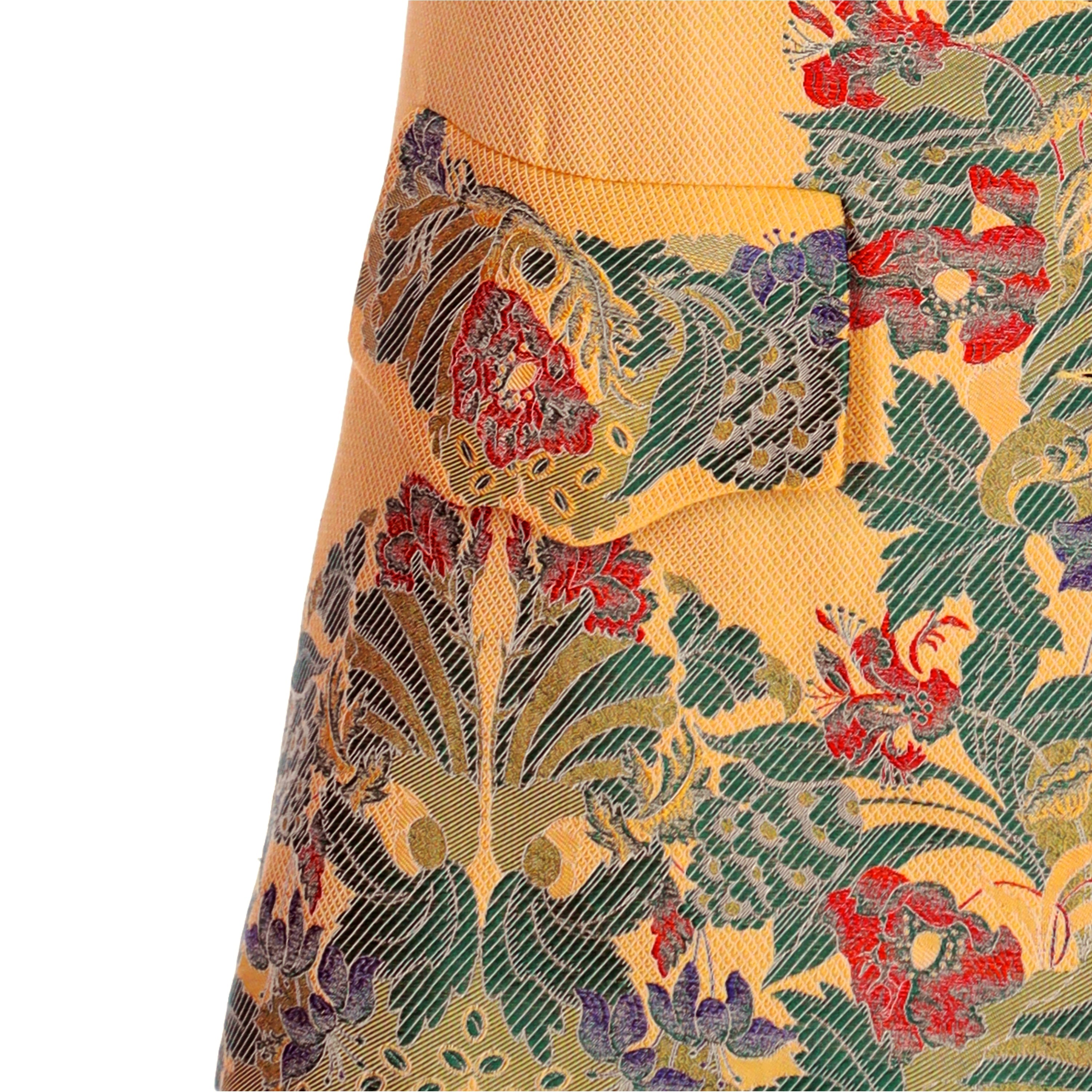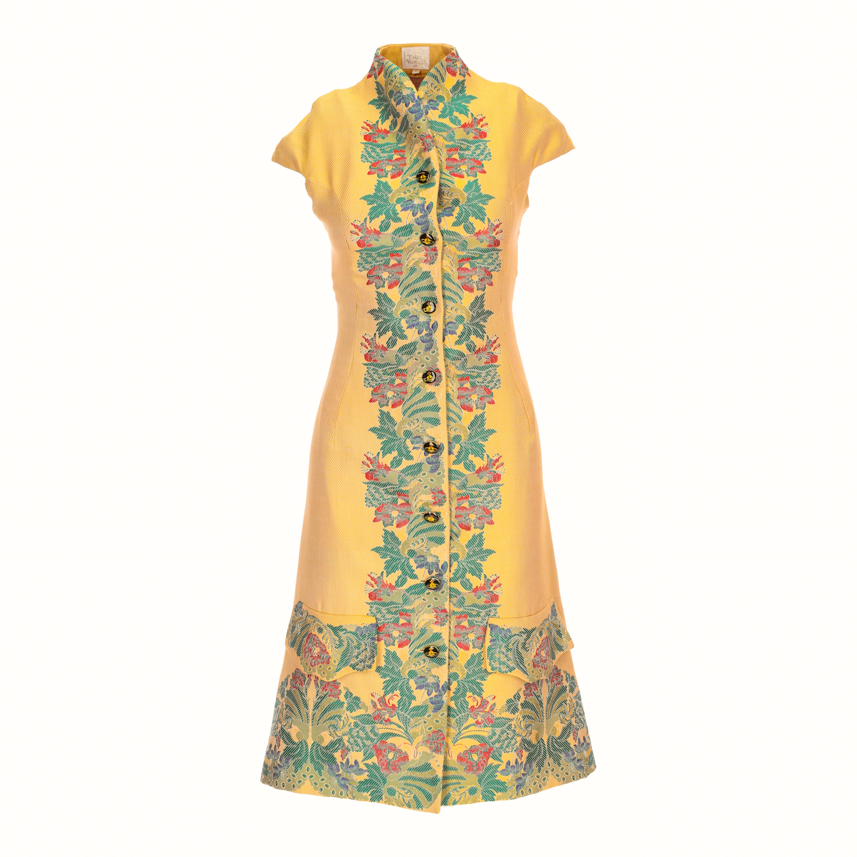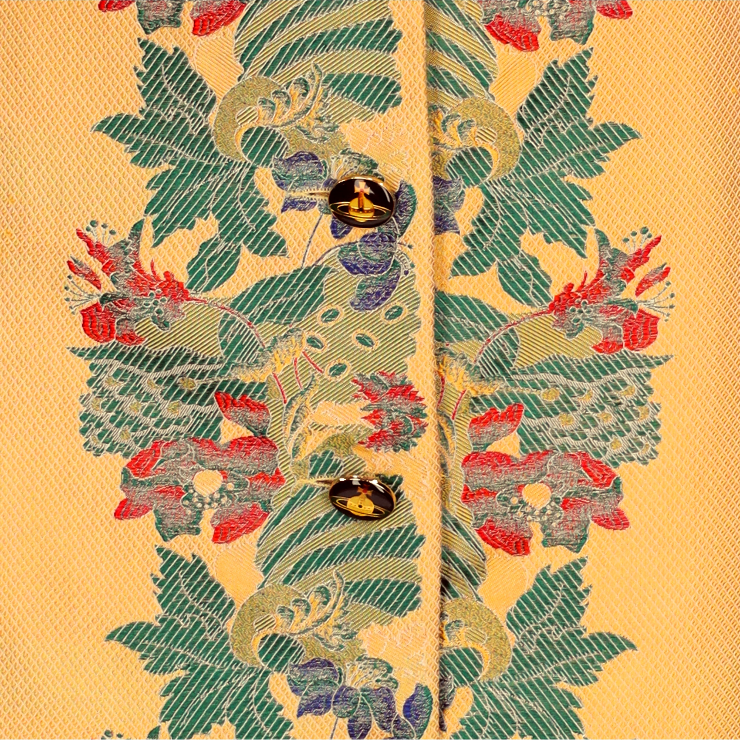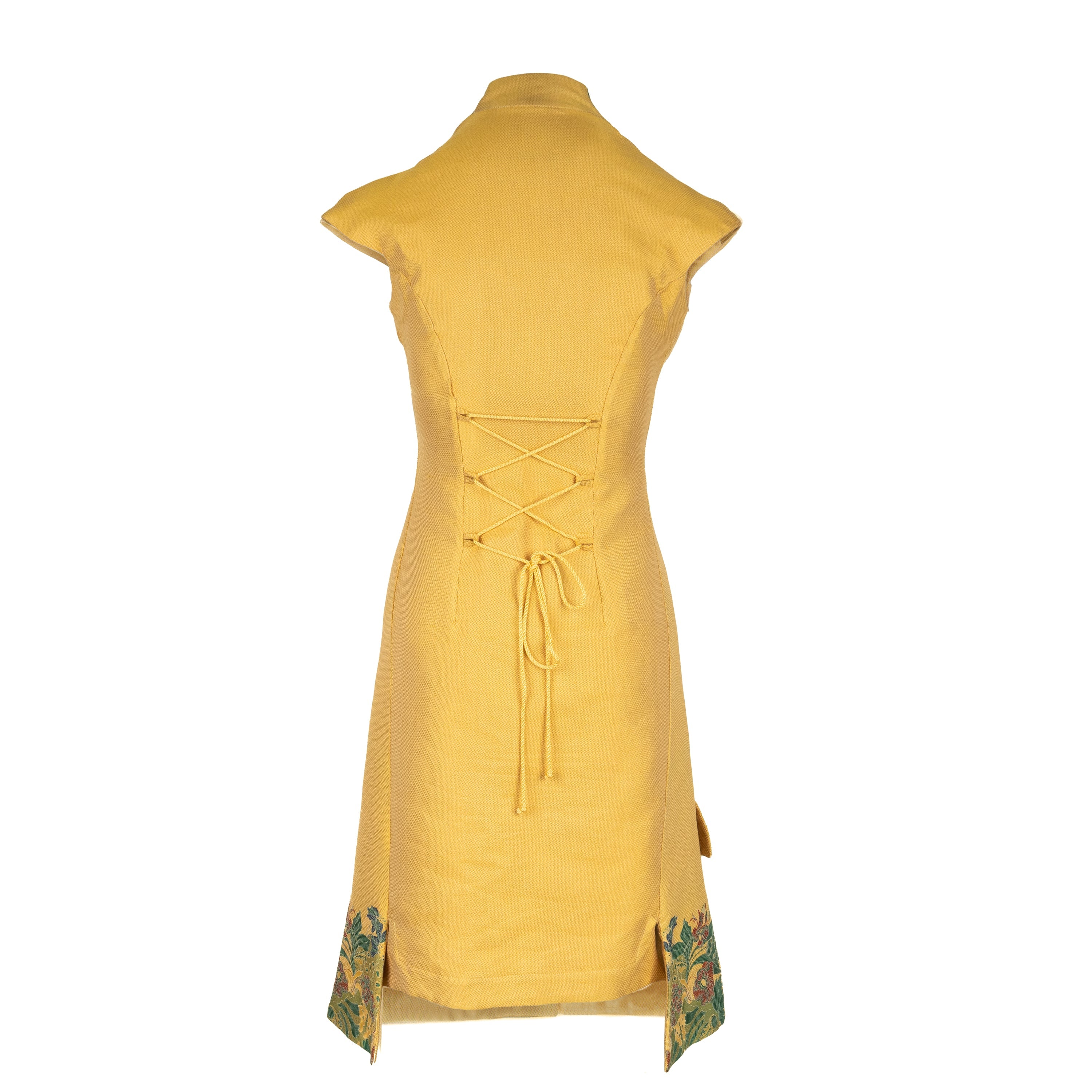 This Vivienne Westwood dress is a rare collectible adorned with embroidered flowers and leaves. It features short sleeves, a high neckline, and enamel buttons with the brand's distinctive orb logo. On the back, the dress can be adjusted with the lace fastening to give a form fitting silhouette.