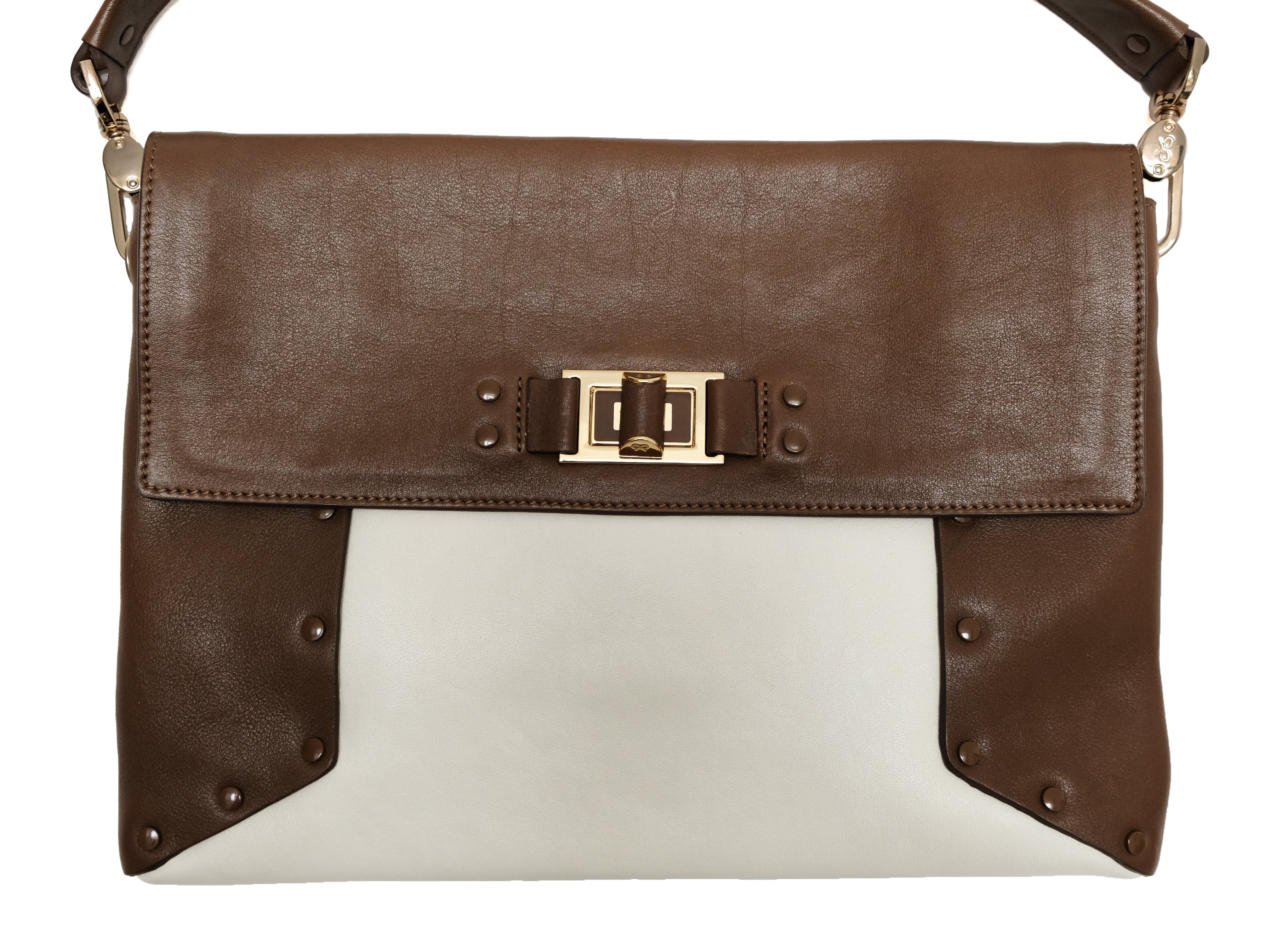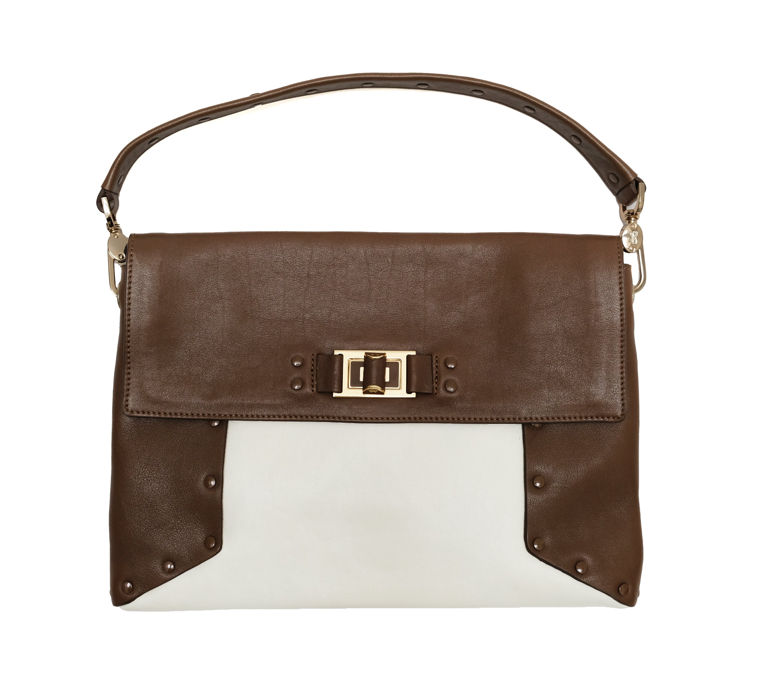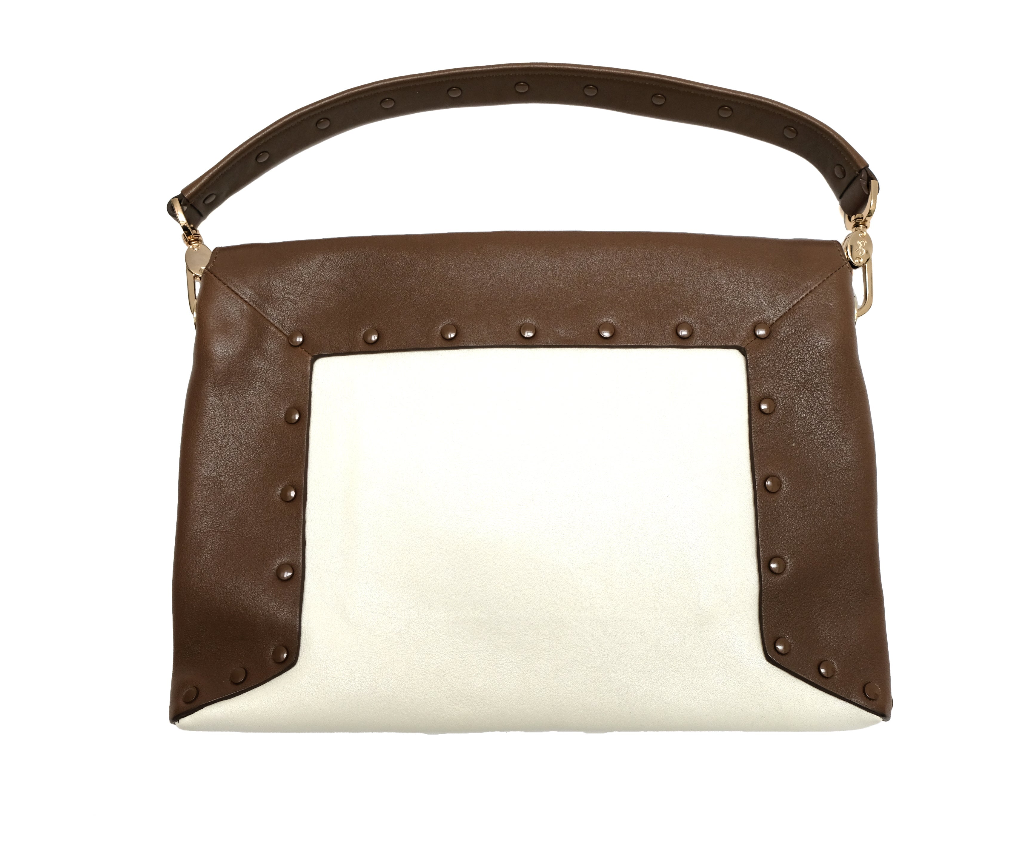 An elegant medium sized shoulder bag by Anya Hindmarch in contrasting panels of soft coffee and cream leather with stud detailing.