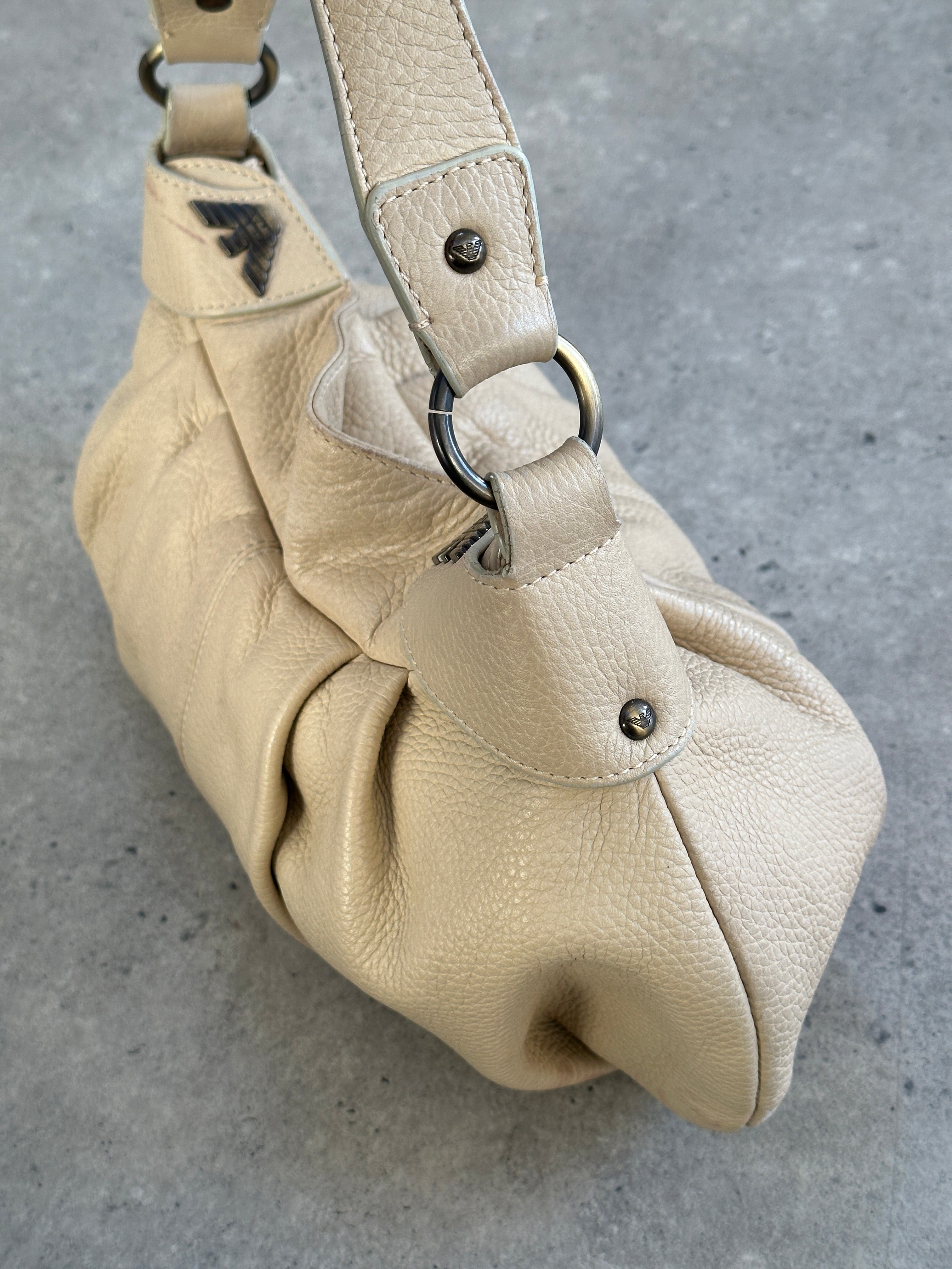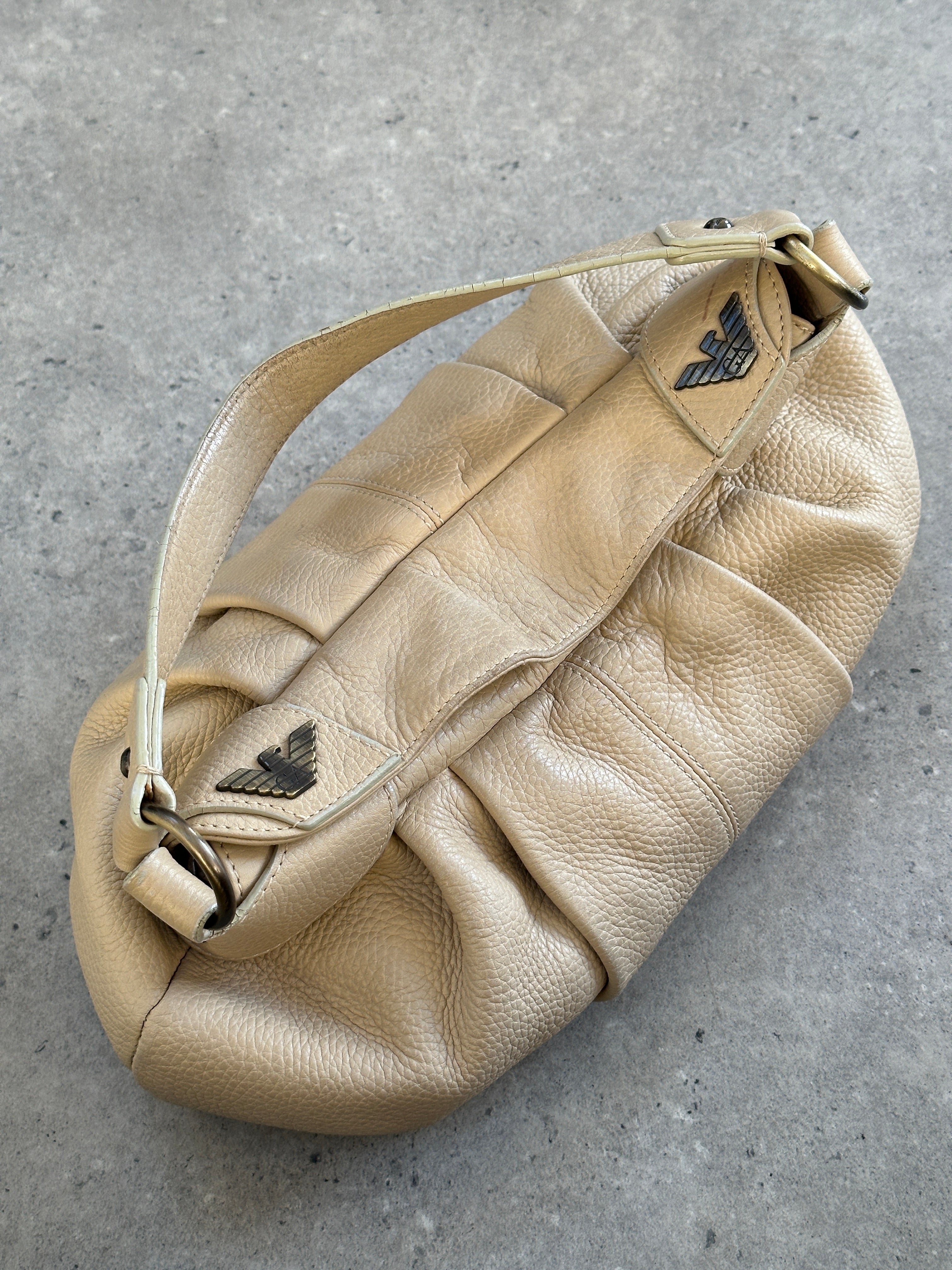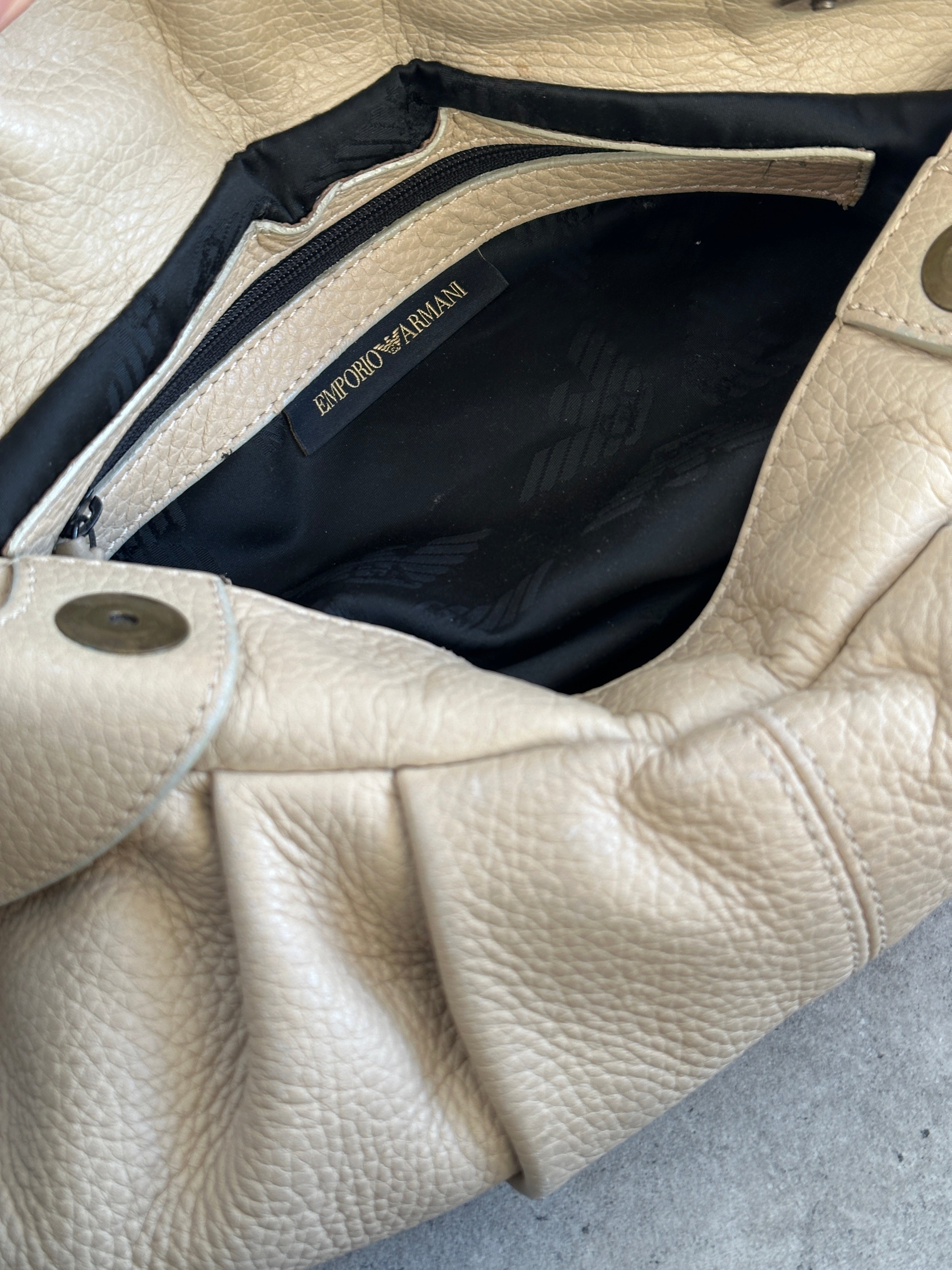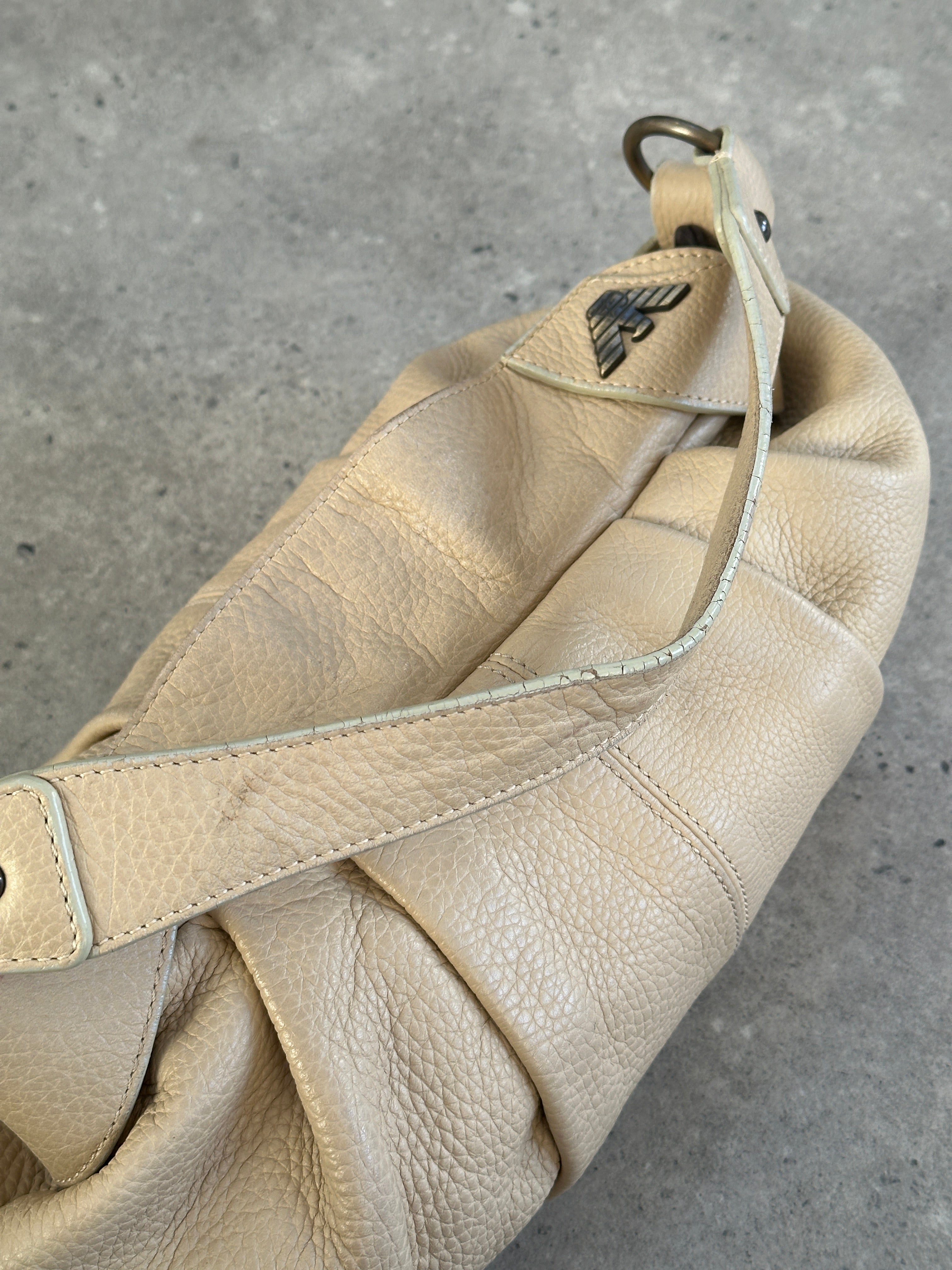 A vintage early 2000s Emporio Armani leather shoulder bag in a soft beige tone with a gently structured, relaxed silhouette. Designed with subtle pleating and a refined minimalist shape that aligns with Armani’s quiet luxury era.