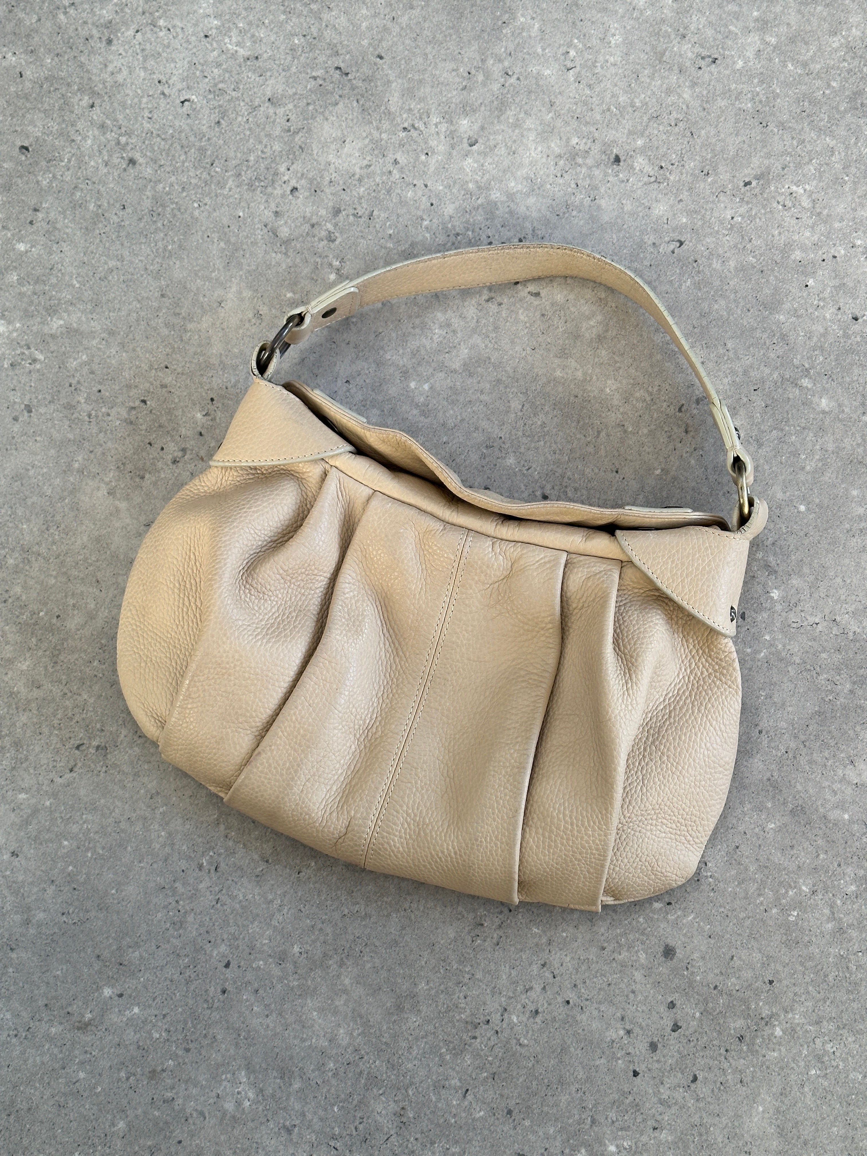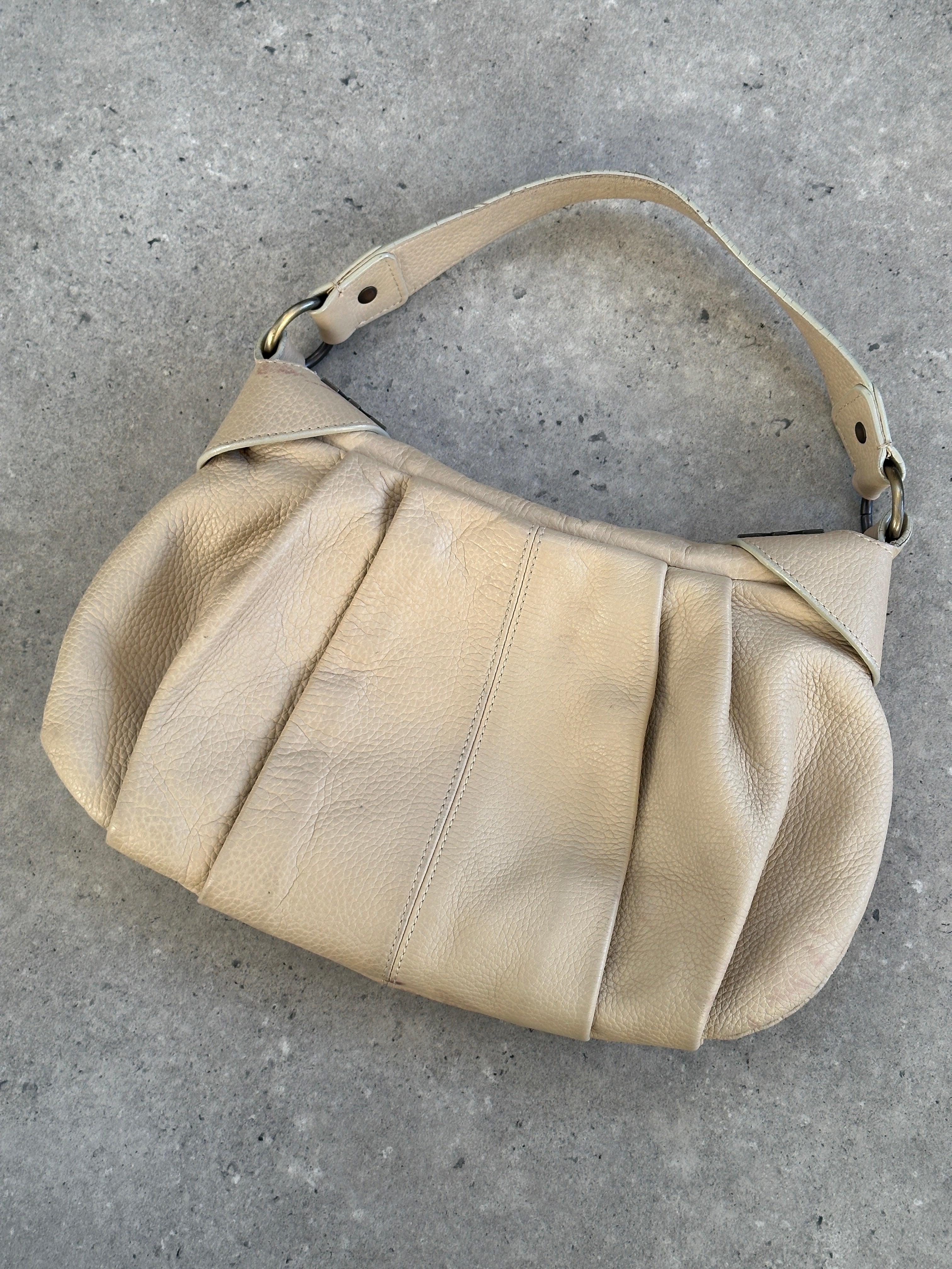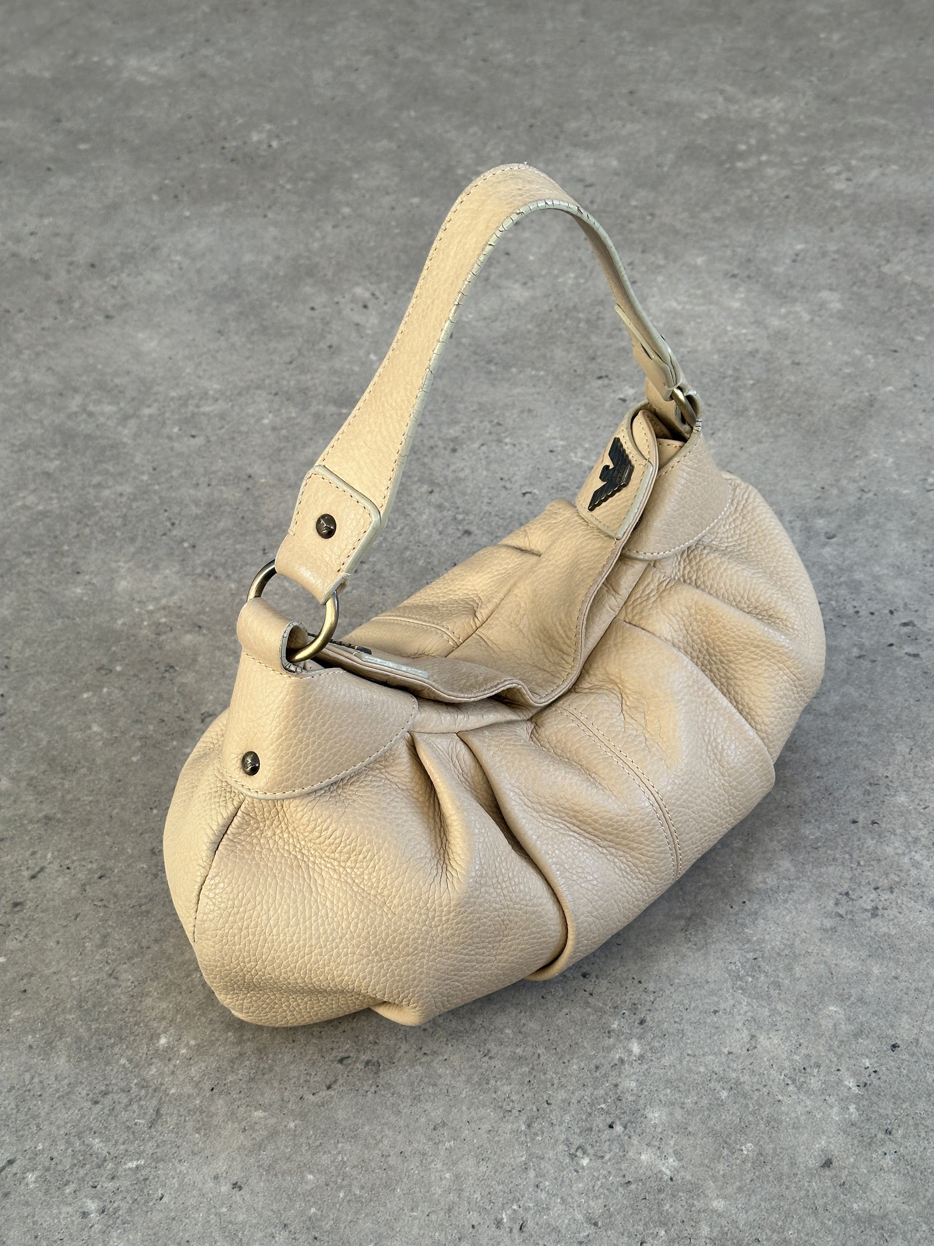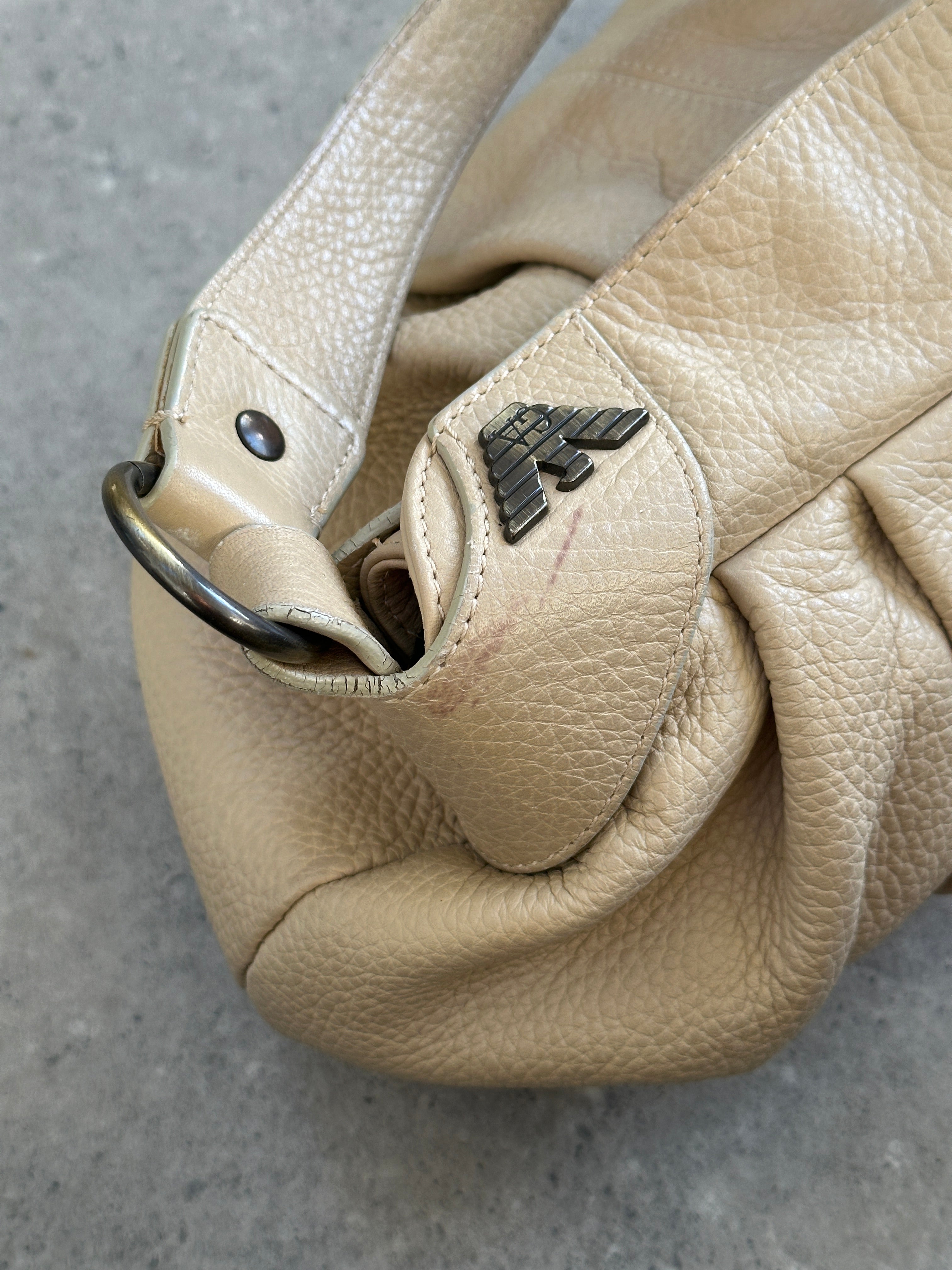 A vintage early 2000s Emporio Armani leather shoulder bag in a soft beige tone with a gently structured, relaxed silhouette. Designed with subtle pleating and a refined minimalist shape that aligns with Armani’s quiet luxury era.