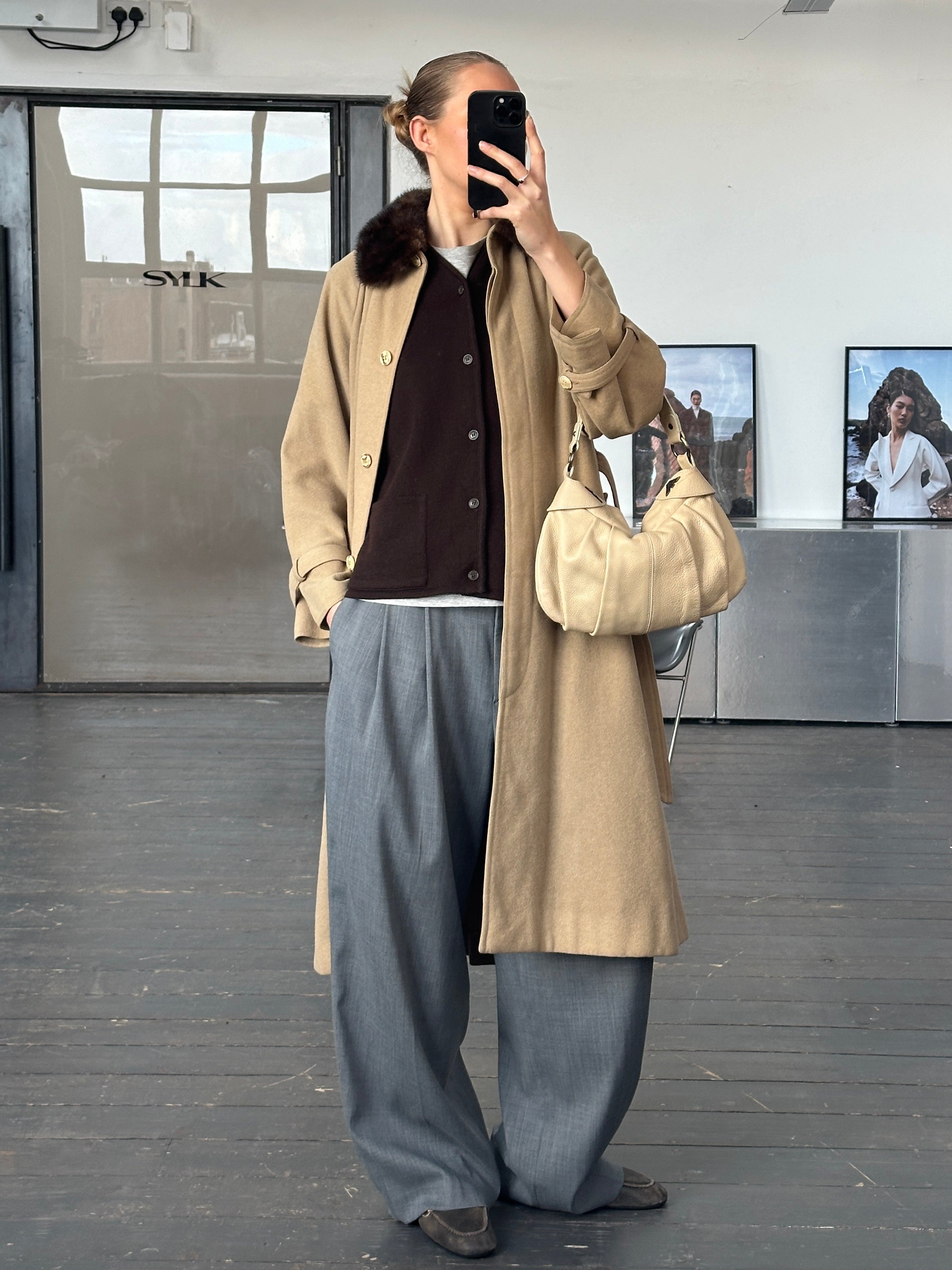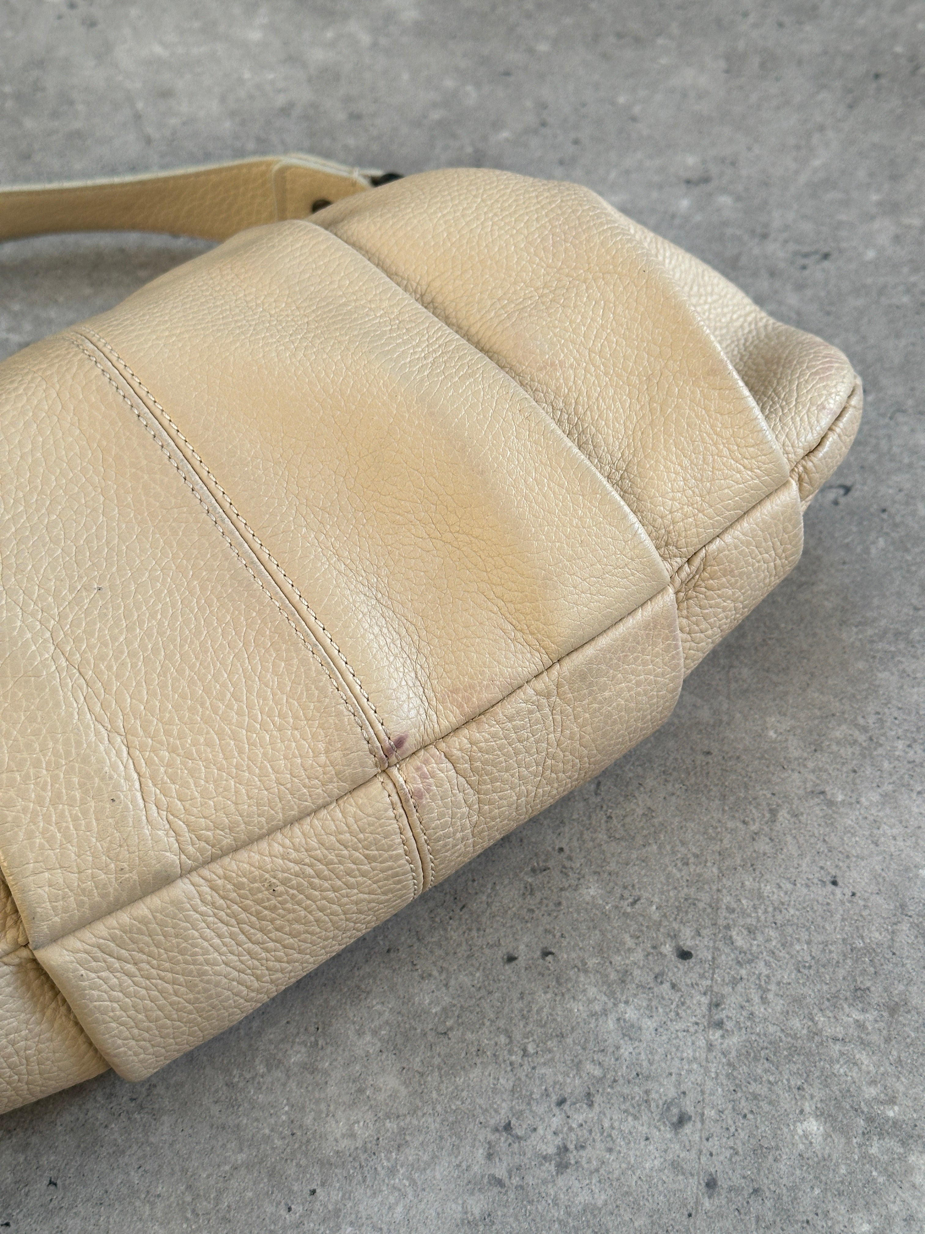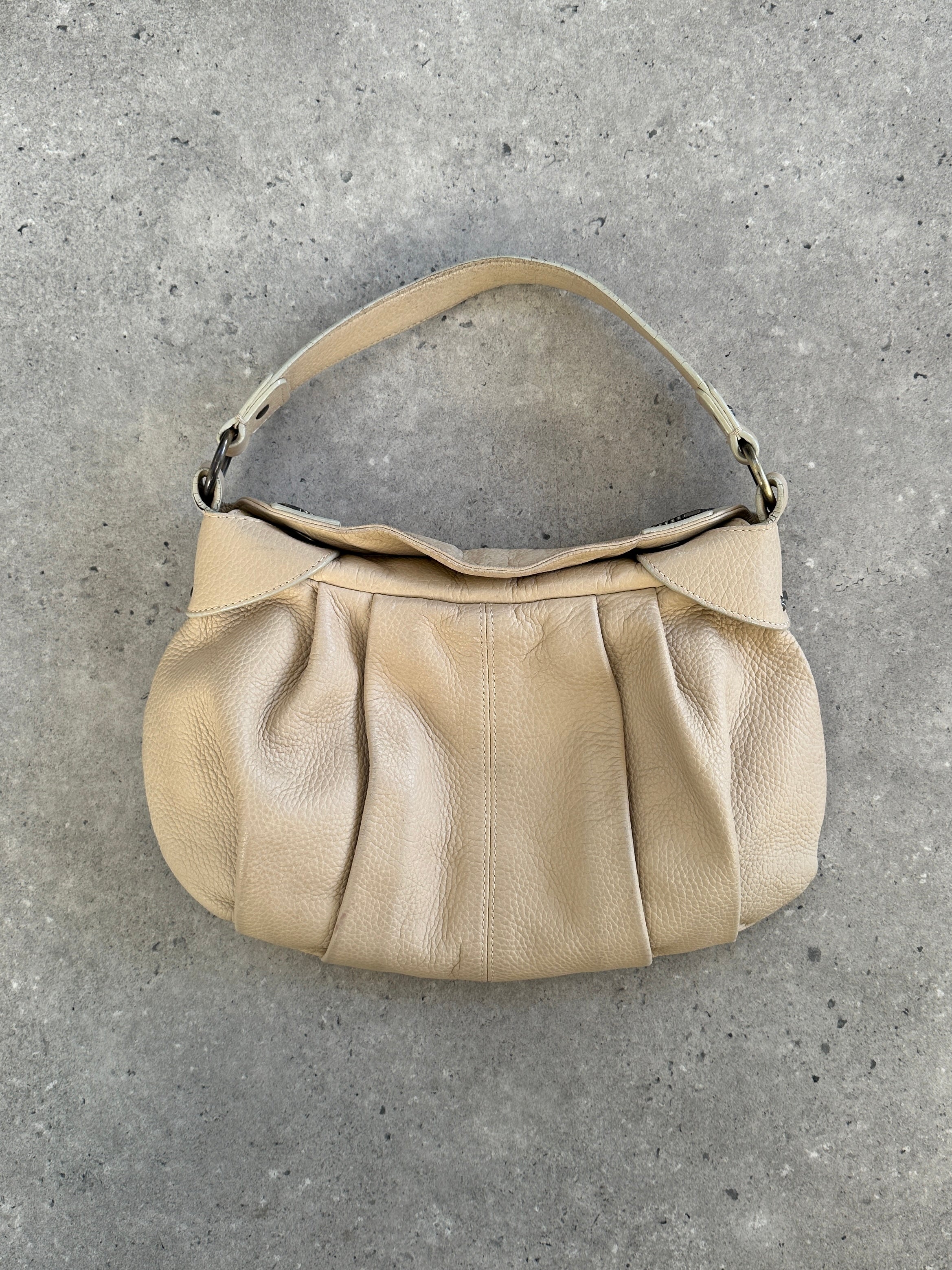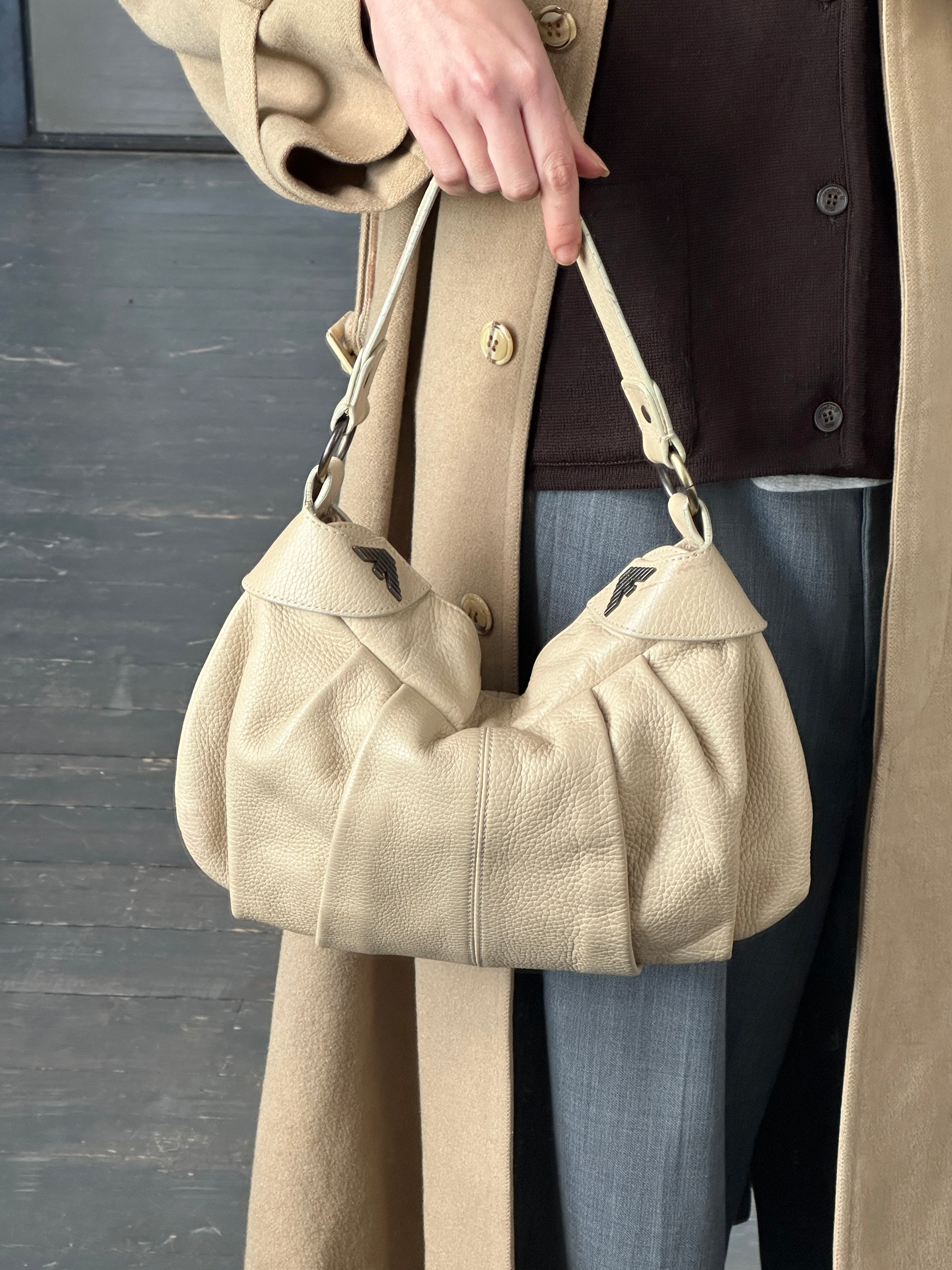 A vintage early 2000s Emporio Armani leather shoulder bag in a soft beige tone with a gently structured, relaxed silhouette. Designed with subtle pleating and a refined minimalist shape that aligns with Armani’s quiet luxury era.