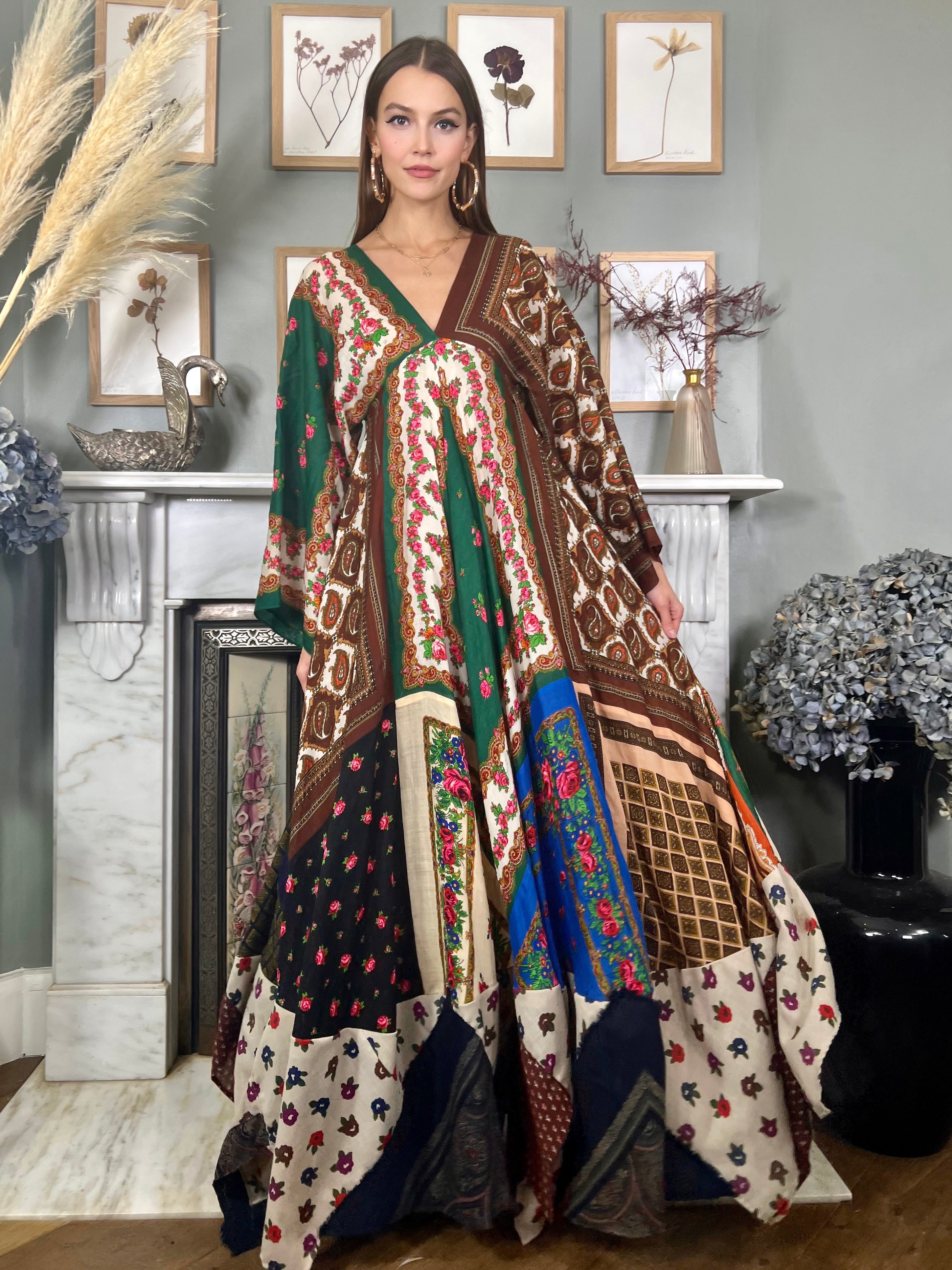 Literally what boho dreams are made of, collectable and very rare LaVetta of Beverly Hills wool patchwork scarf dress. They usually come in silk if you can ever find one but this one is made with fine wool scarves. Has long wide sleeves, a front and back V neck, an empire line seam and a billowy skirt with asymmetric hems. Can be worn back to front and has no opening. A total dream Goddess dress!