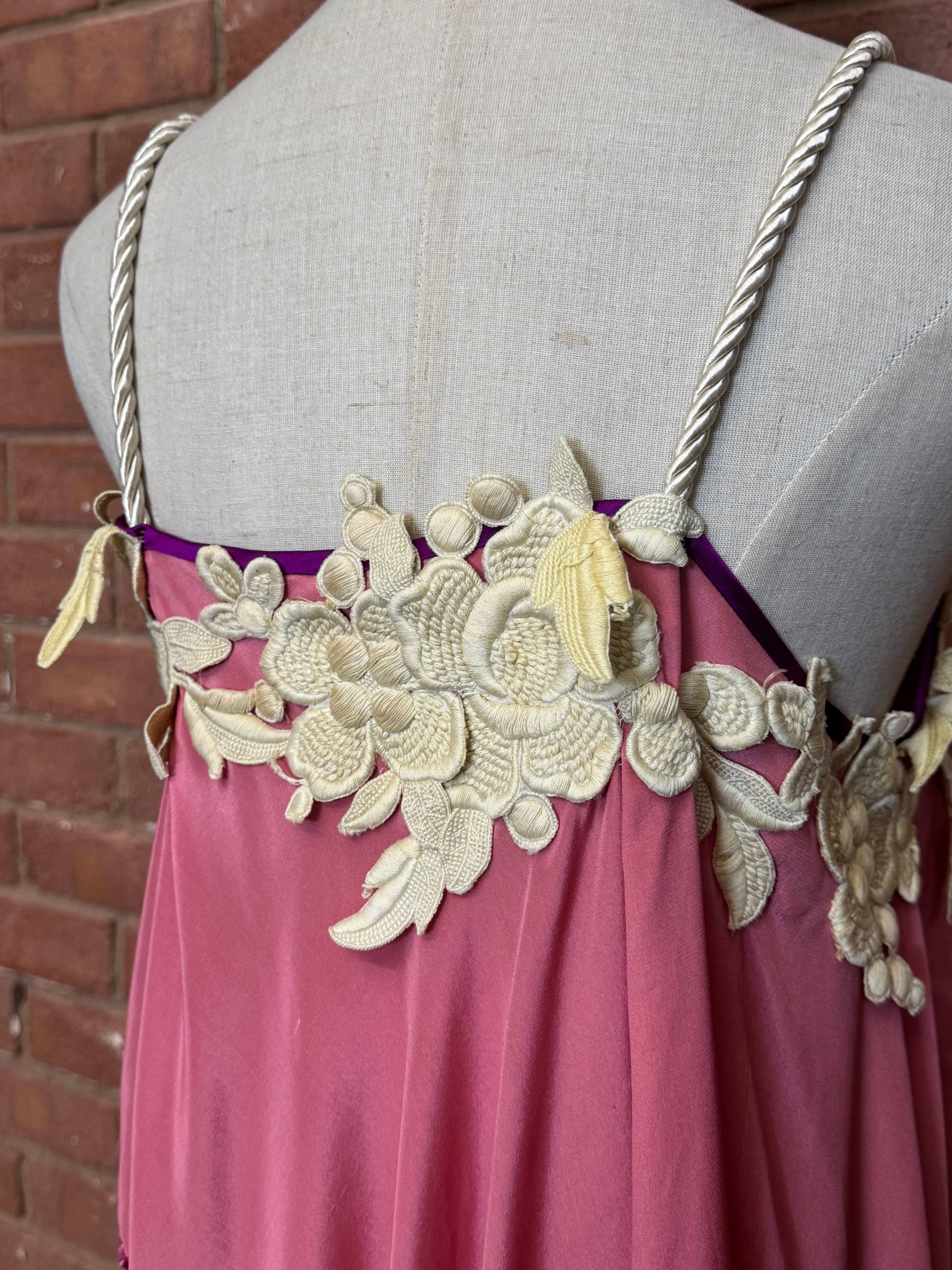 This unique reworked 1930s pink silk fringed scarf tunic showcases intricate handmade floral details and dense floral embroidery on the bust, highlighting expert craftsmanship. The straps, crafted from authentic 1970s braids, add vintage charm. Designed with a loose fit, it offers versatile styling options as a dress or tunic, blending timeless elegance with contemporary wearability.