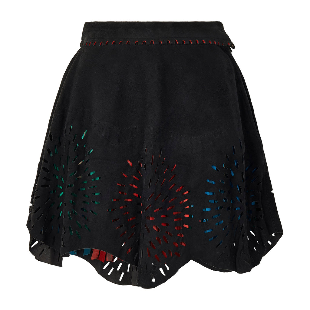 1994 Alaia Black Suede Cut Out Skirt with Green Red and Blue Tassels