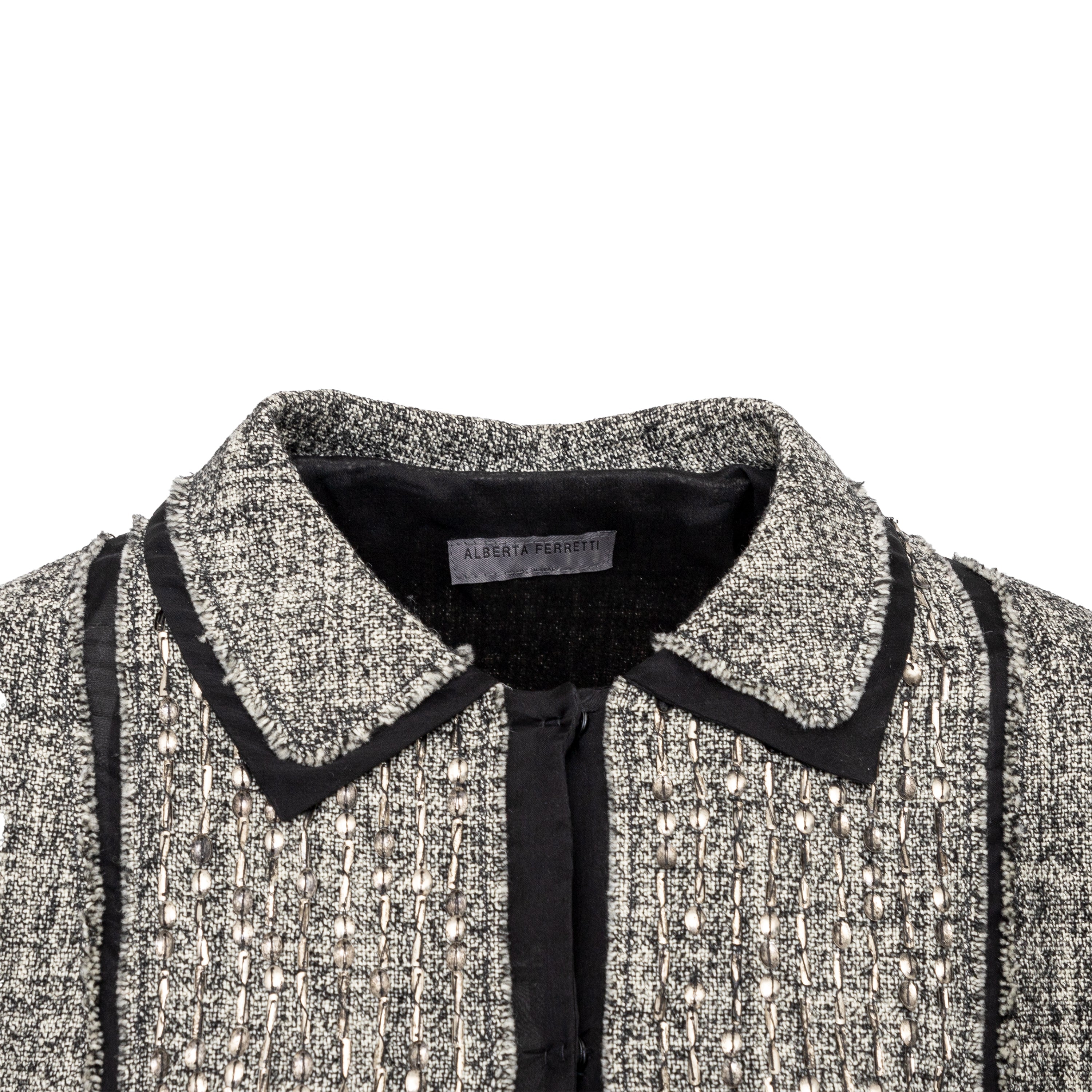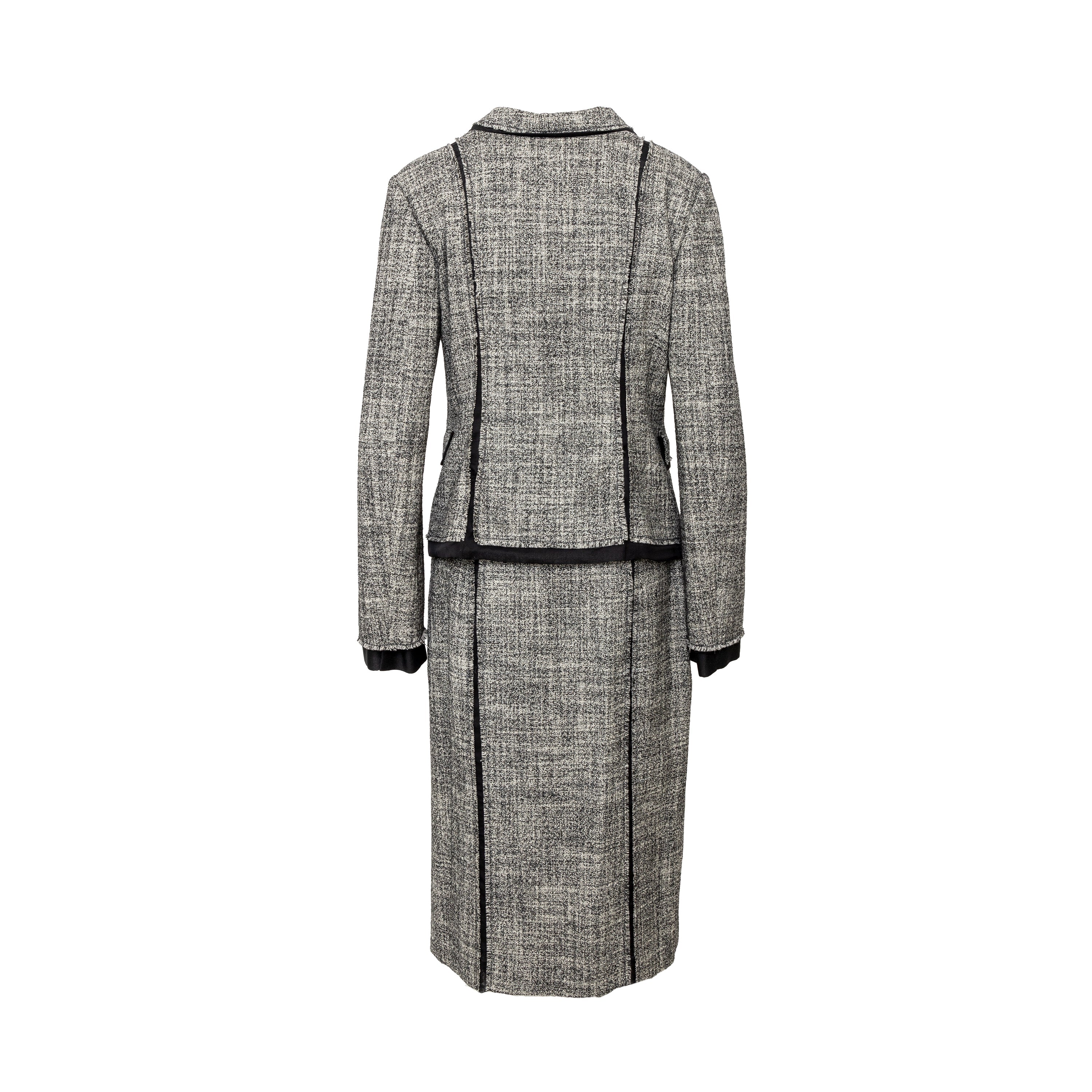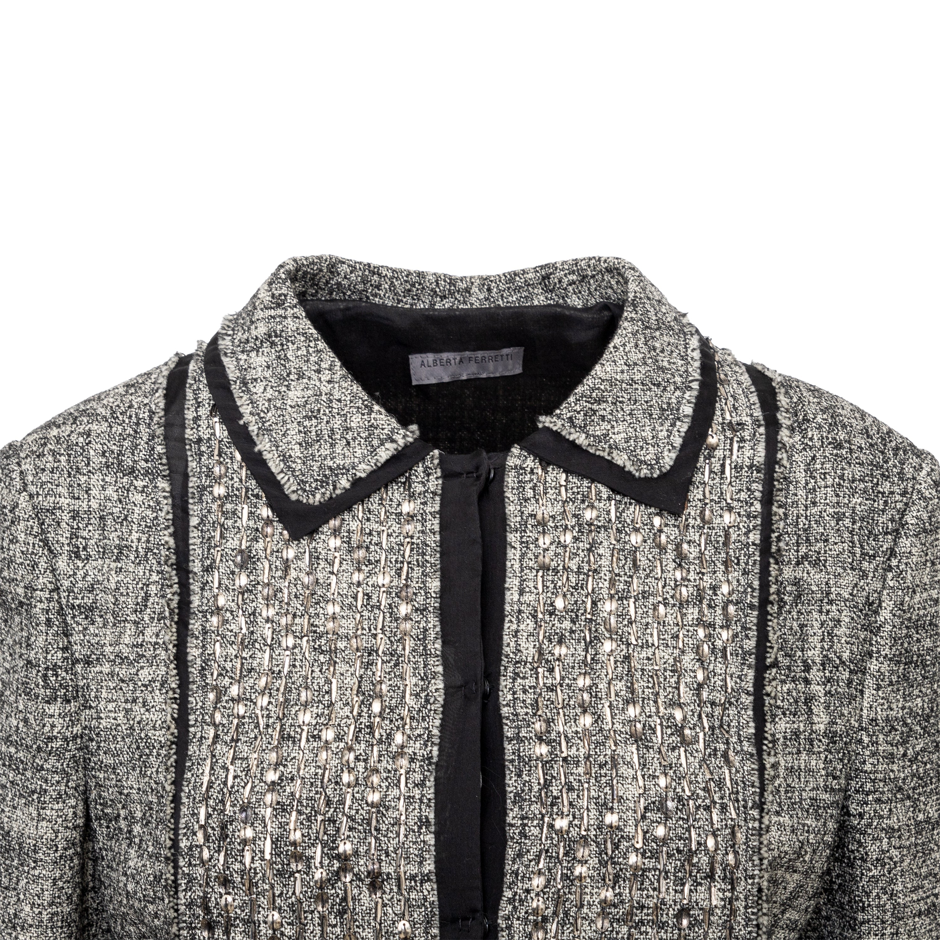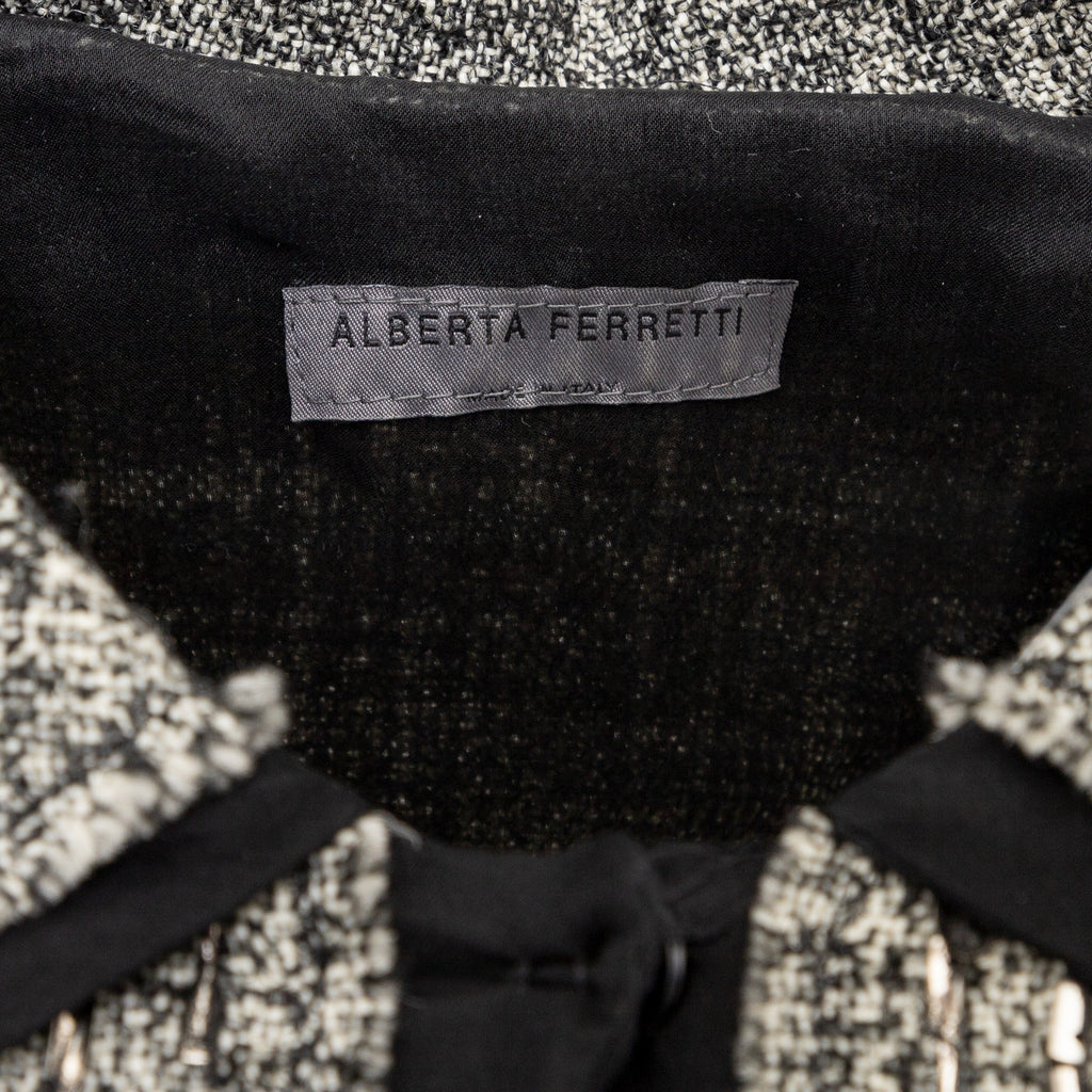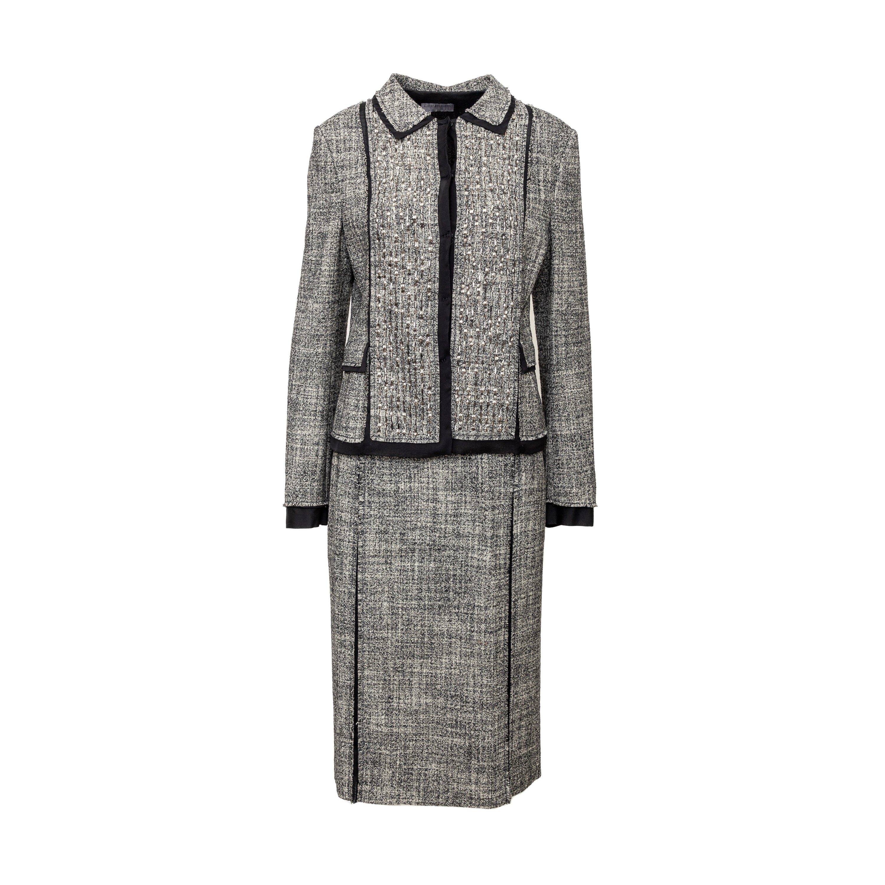 This matching Alberta Ferretti jacket and skirt set exudes modern elegance in a grey and black melange. Made of a luxurious virgin wool and acrylic blend, the jacket features a short collar and two front flaps with delicate silk trimmings and hand sewn metal bead accents. The midi length skirt adds a sophisticated touch, fully lined with silk for added comfort.
