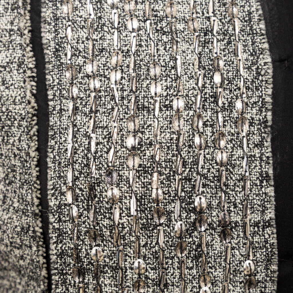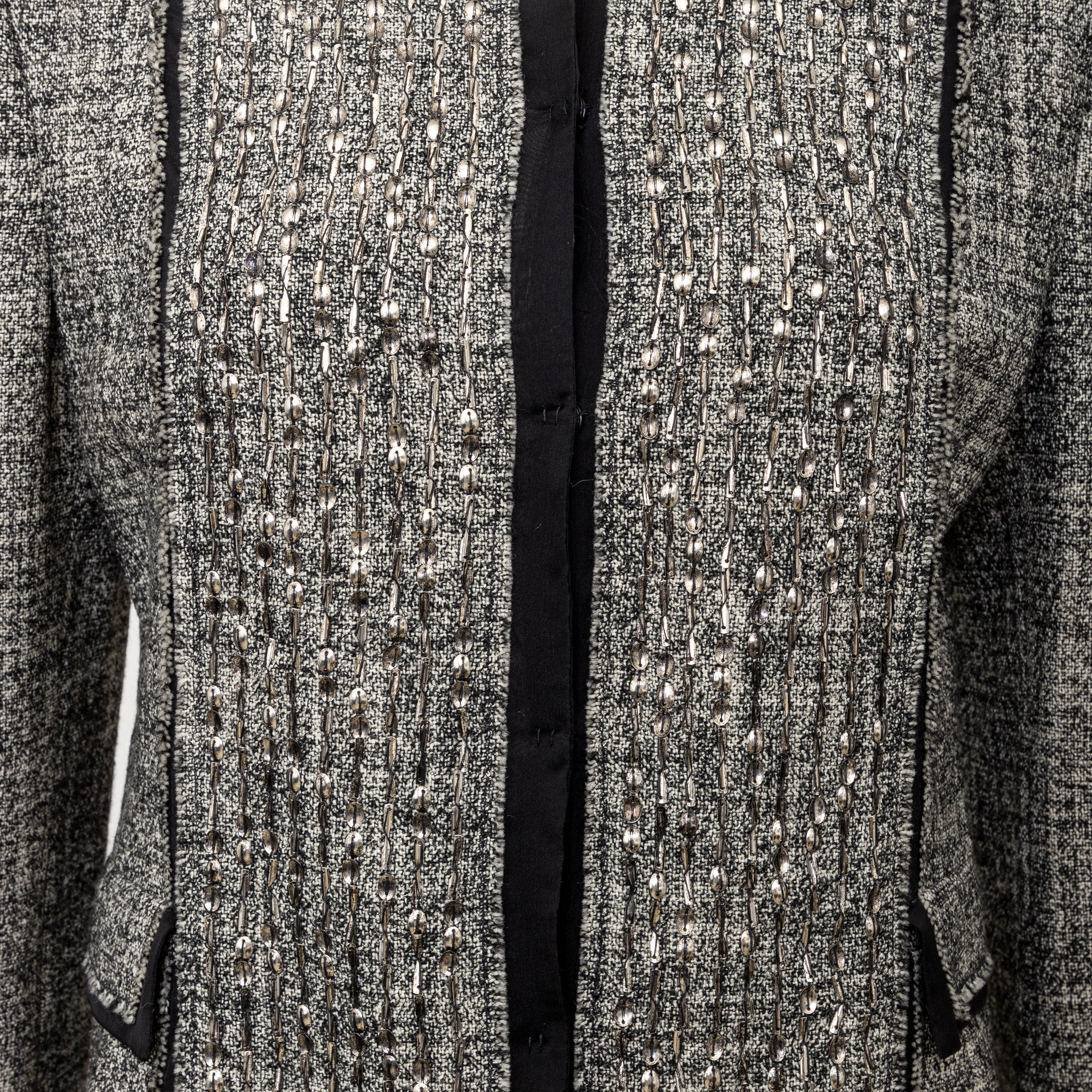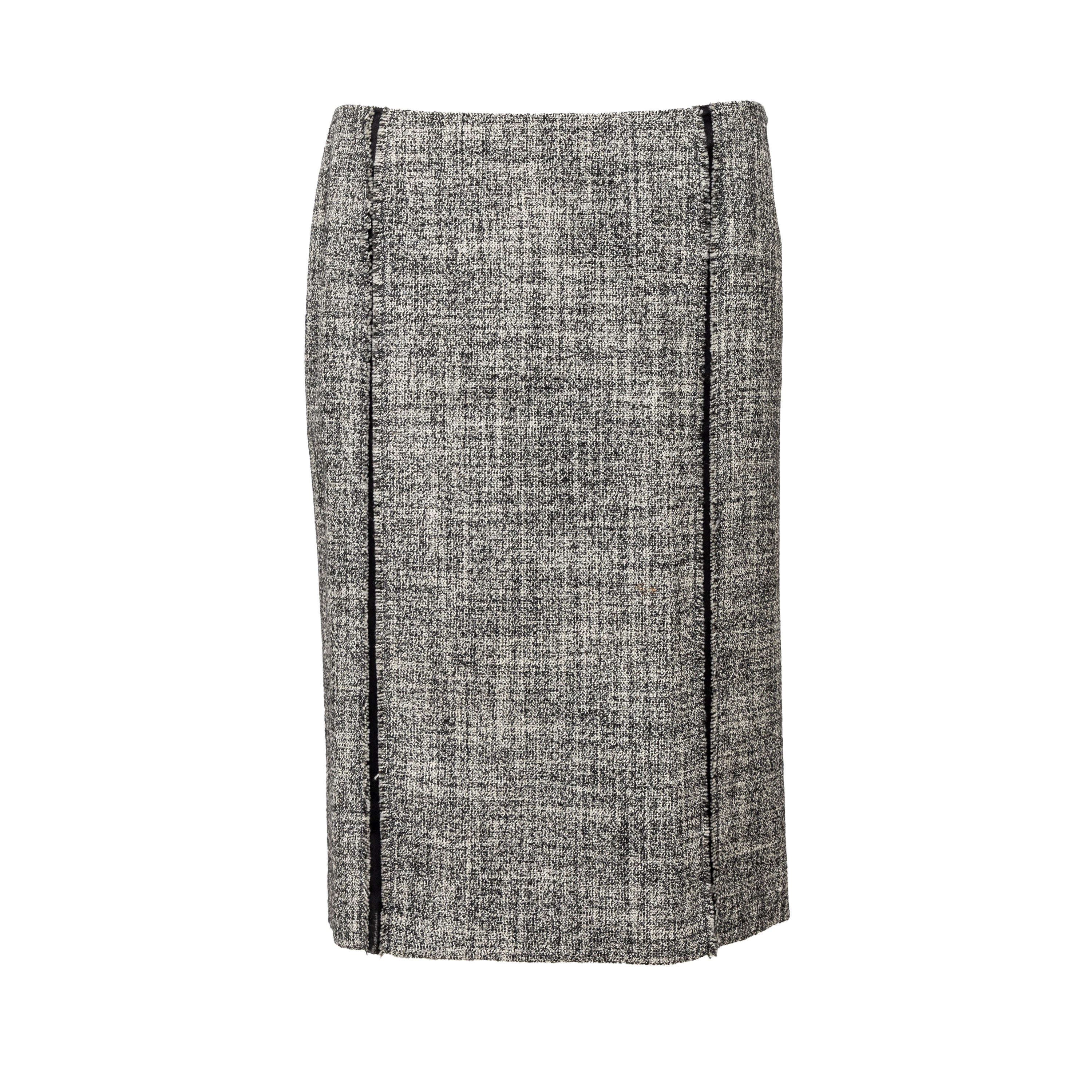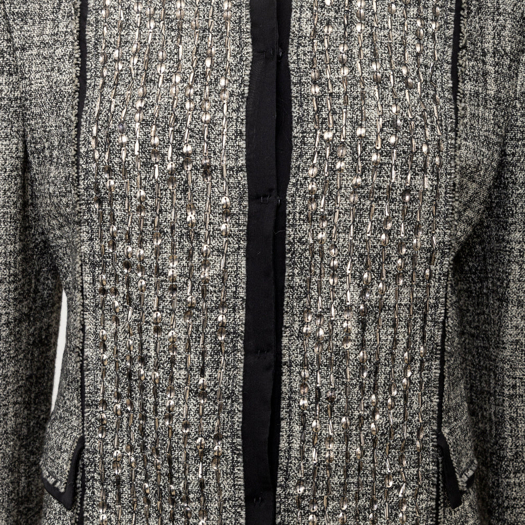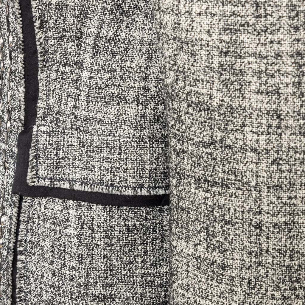 This matching Alberta Ferretti jacket and skirt set exudes modern elegance in a grey and black melange. Made of a luxurious virgin wool and acrylic blend, the jacket features a short collar and two front flaps with delicate silk trimmings and hand sewn metal bead accents. The midi length skirt adds a sophisticated touch, fully lined with silk for added comfort.
