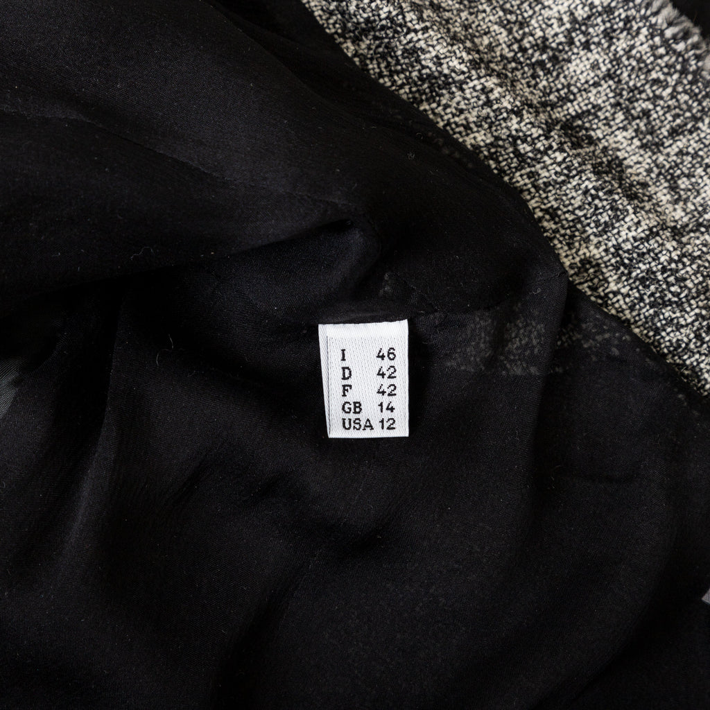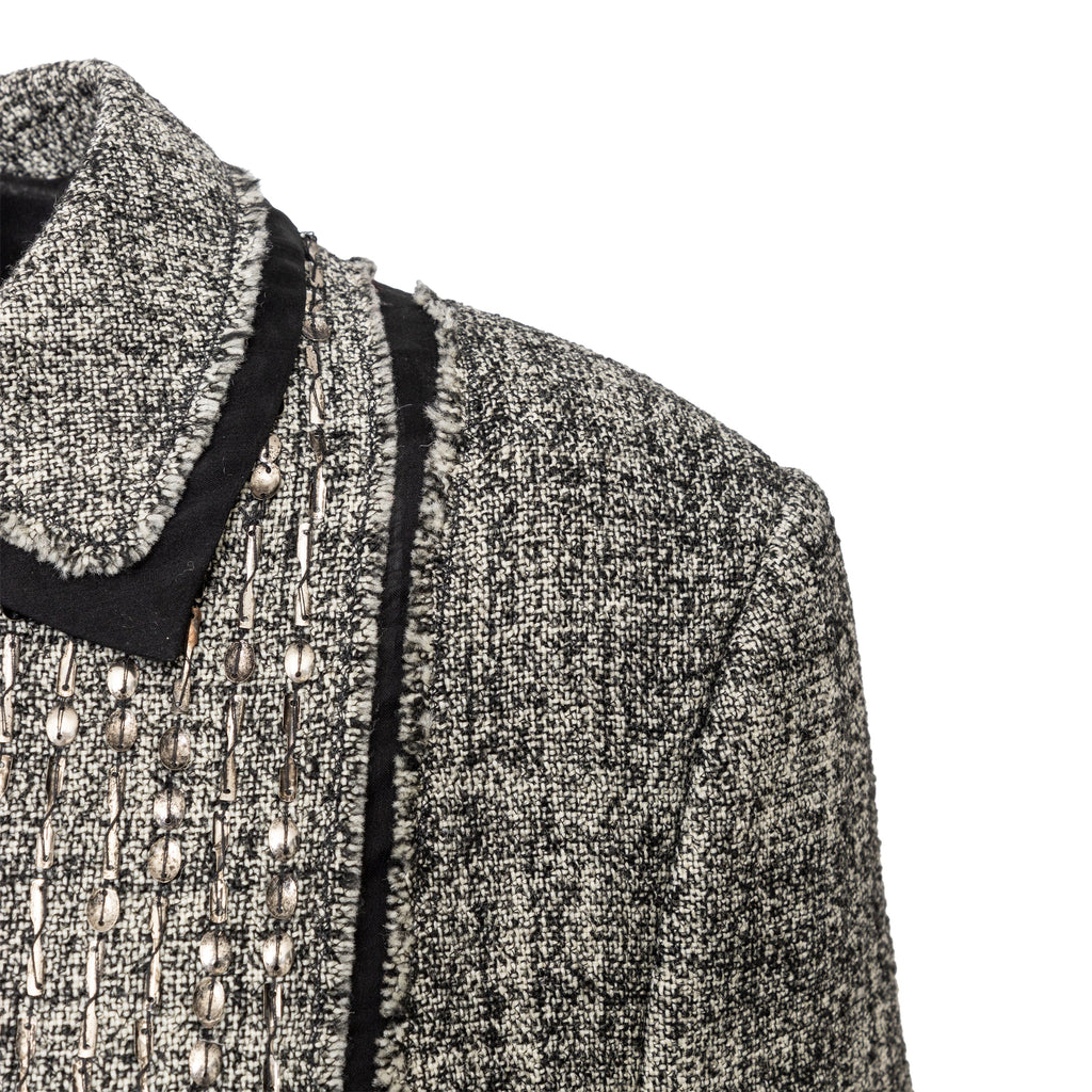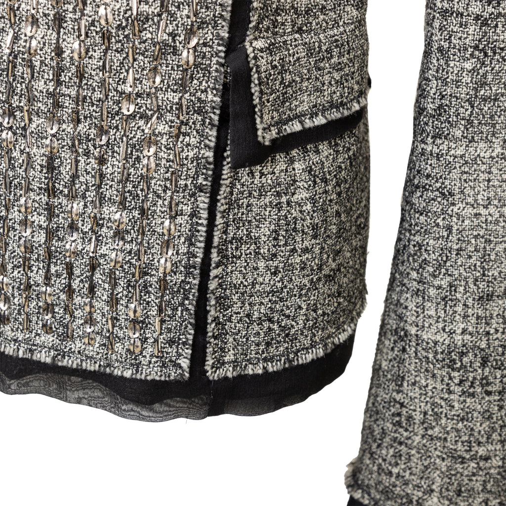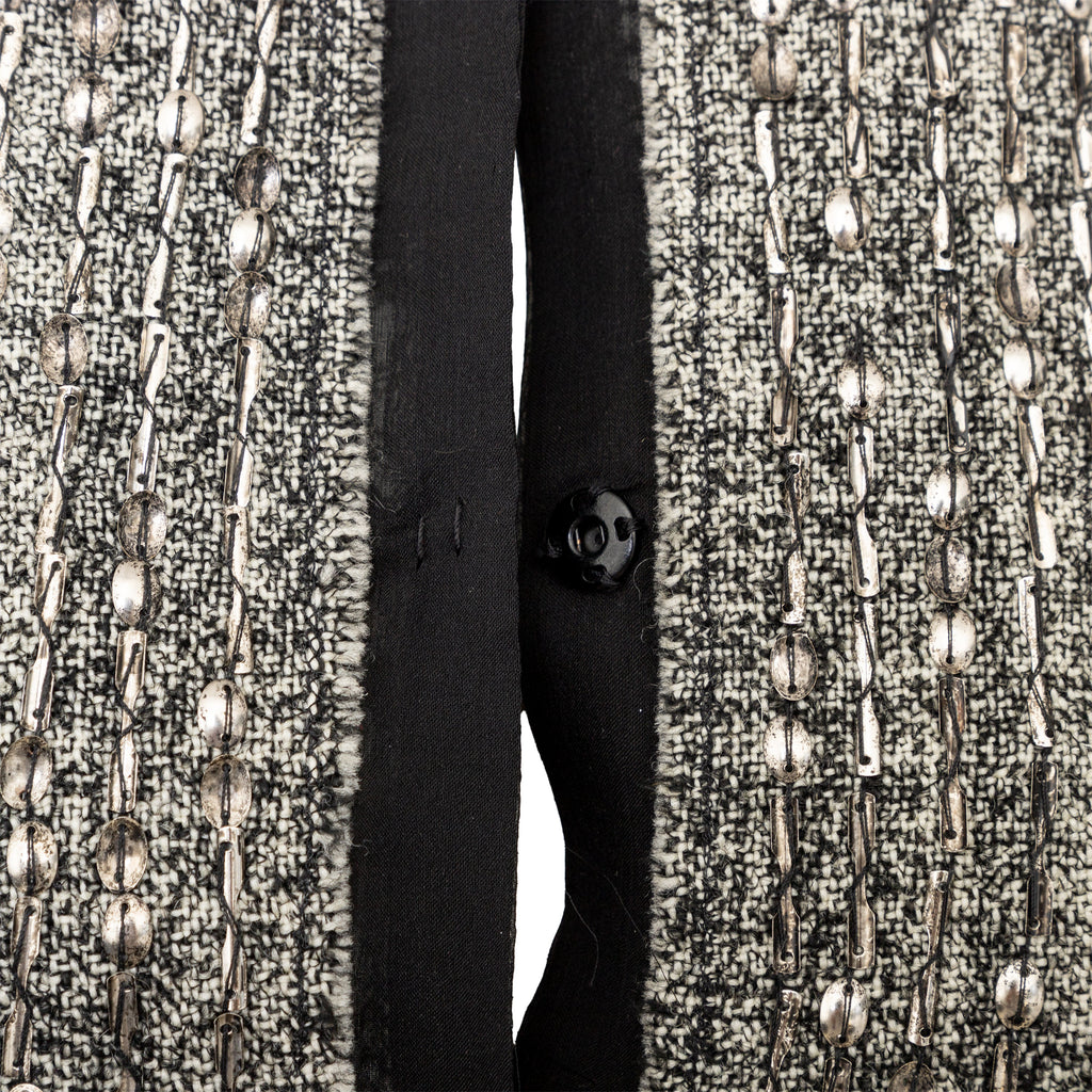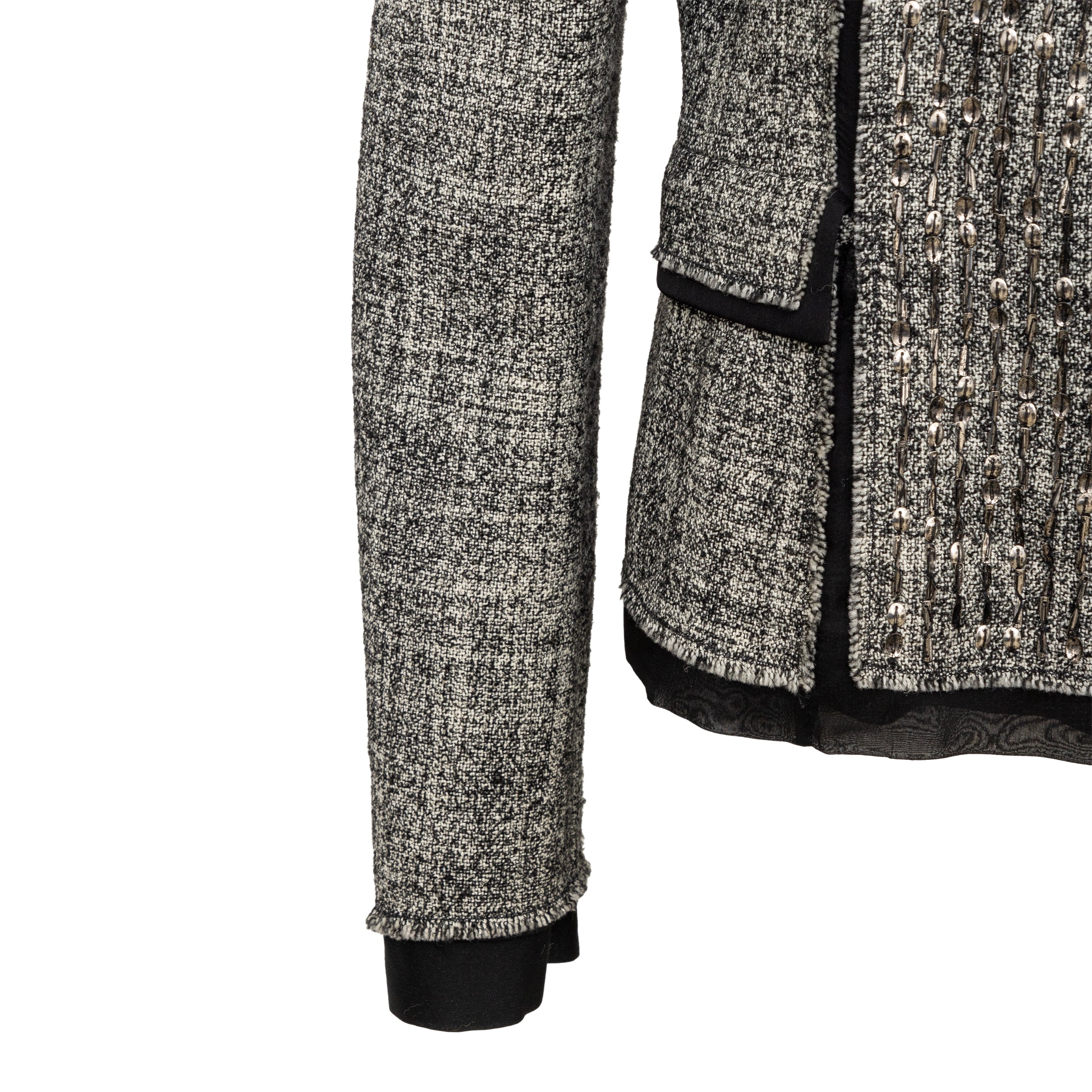 This matching Alberta Ferretti jacket and skirt set exudes modern elegance in a grey and black melange. Made of a luxurious virgin wool and acrylic blend, the jacket features a short collar and two front flaps with delicate silk trimmings and hand sewn metal bead accents. The midi length skirt adds a sophisticated touch, fully lined with silk for added comfort.