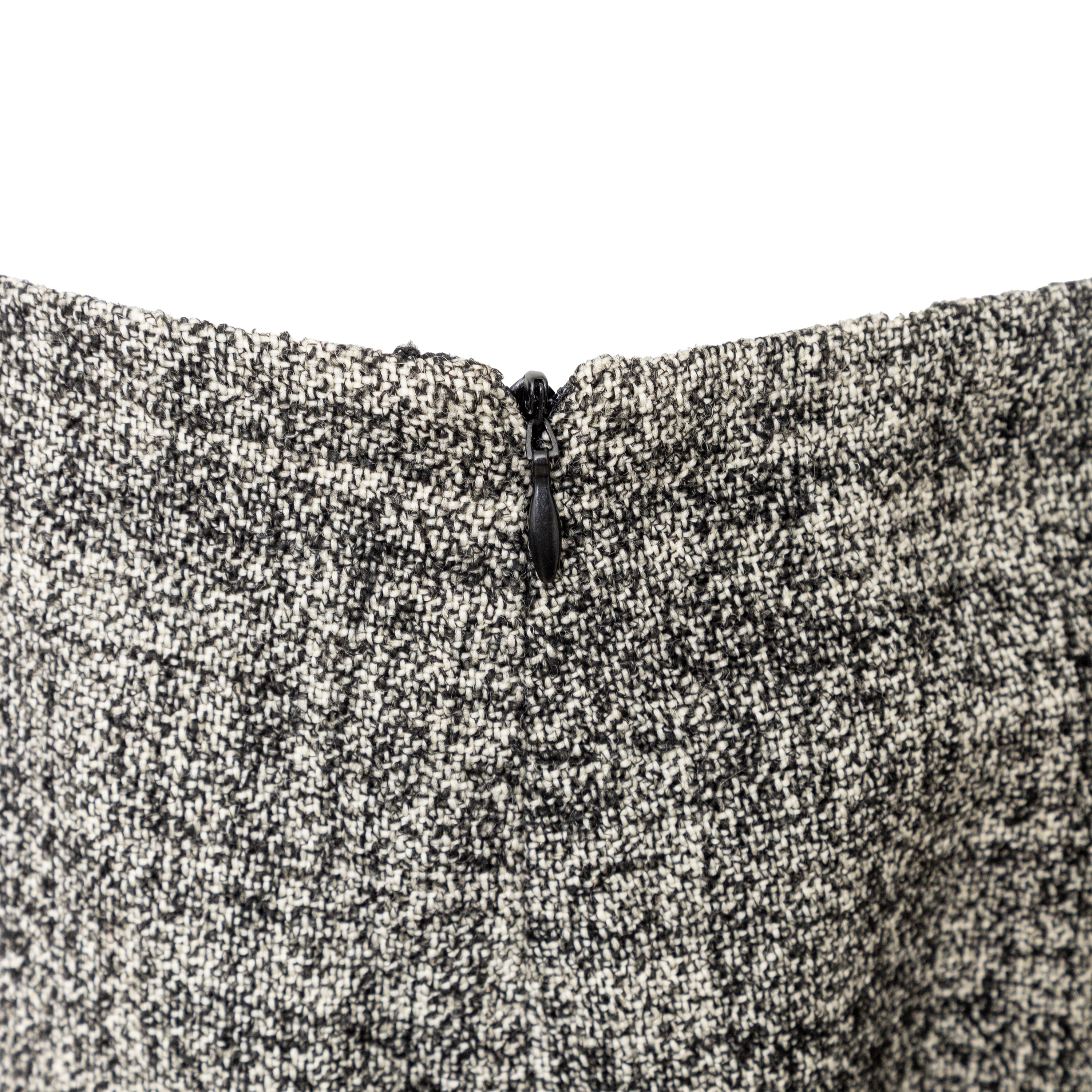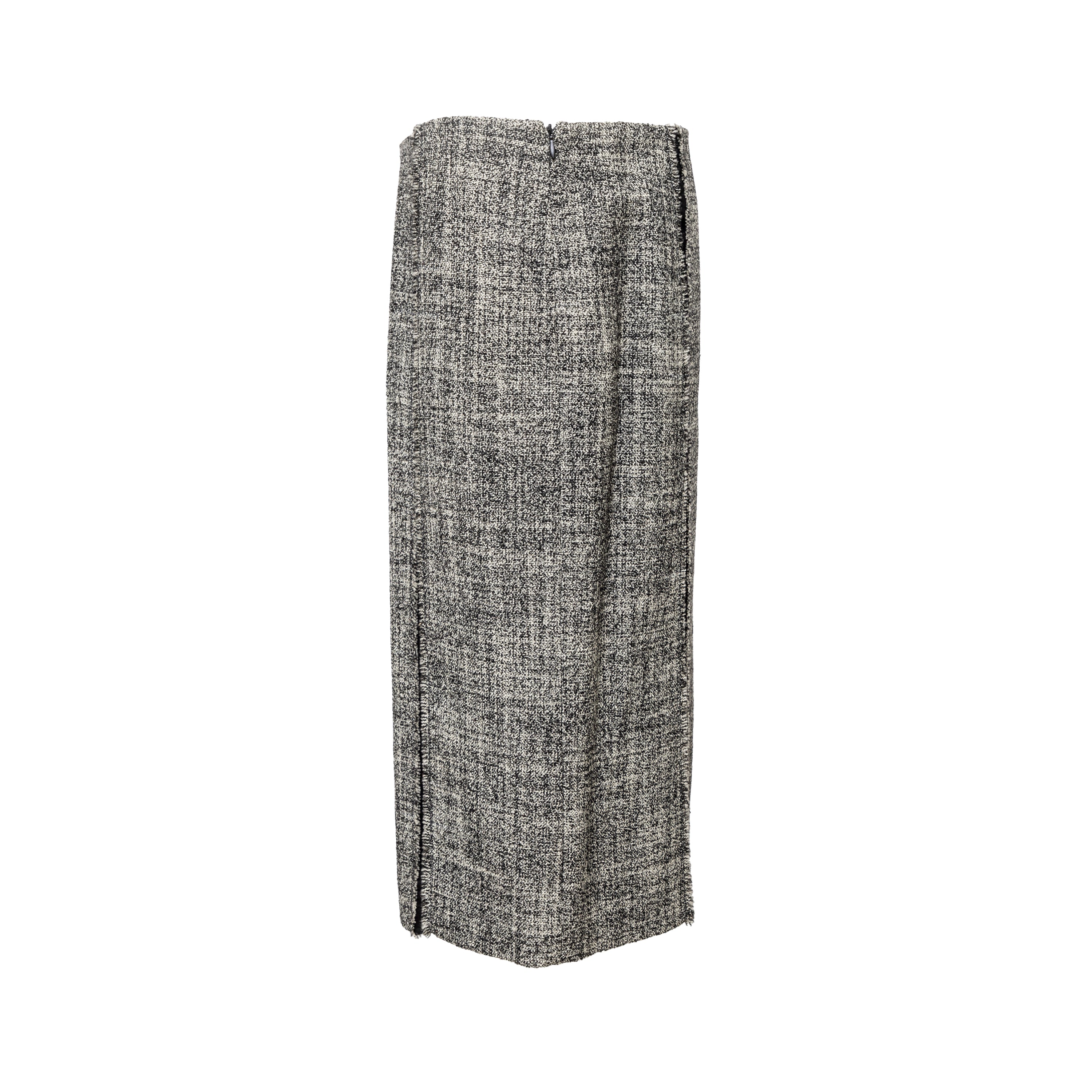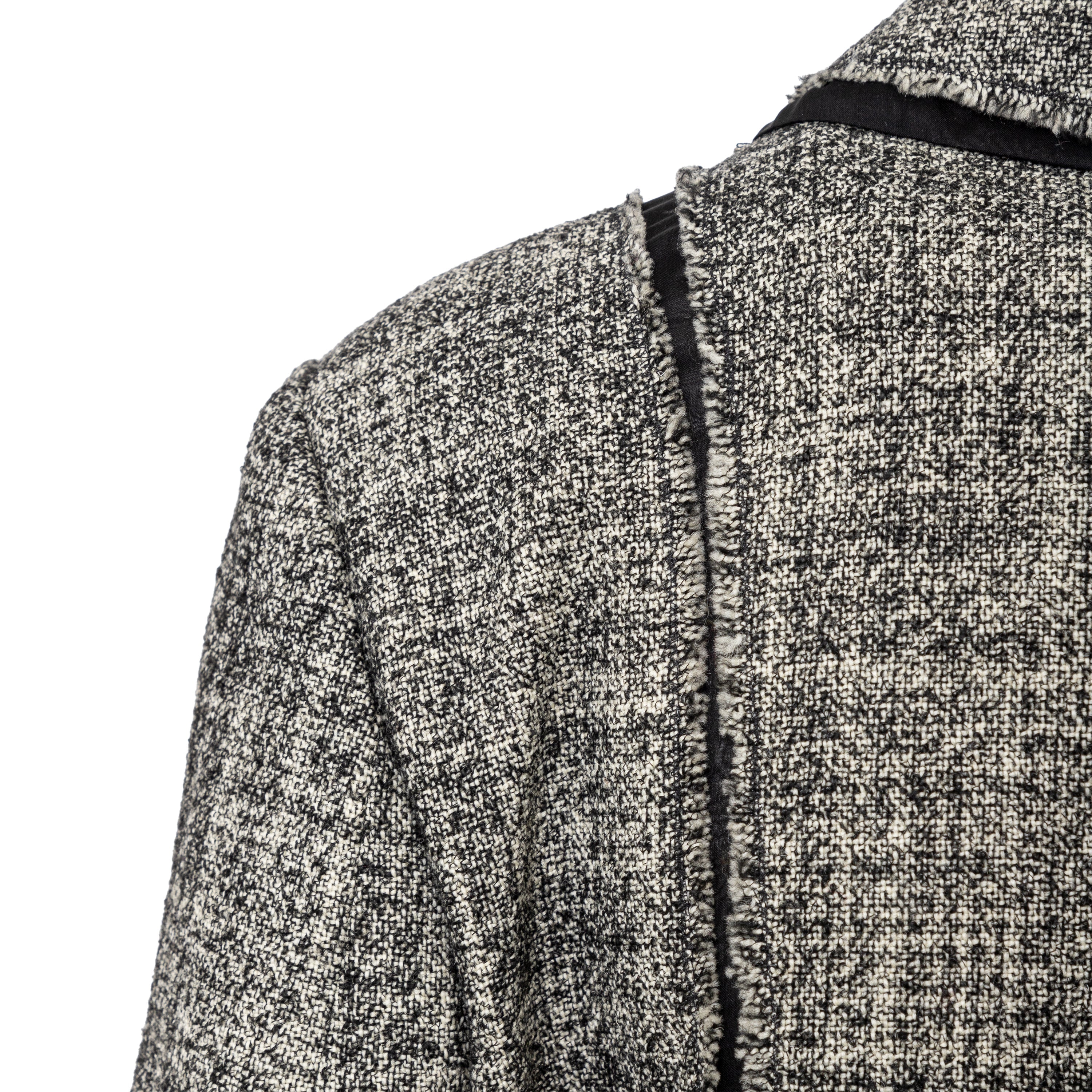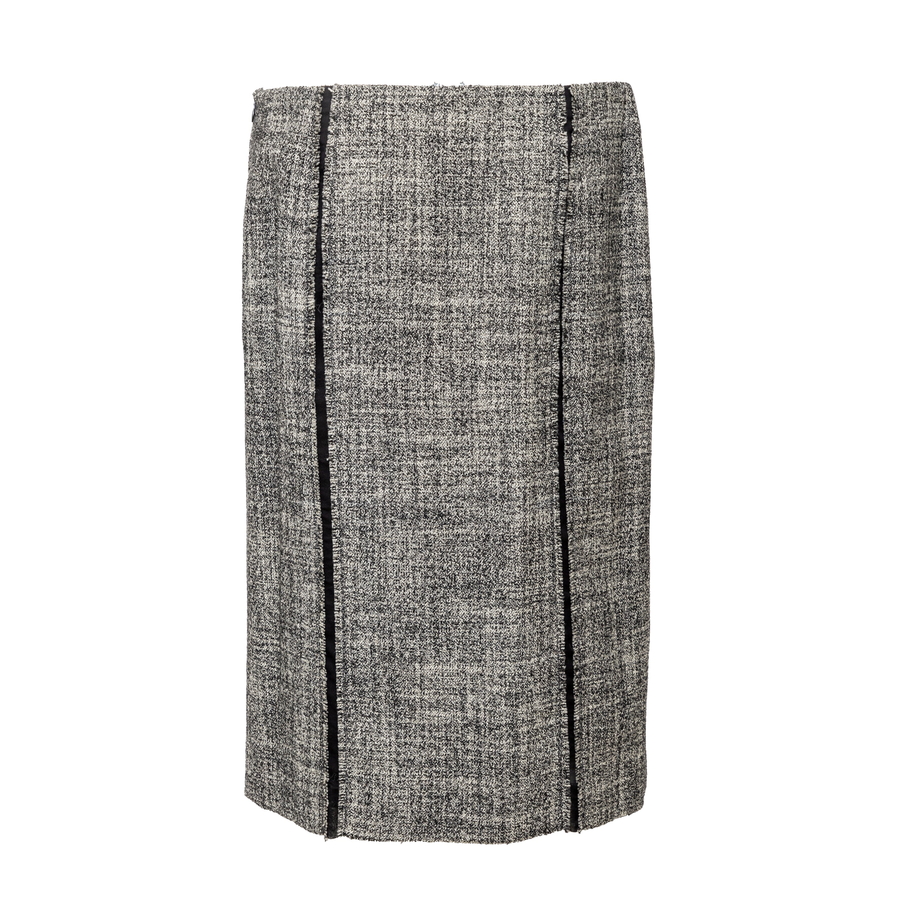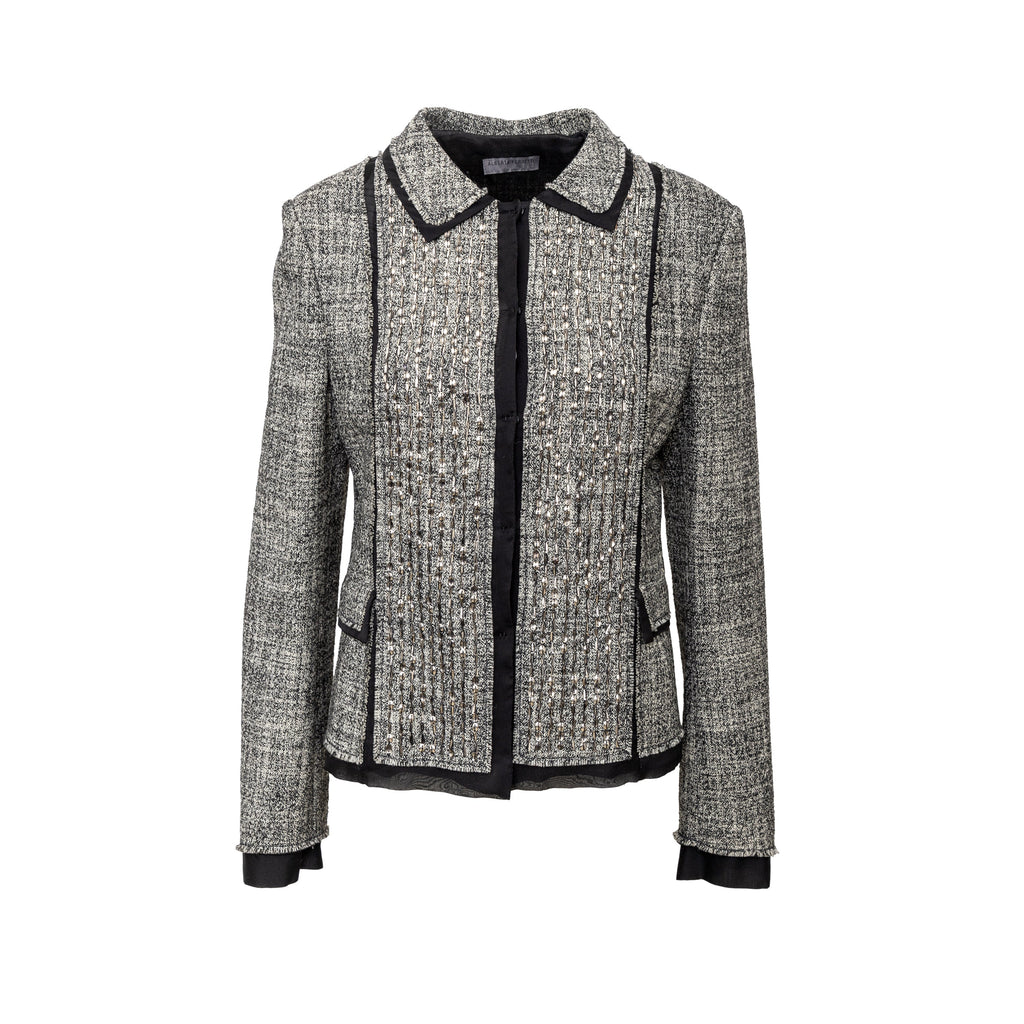 This matching Alberta Ferretti jacket and skirt set exudes modern elegance in a grey and black melange. Made of a luxurious virgin wool and acrylic blend, the jacket features a short collar and two front flaps with delicate silk trimmings and hand sewn metal bead accents. The midi length skirt adds a sophisticated touch, fully lined with silk for added comfort.