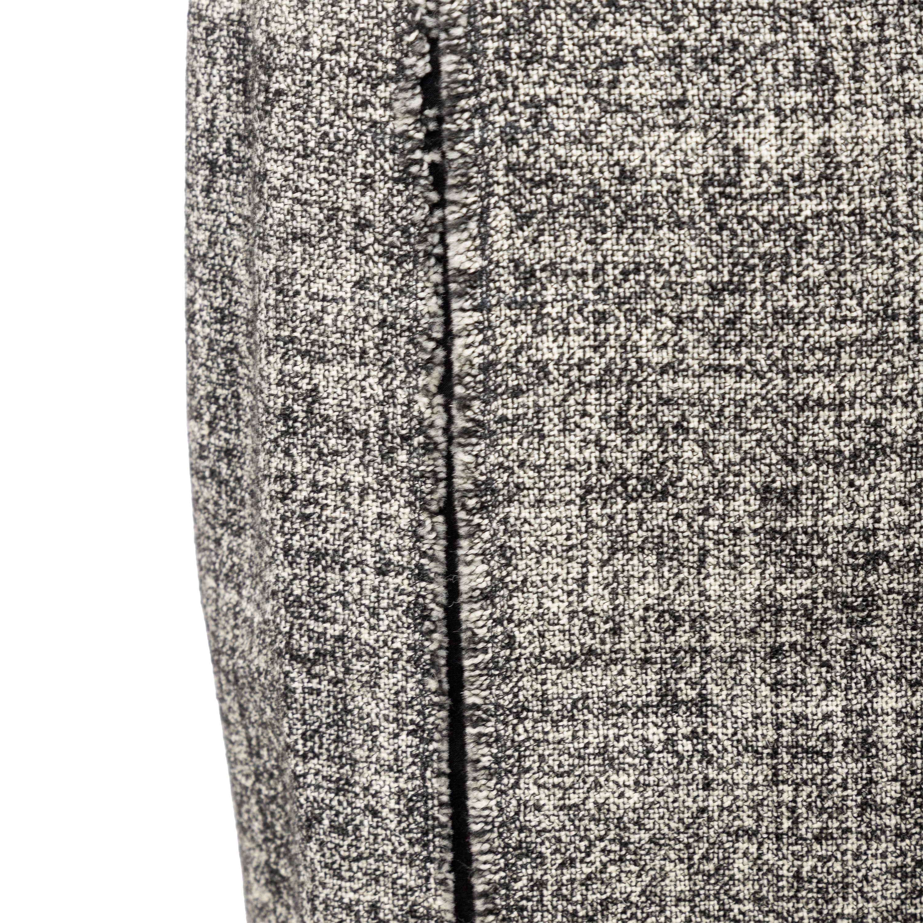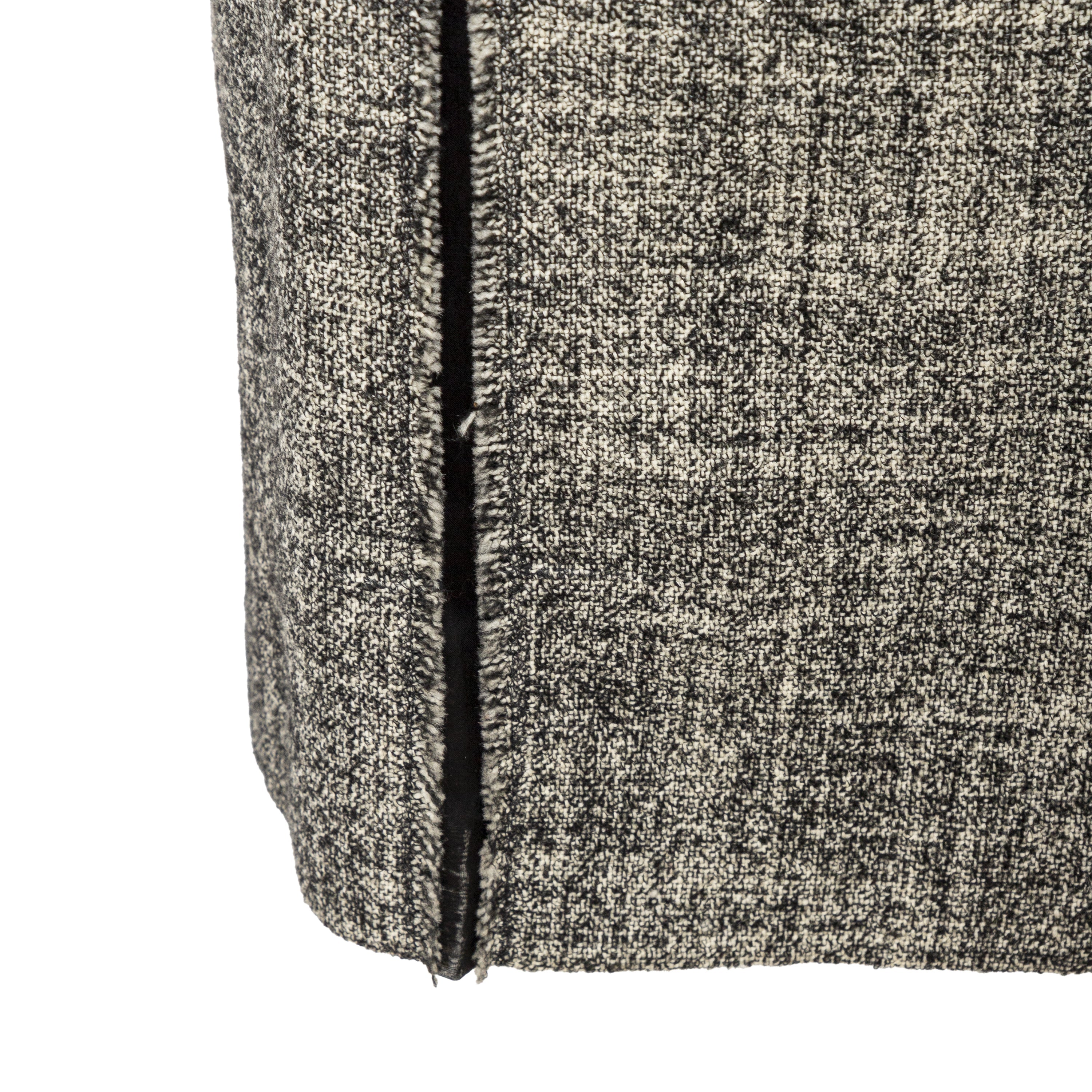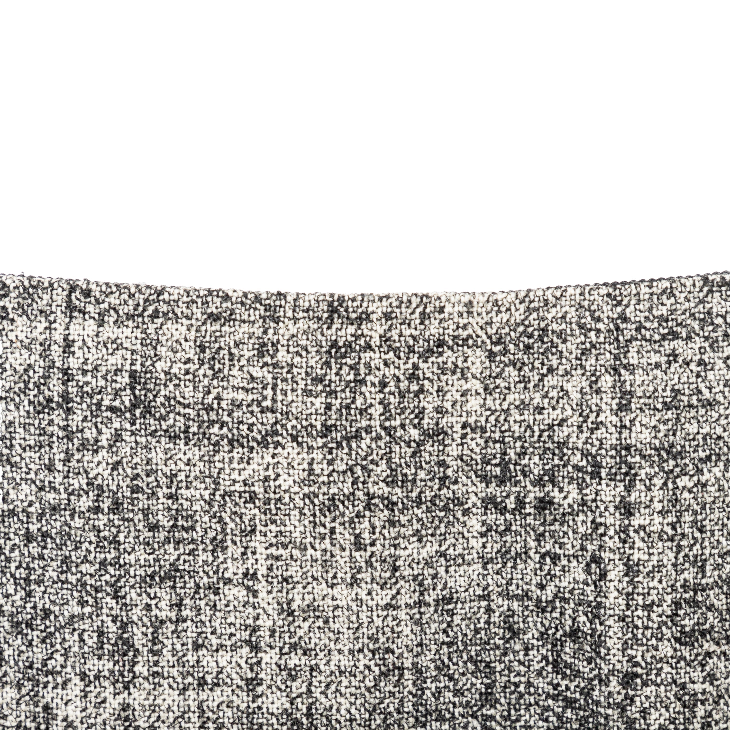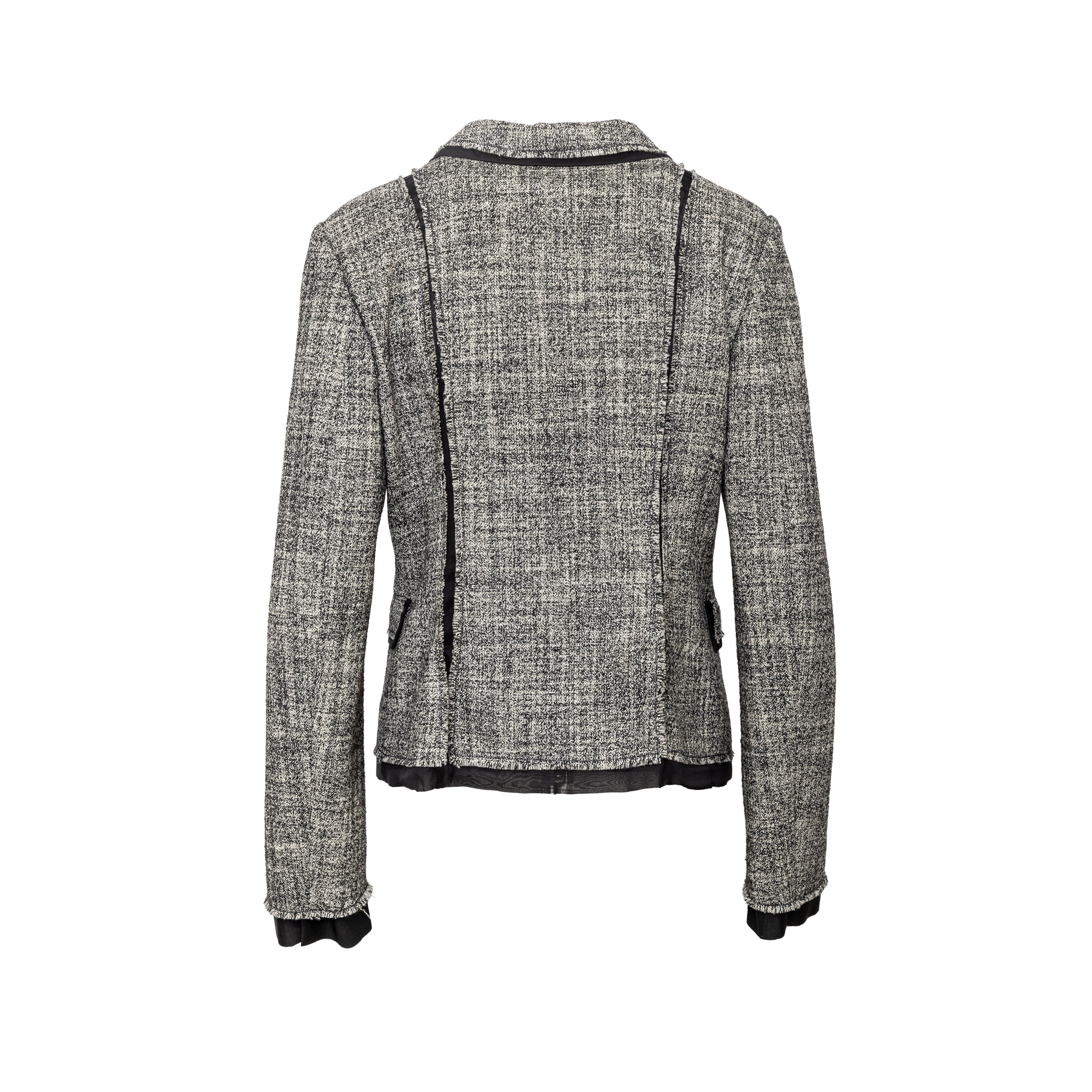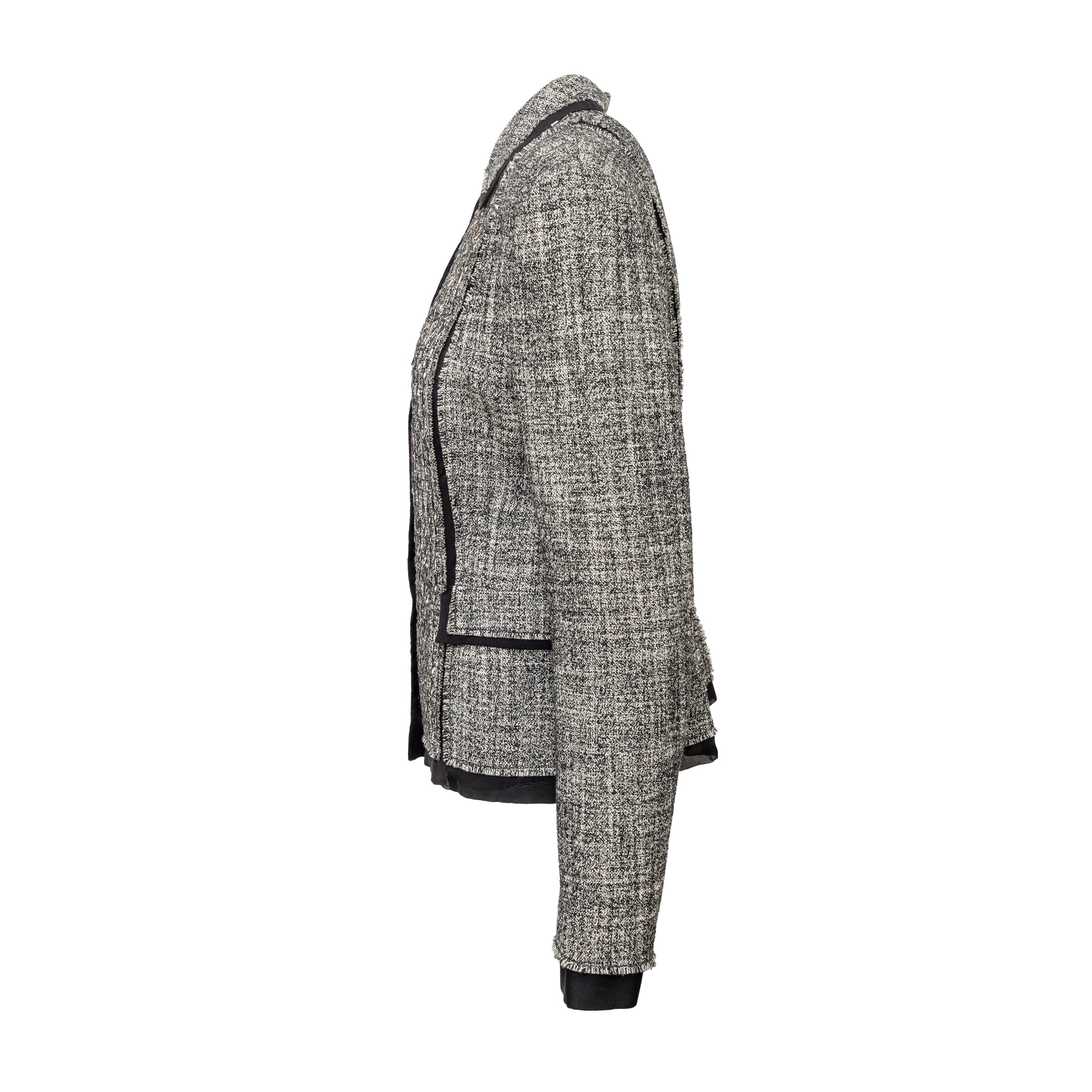 This matching Alberta Ferretti jacket and skirt set exudes modern elegance in a grey and black melange. Made of a luxurious virgin wool and acrylic blend, the jacket features a short collar and two front flaps with delicate silk trimmings and hand sewn metal bead accents. The midi length skirt adds a sophisticated touch, fully lined with silk for added comfort.