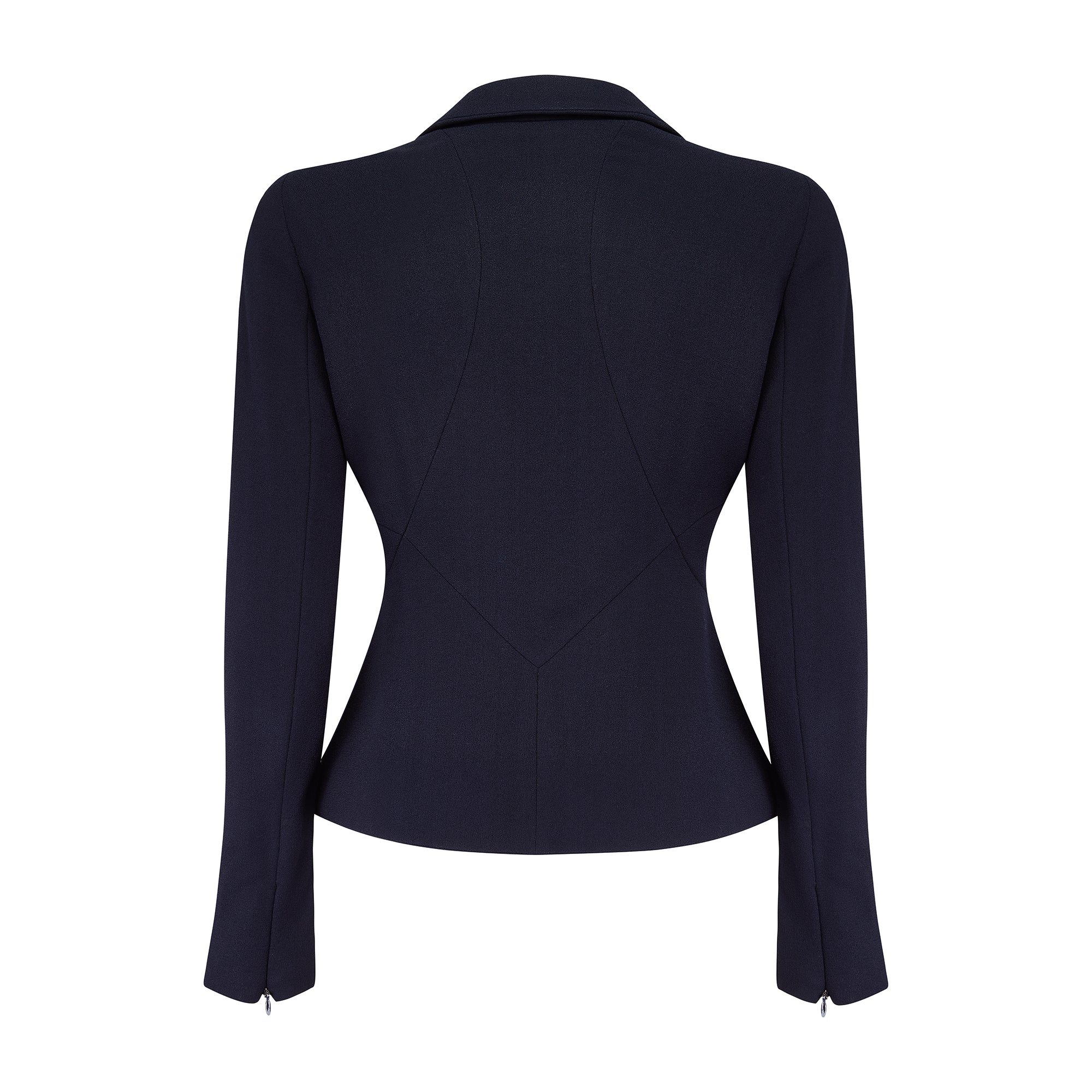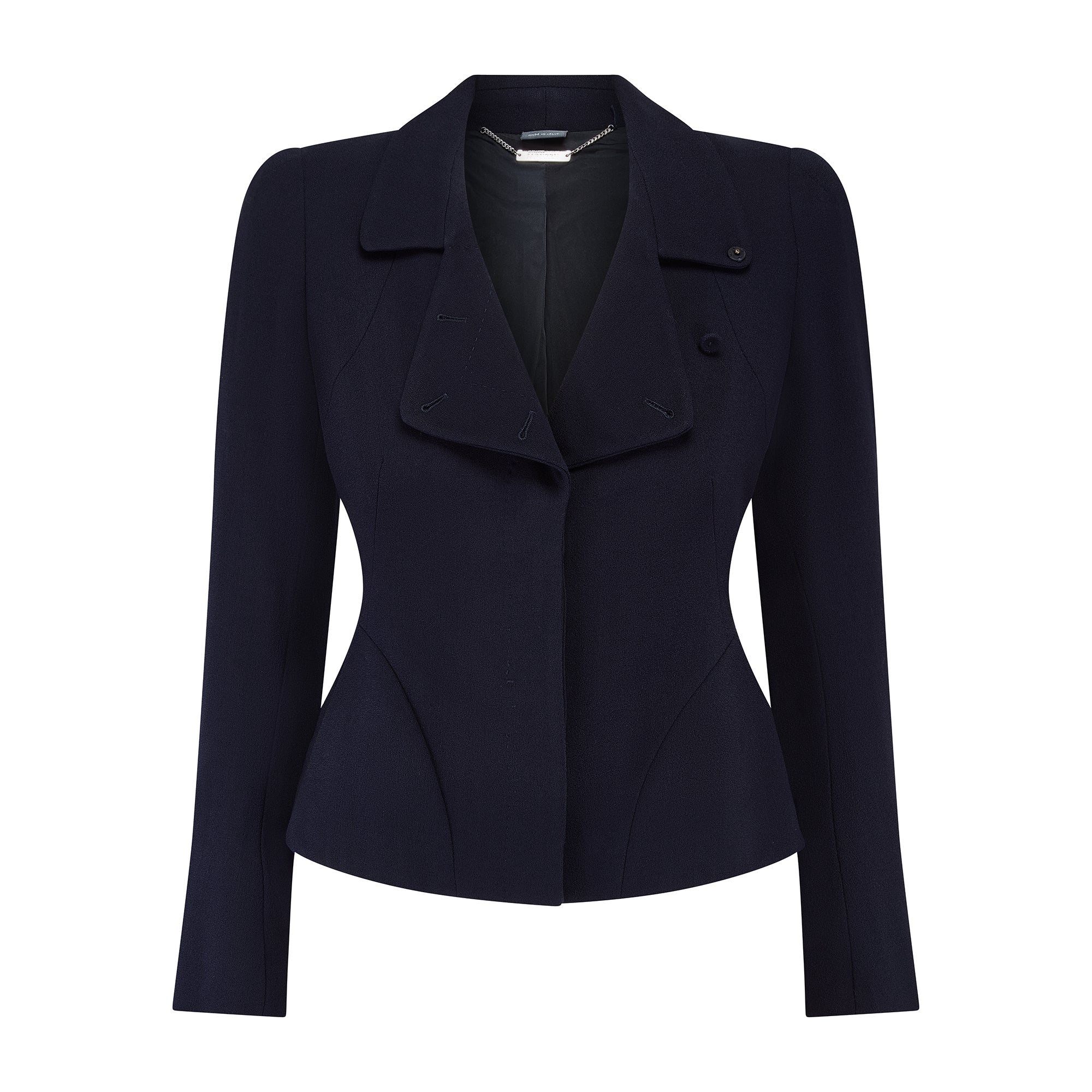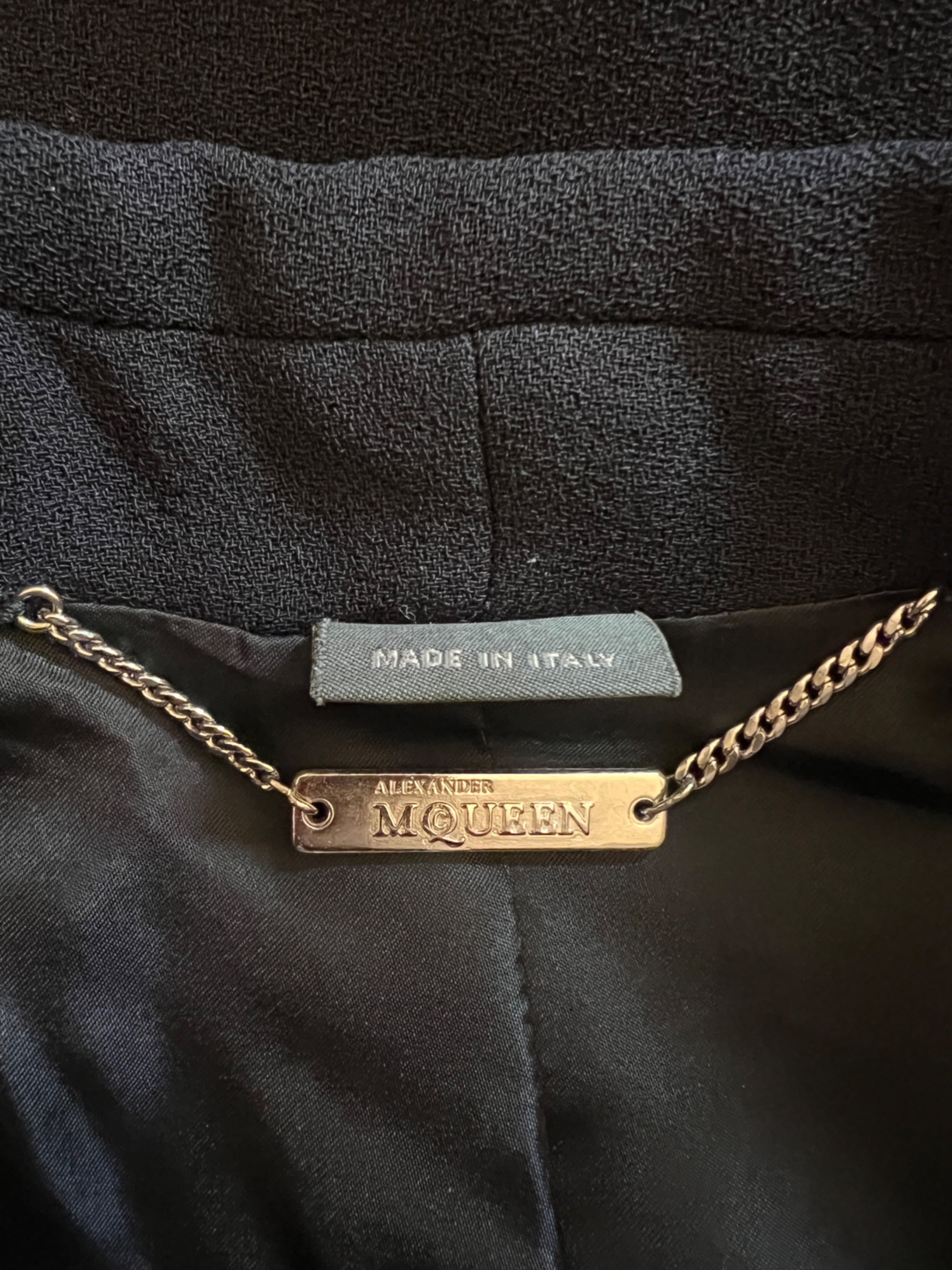 This elegant Alexander McQueen jacket is from the late designer's 2008 collection and was designed by his hand. Note the subtle hint of gothicism and the cerebral draping of the deep navy wool. The jacket features the ingenious tailoring that the designer was known for; a panelled construction creates a feminine silhouette with curved seams over the hips creating a slight peplum waist. The sleeves are cut very slim with a graceful, lightly flared cuff that sits over the hand - a signature of the designer during this period. The jacket fastens at the front with hidden mother-of-pearl buttons and two fabric-covered buttons that can be seen if the jacket is worn half buttoned-up. It can also be buttoned up to the neck, creating a more stiff, formal look with a raised neckline. The jacket is fully lined with black satin. There is a silver-tone metal hanging chain inside the collar adorned with a plaque that is engraved with the brand logo.