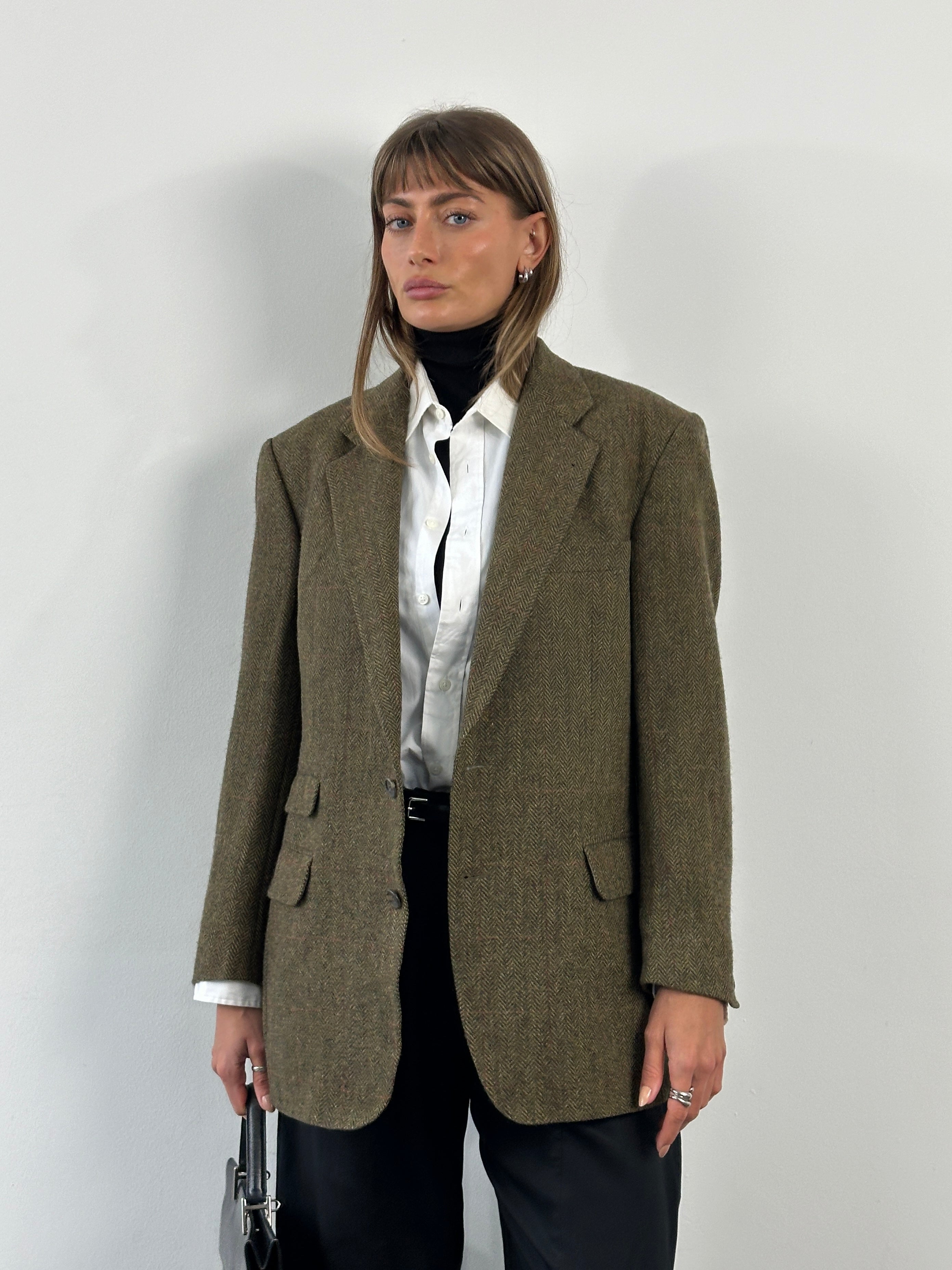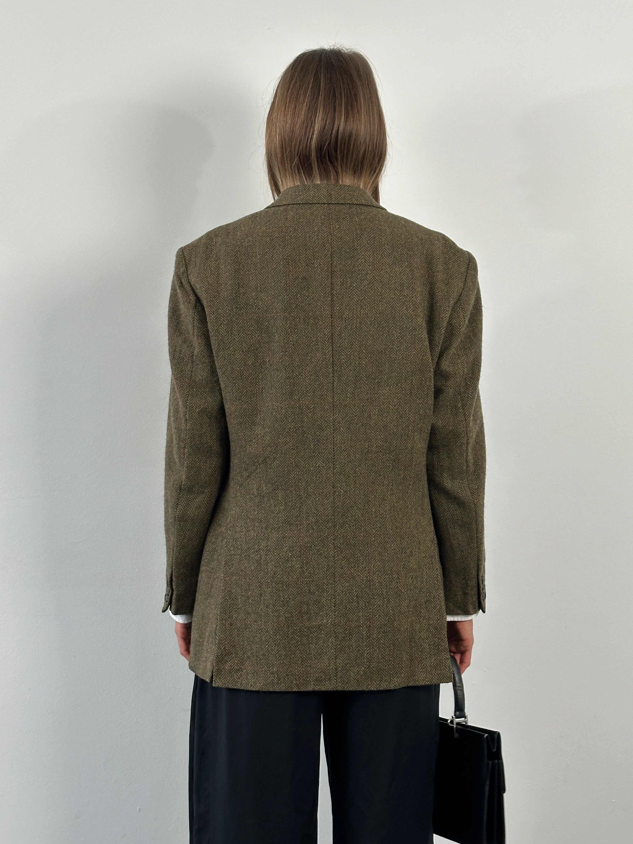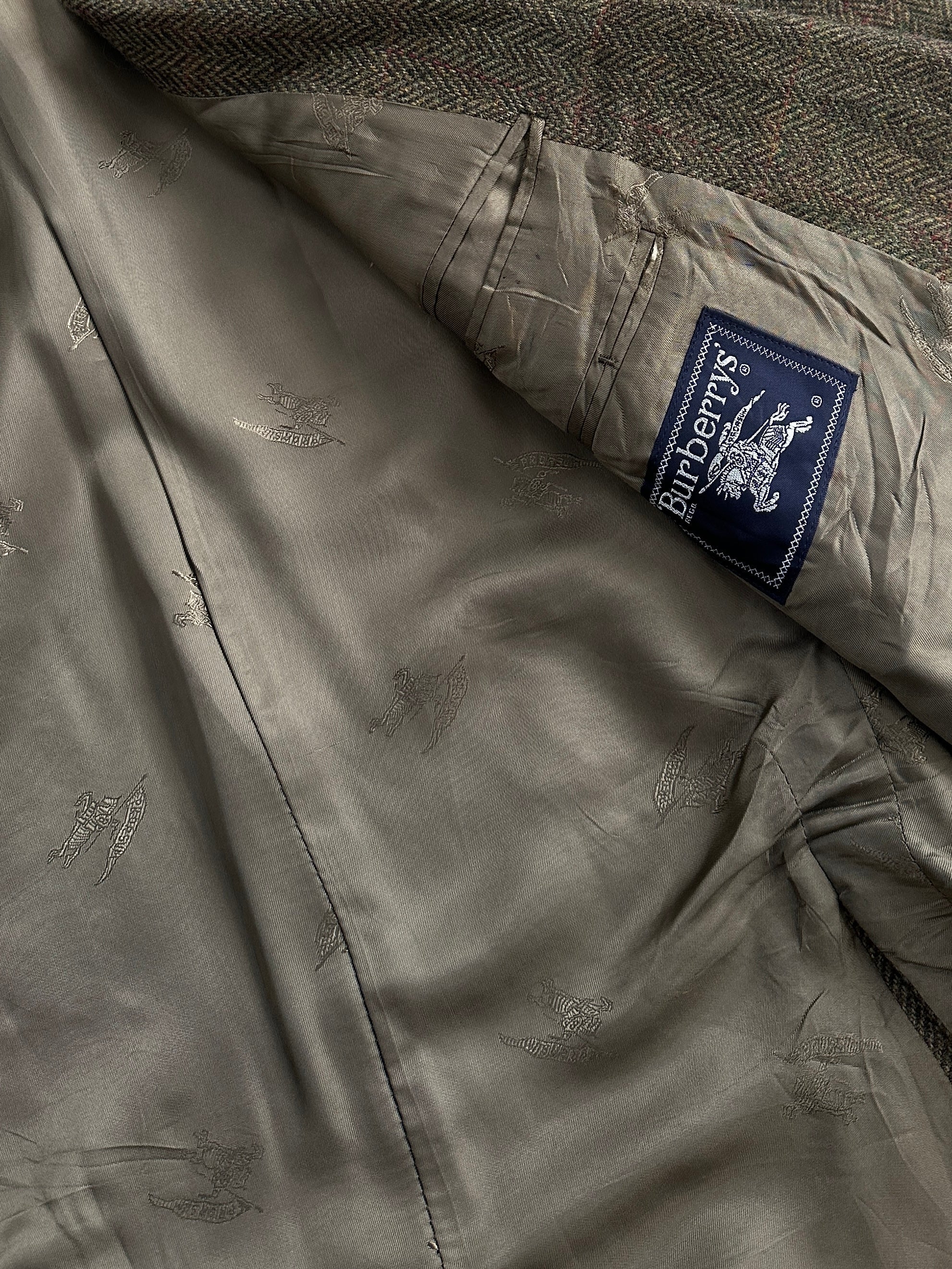 A vintage 1990s Burberry single breasted blazer in a soft khaki tone with a faint brown check throughout. A classic brushed wool handle with a relaxed tailored silhouette that feels timeless and understated.