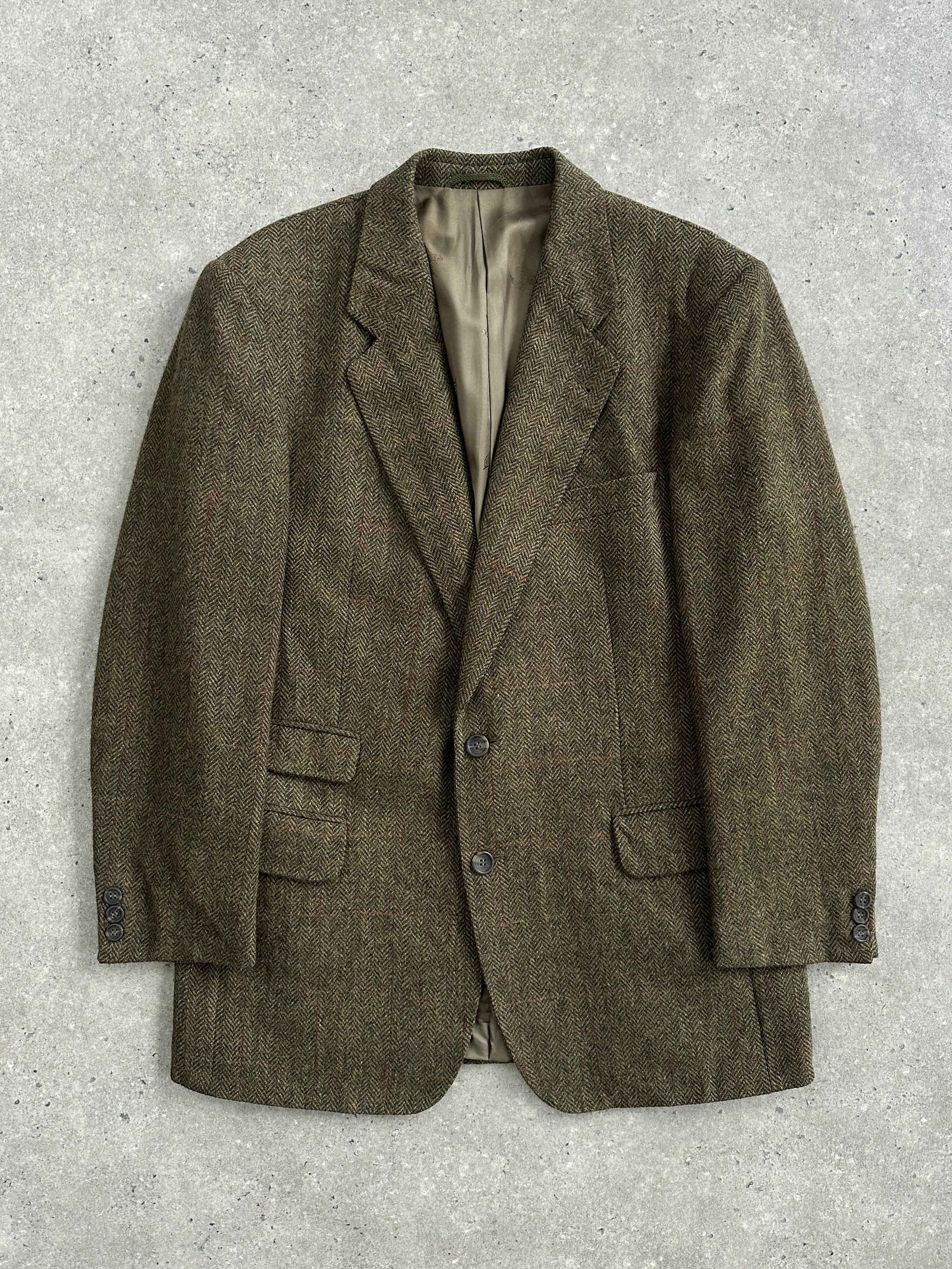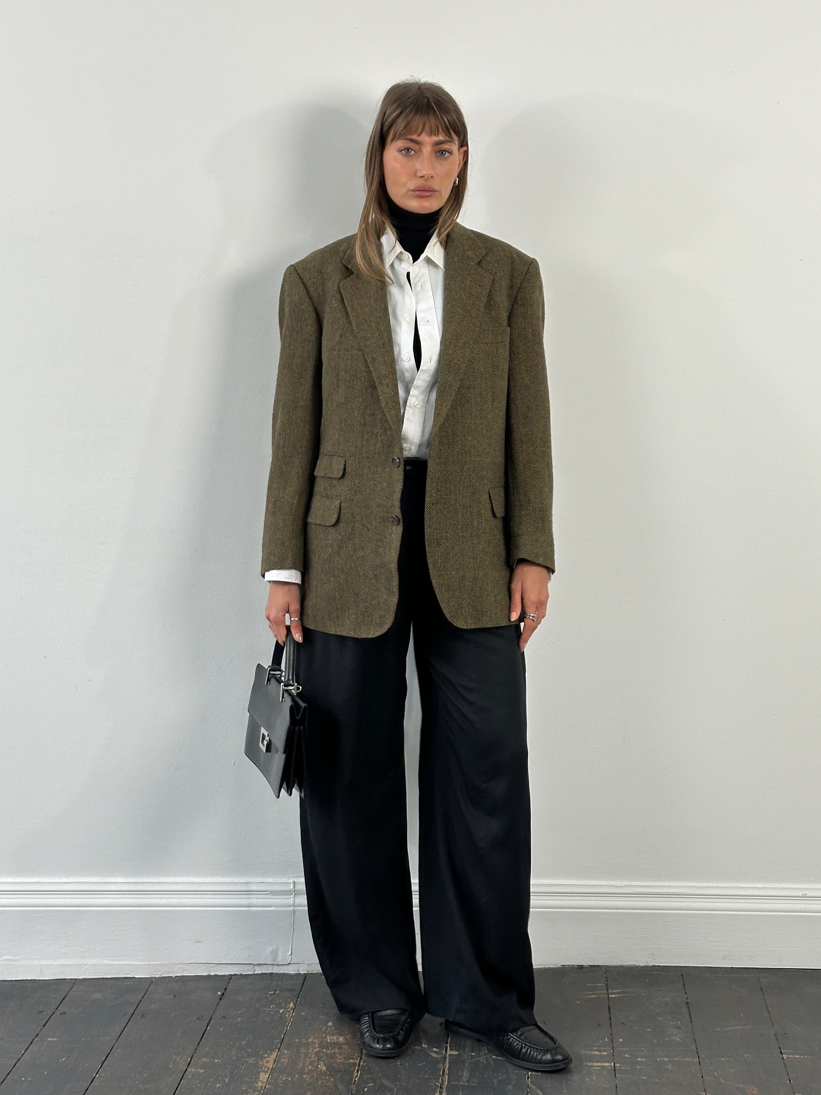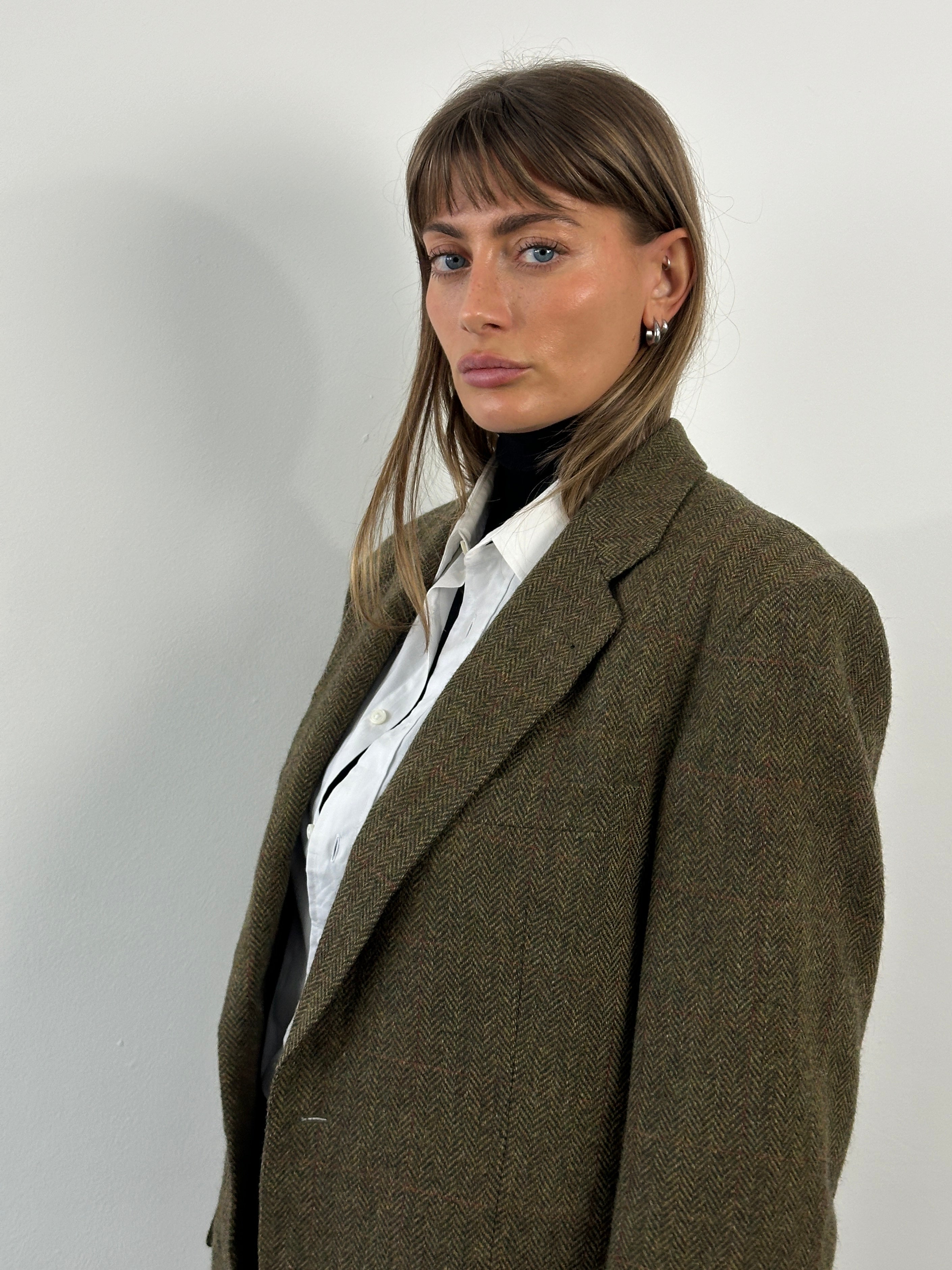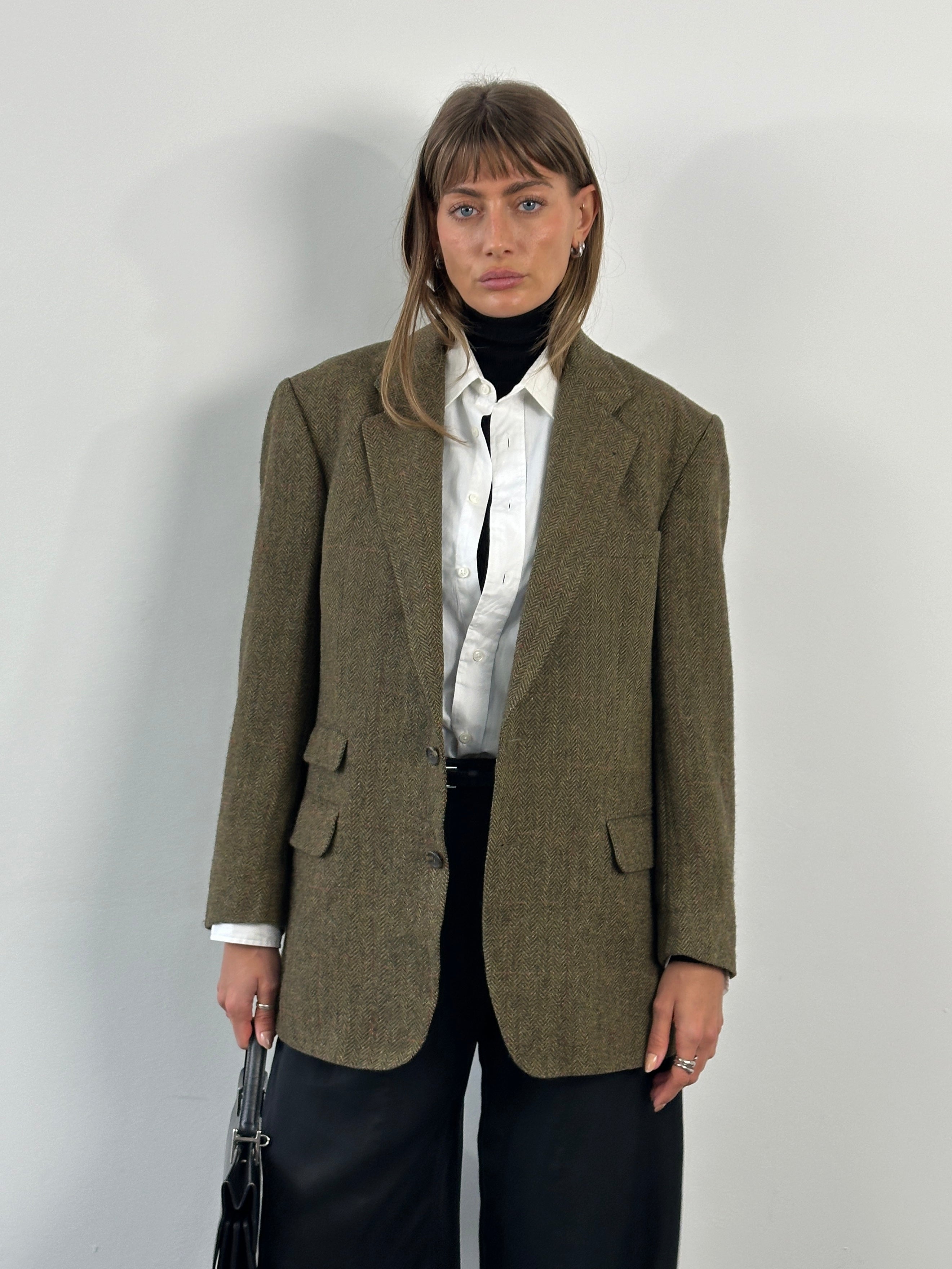 A vintage 1990s Burberry single breasted blazer in a soft khaki tone with a faint brown check throughout. A classic brushed wool handle with a relaxed tailored silhouette that feels timeless and understated.
