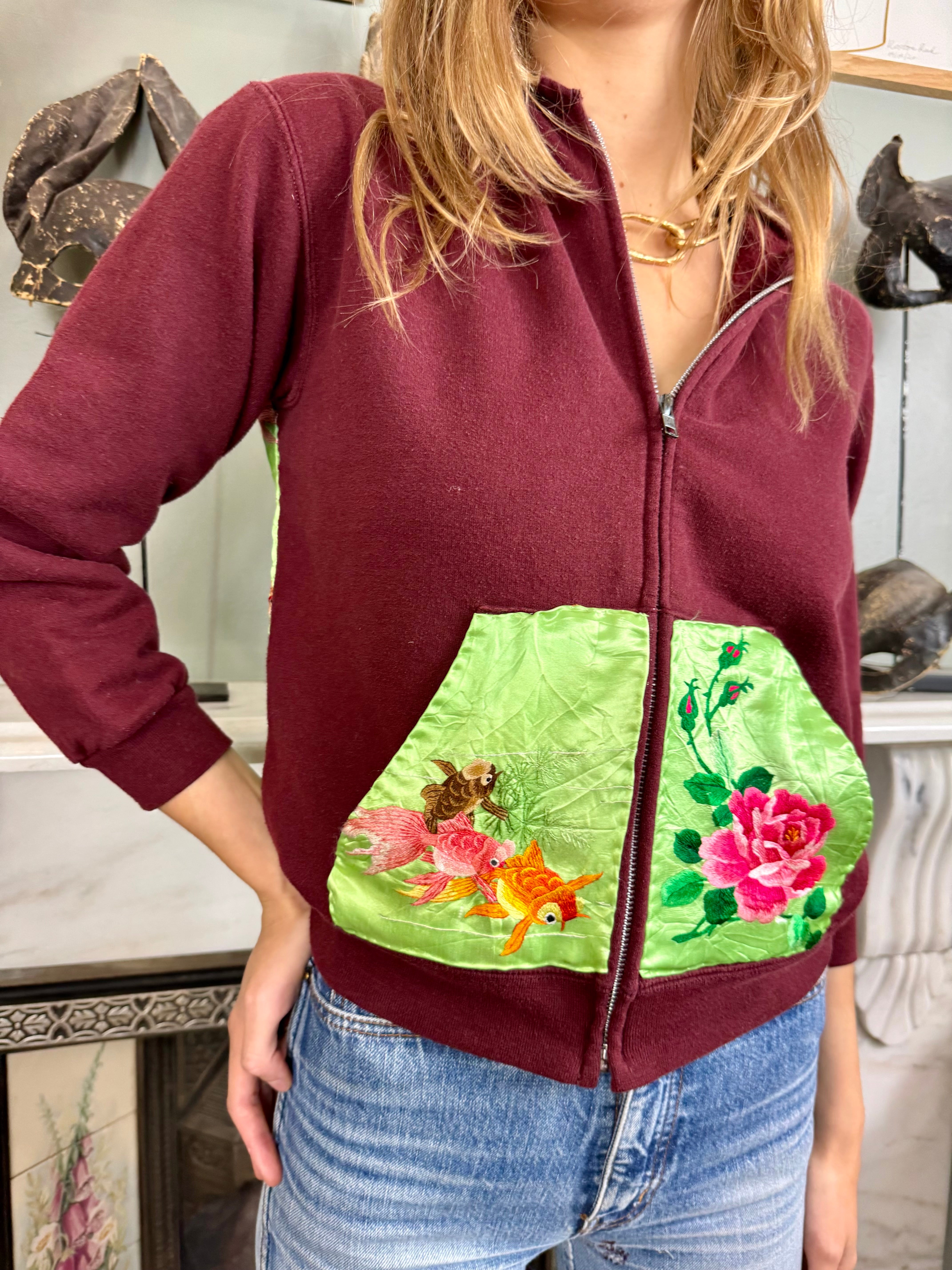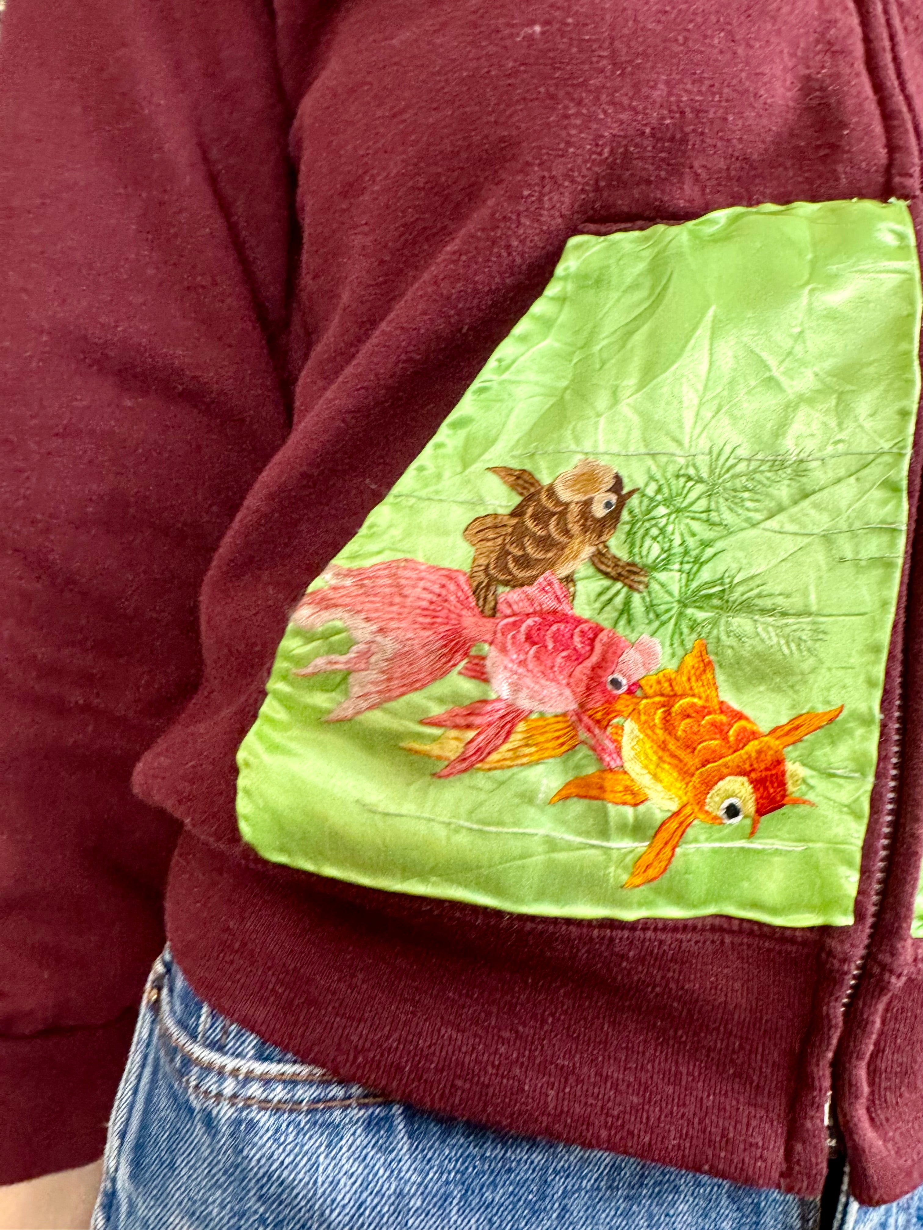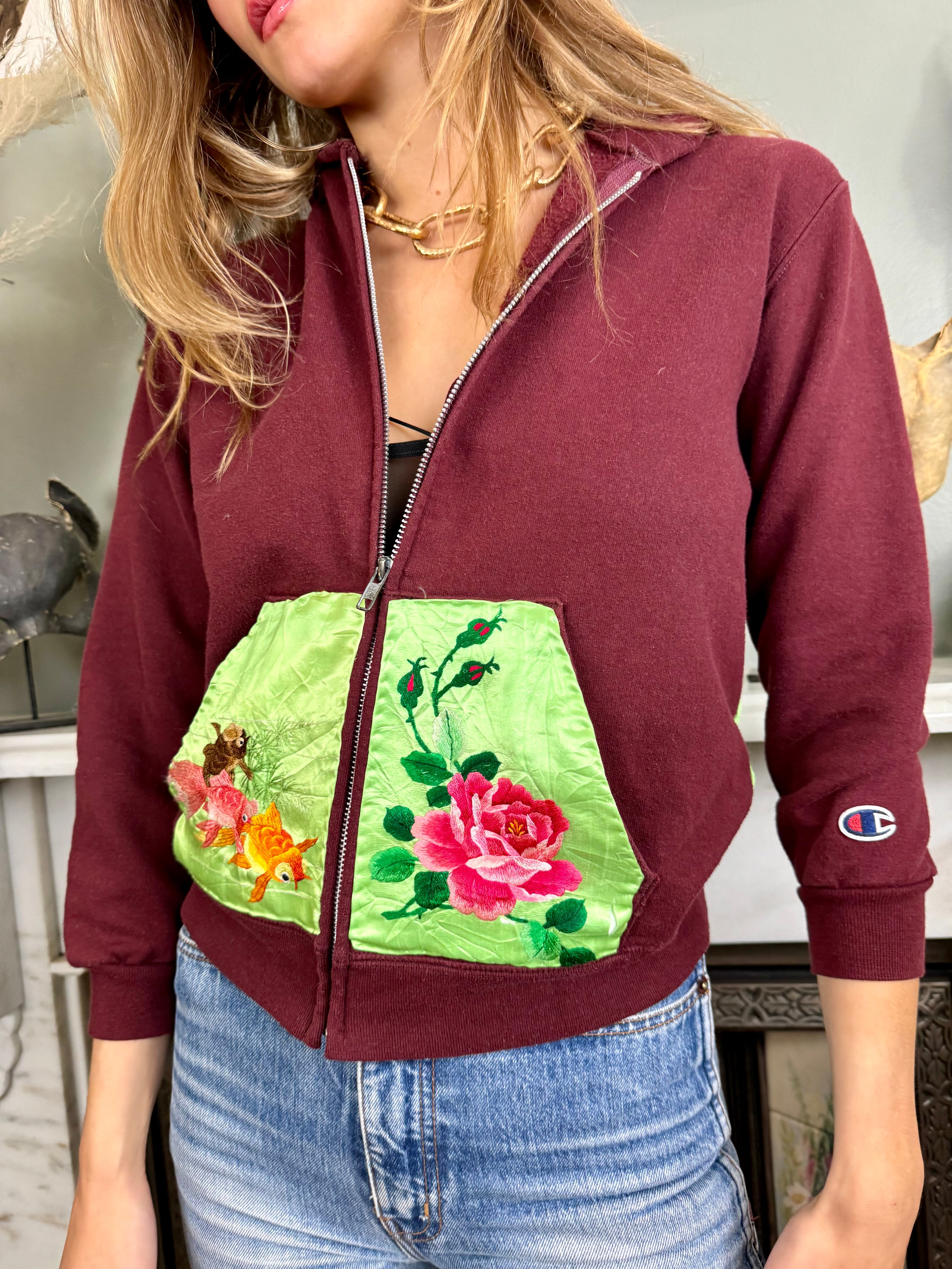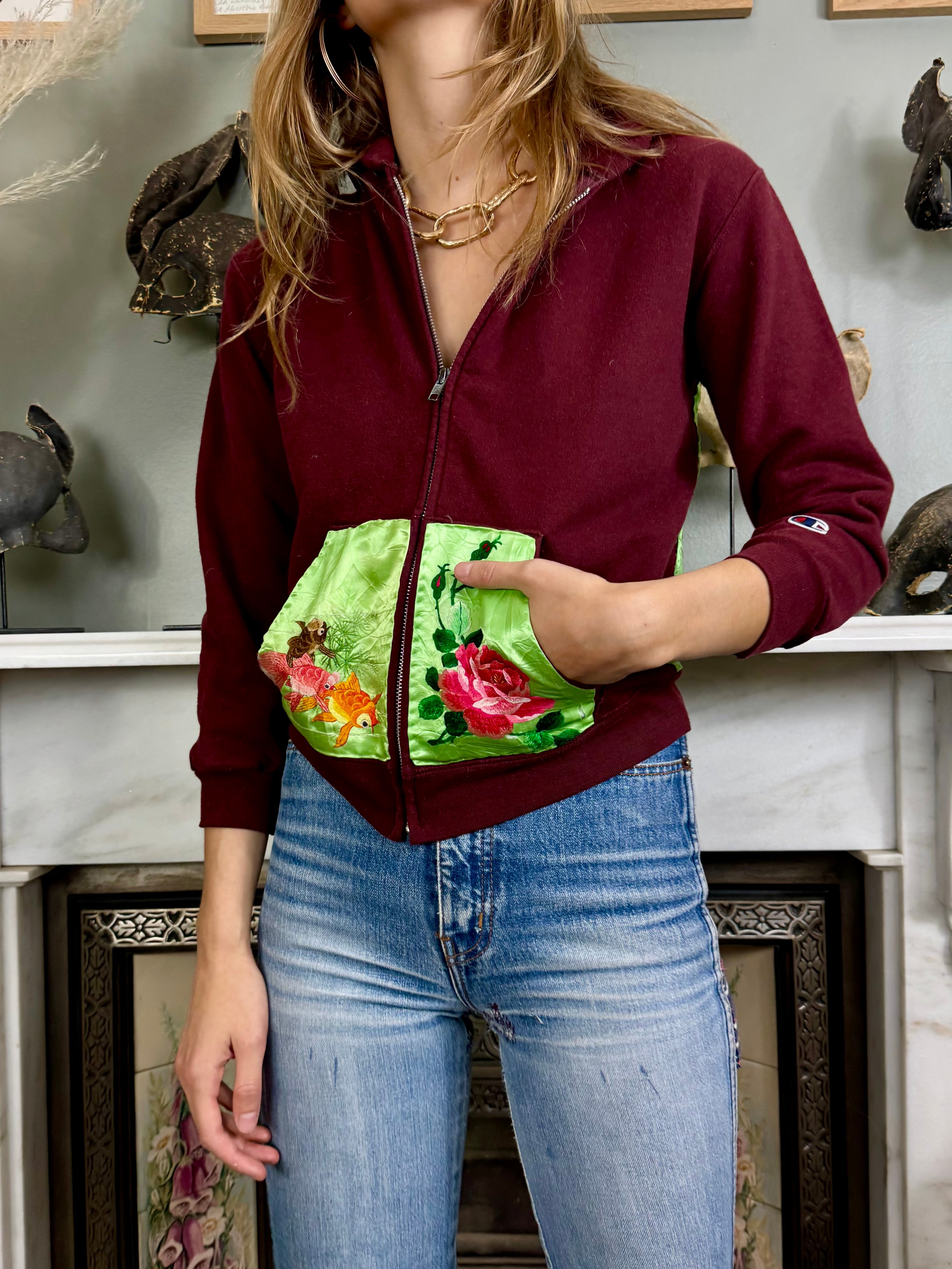 Add a touch of vintage charm to your wardrobe with our one-of-a-kind Davina Champion zip up sweatshirt. Featuring a burgundy color, hood, and long sleeves with a snug fit, this sweatshirt also boasts unique silk embroidery of koi fish on both front pockets and back. Elevate your denim wear with this one-off.