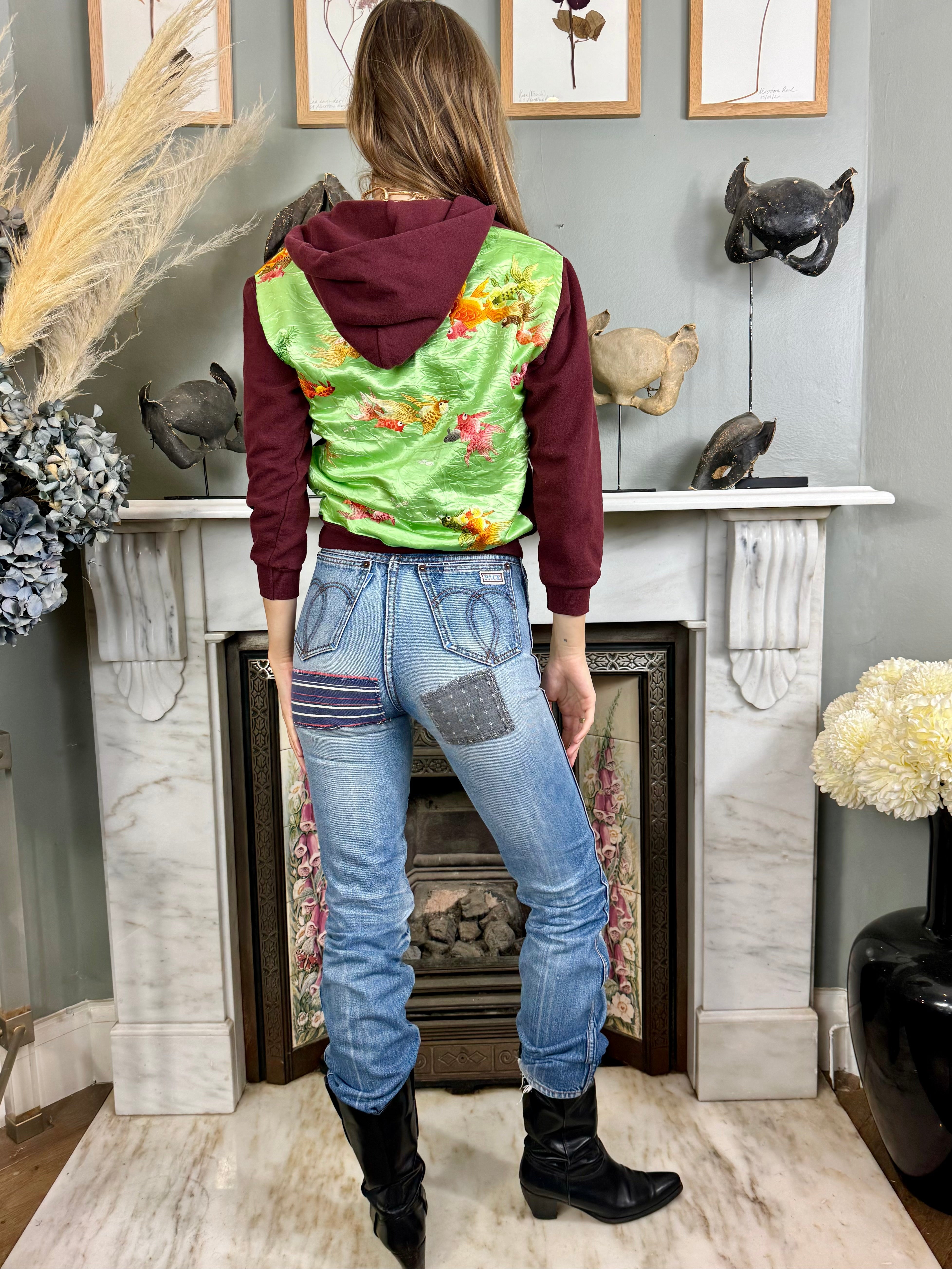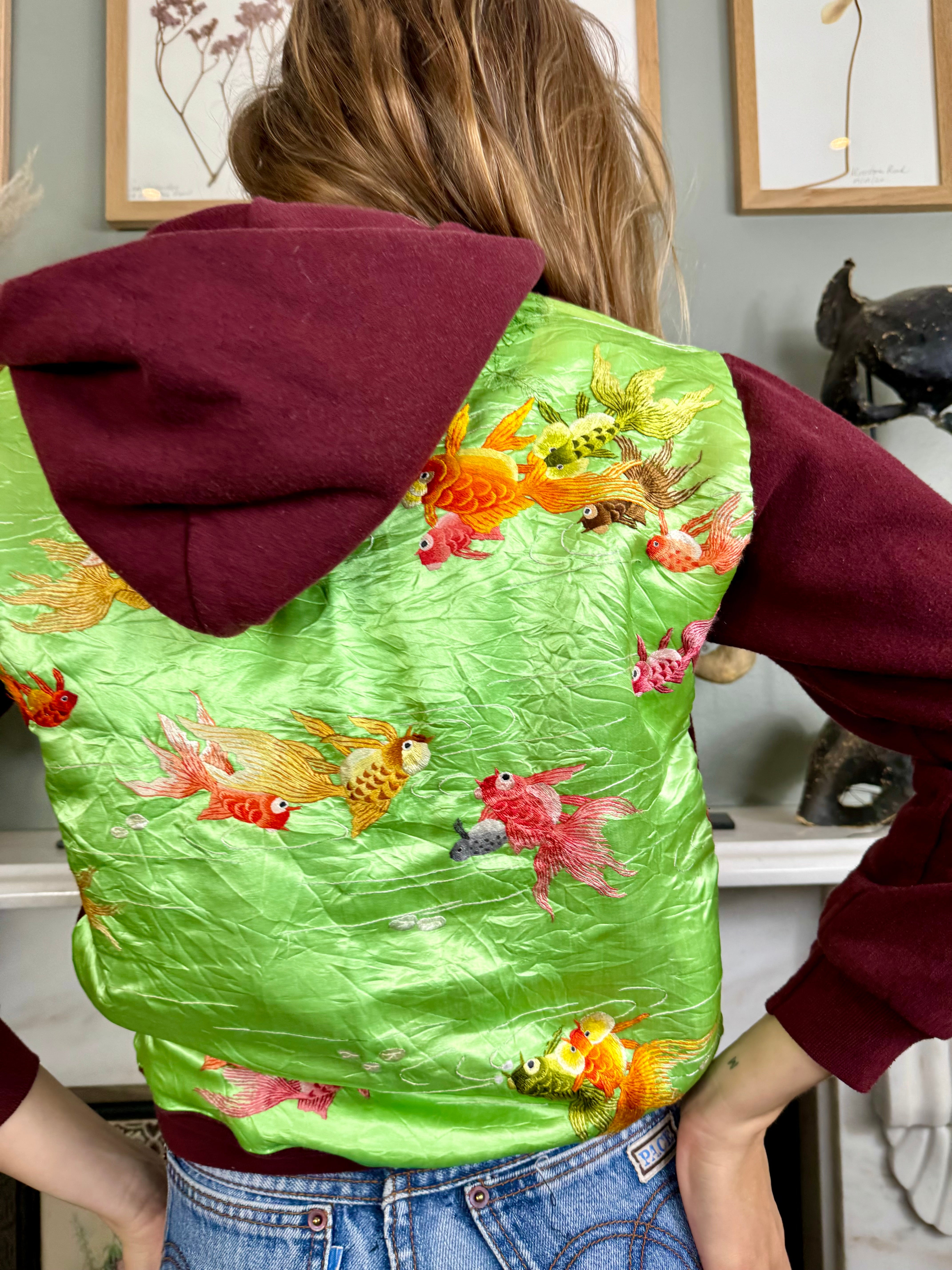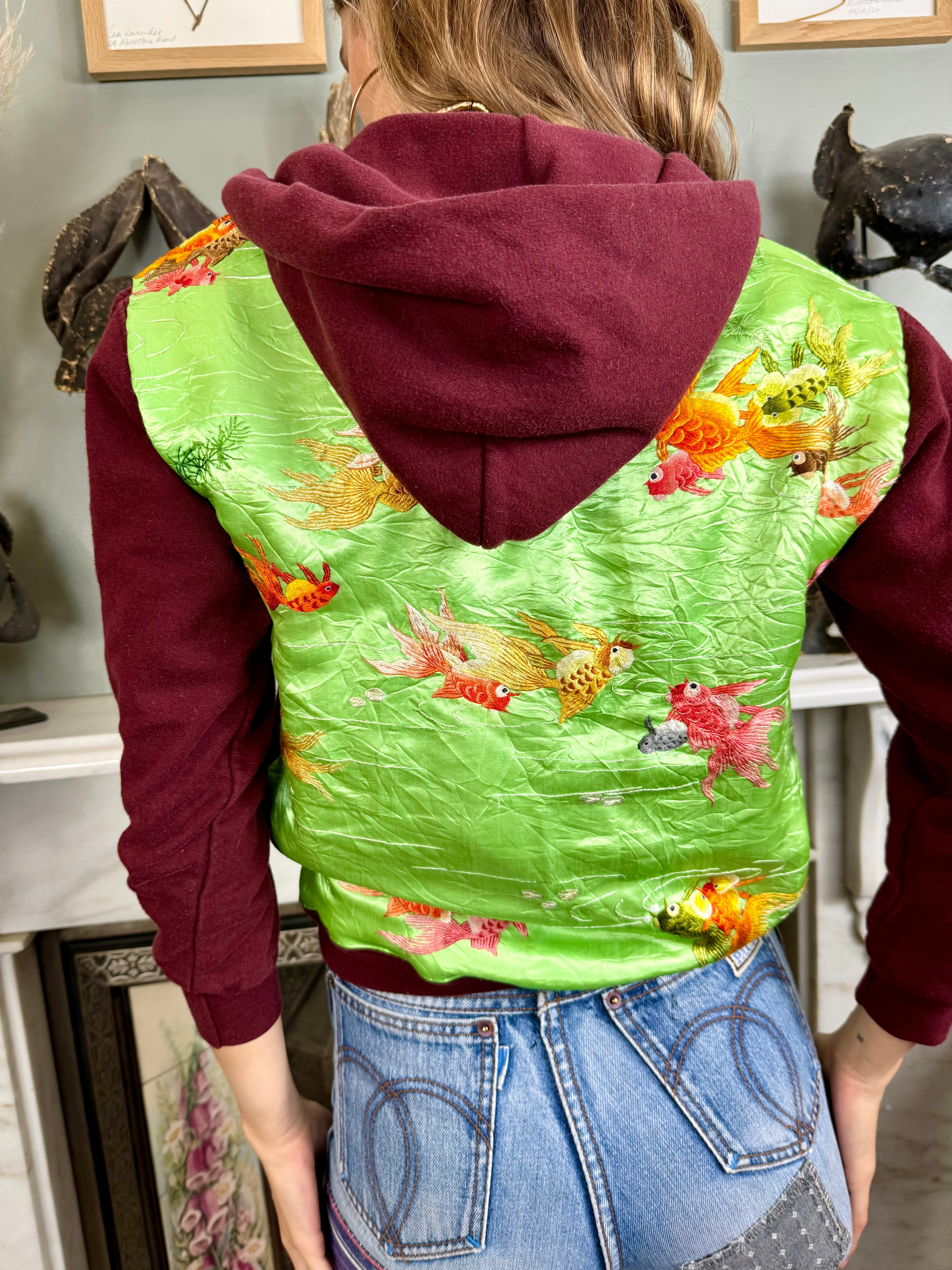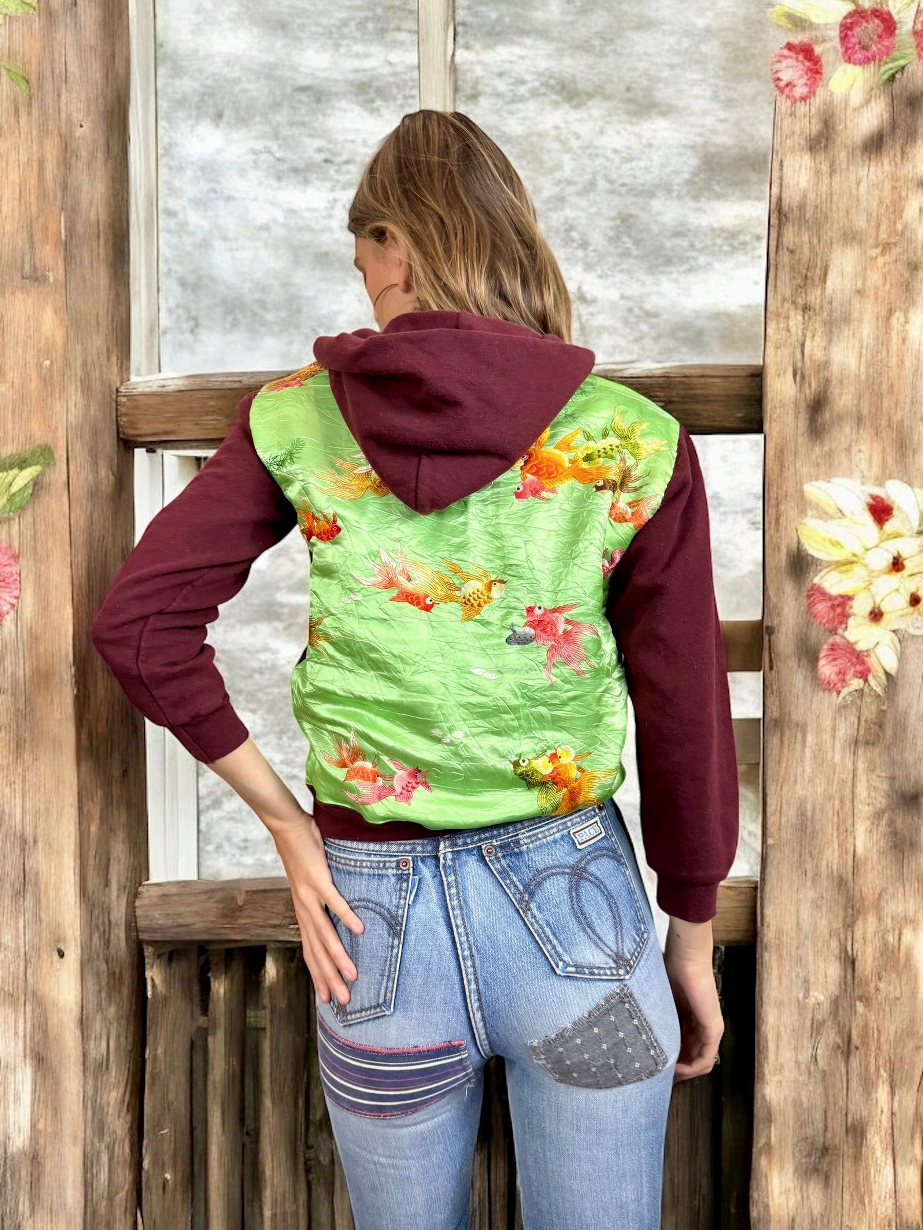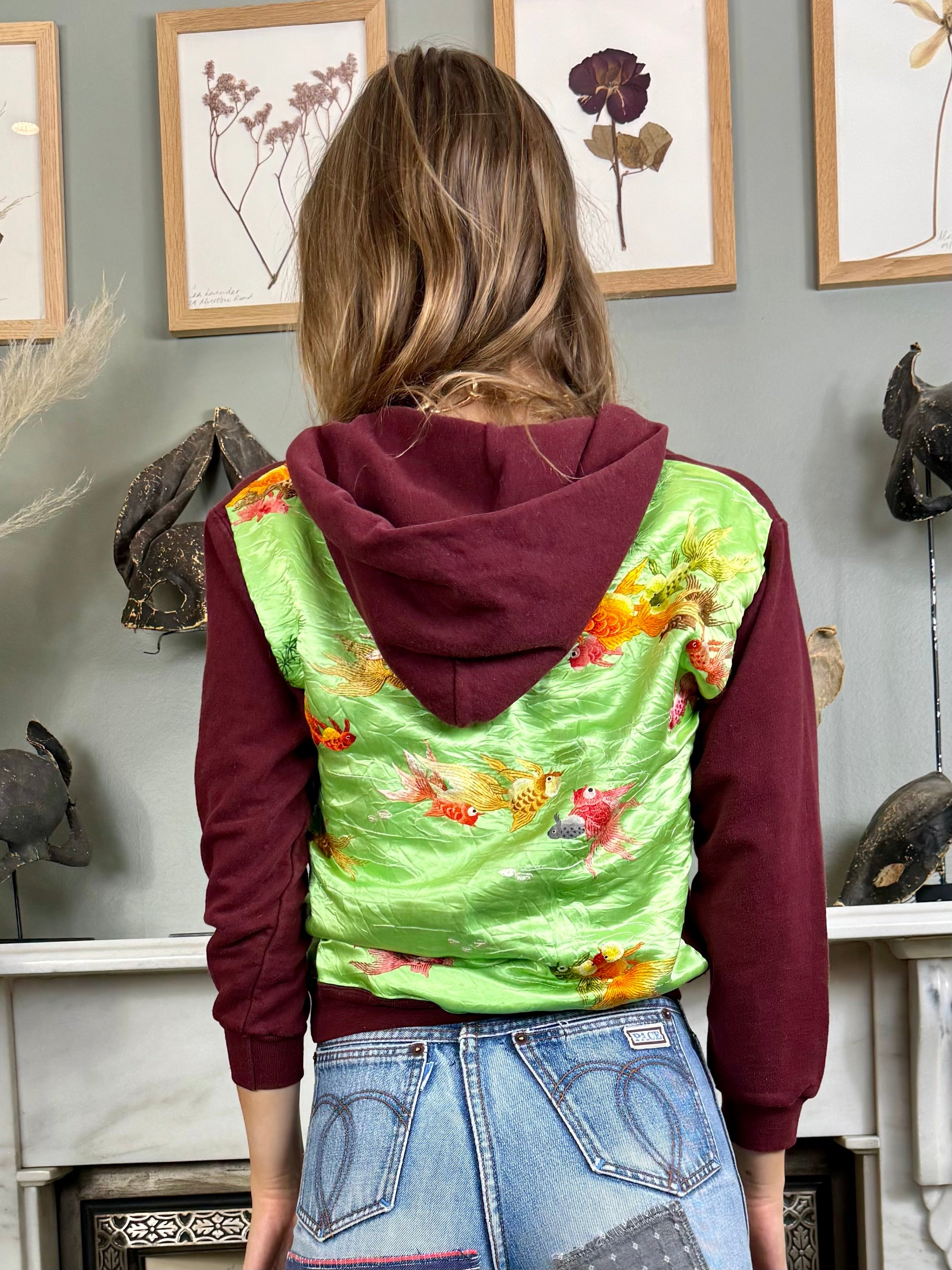 Add a touch of vintage charm to your wardrobe with our one-of-a-kind Davina Champion zip up sweatshirt. Featuring a burgundy color, hood, and long sleeves with a snug fit, this sweatshirt also boasts unique silk embroidery of koi fish on both front pockets and back. Elevate your denim wear with this one-off.