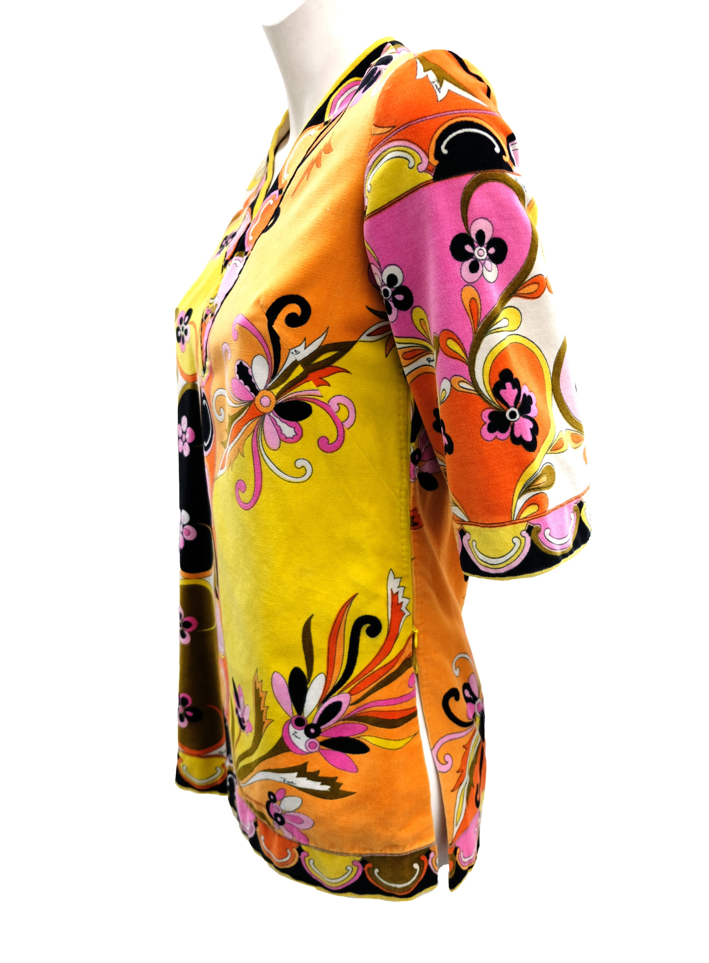 A groovy 1970s vintage V neck tunic by Emilio Pucci, in glorious multicoloured soft velvet. Fabulous signature Pucci psychedelic design in gently faded, but still vibrant, shades of orange, yellow, and pink.