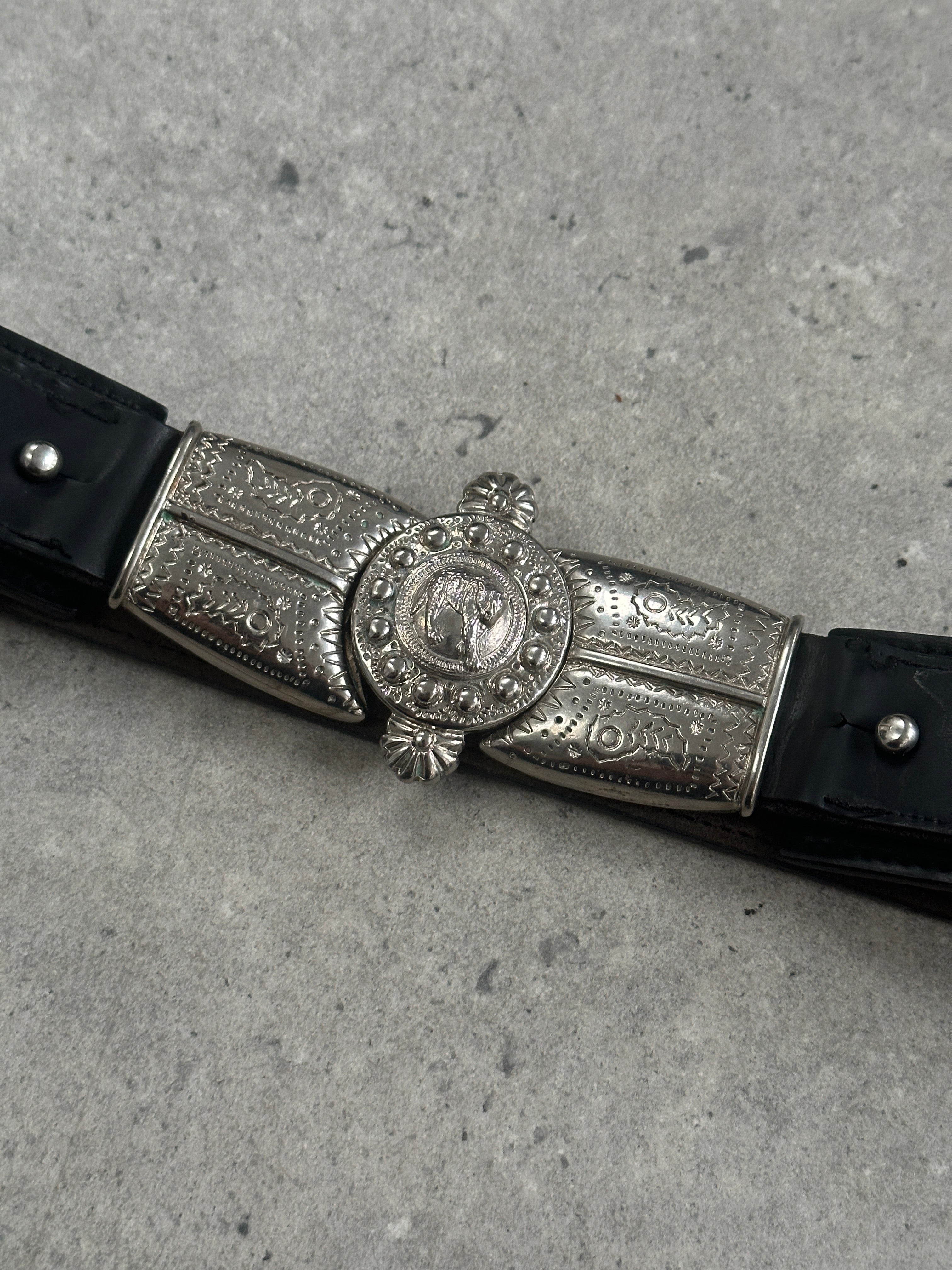 A rare Versus Gianni Versace leather belt featuring an ornate silver panther buckle with engraved detailing. A statement archival accessory with strong sculptural character and signature 1990s Versus hardware.