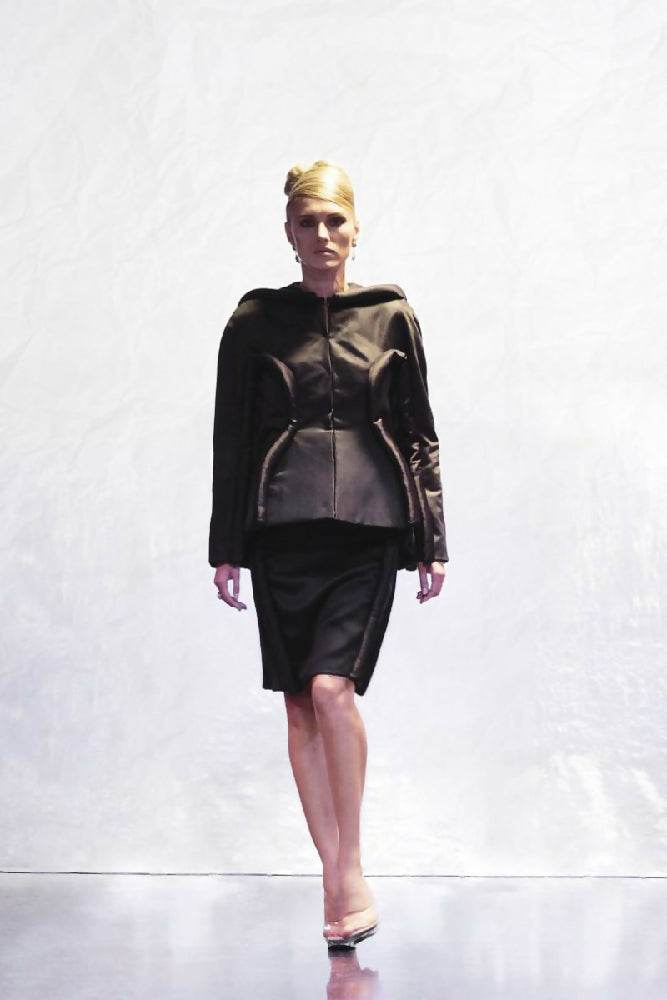 Hunched Tube Jacket S/S 2015: Fitted hunched jacket is cut into a boxlike shape from the centre front to the sides and back. Centre front panels are cut into an "s" shape, seams start from each side of the upper chest, down the bust and past the waist. The inside of the centre front panels has corset boning sewn in for holding the outer front shape. Both front and back Jacket sleeves are joined together with a side seam, starting at the neck down to wrists, and have silk tubes sewn on the outer inside seams of the sleeves, connecting to the centre front outside side seams of the jacket. There are hook and eye front closures for opening and closing jacket. The back of the jacket is cut into an oval shaped curve, starting from the top edge of the shoulders down to hem, which gives the back of the jacket an exaggerated shape. Silk tubes sewn across the top of the neckline, shoulders and down the back side seams. Outer fabric: 100% silk in dark brown duchesse satin. Lining: 100% silk satin in dark brown. Size 10 LAST ONE