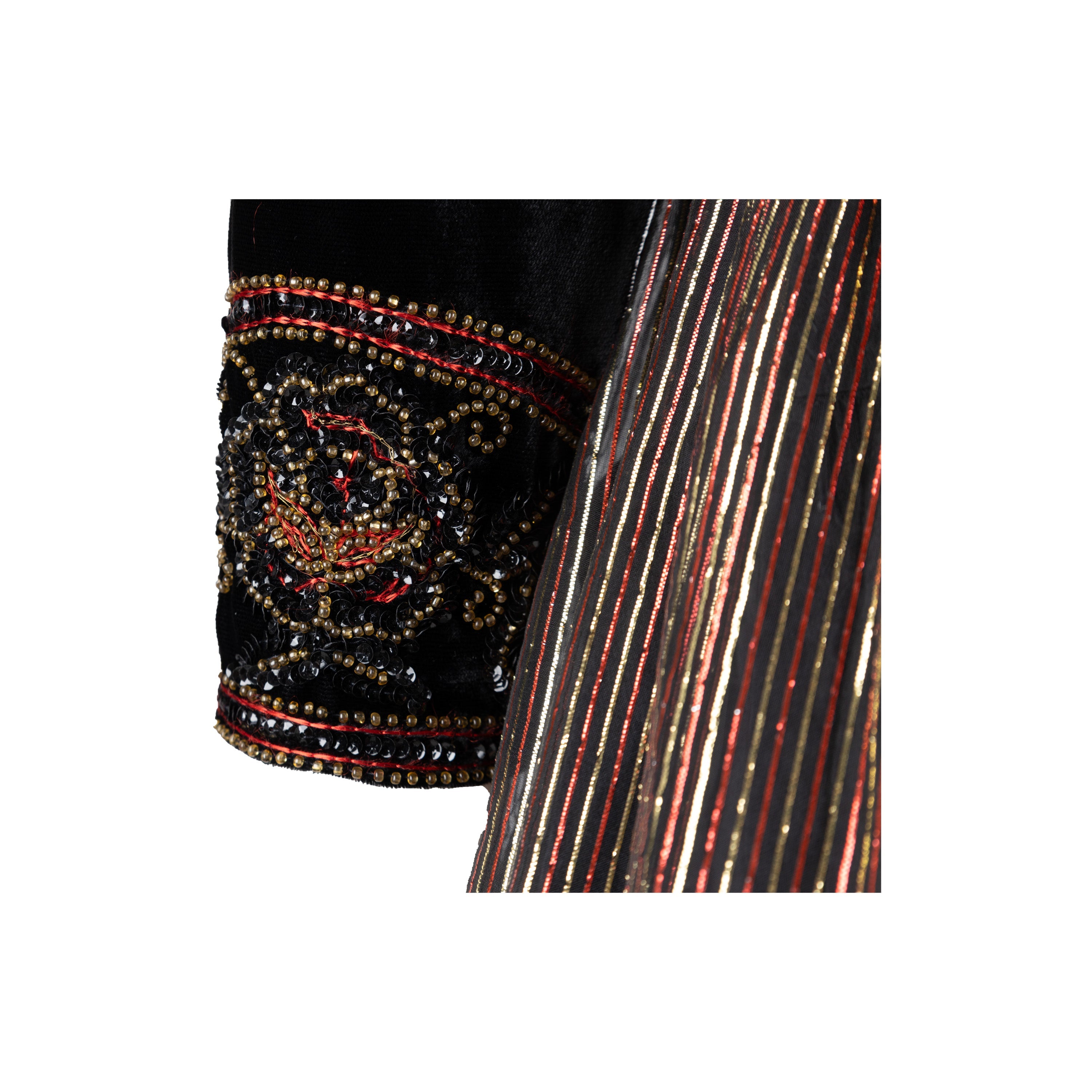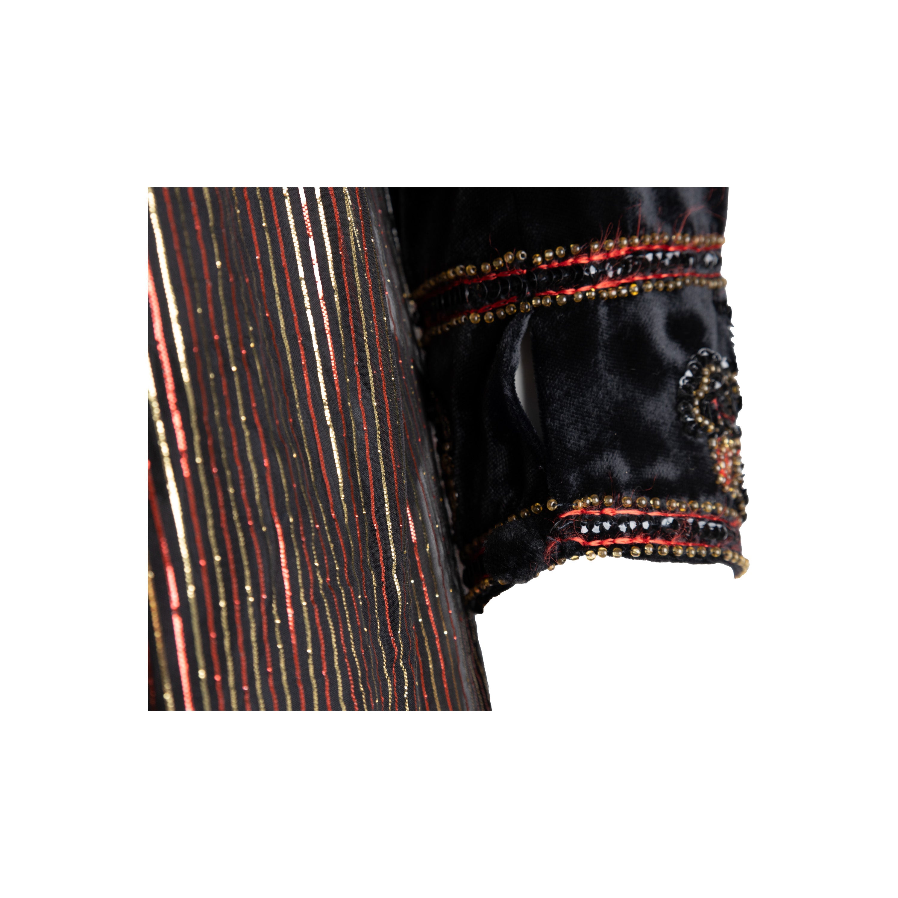 This vintage-style dress from Lancetti is sure to make you feel like the belle of the ball. Crafted using a combination of black velvet and sheer shimmer fabric, it is embellished with multicolor beads, sequins and threads. Its full sleeve and round neckline provide a flattering silhouette, while the black underskirt ensures extra coverage.