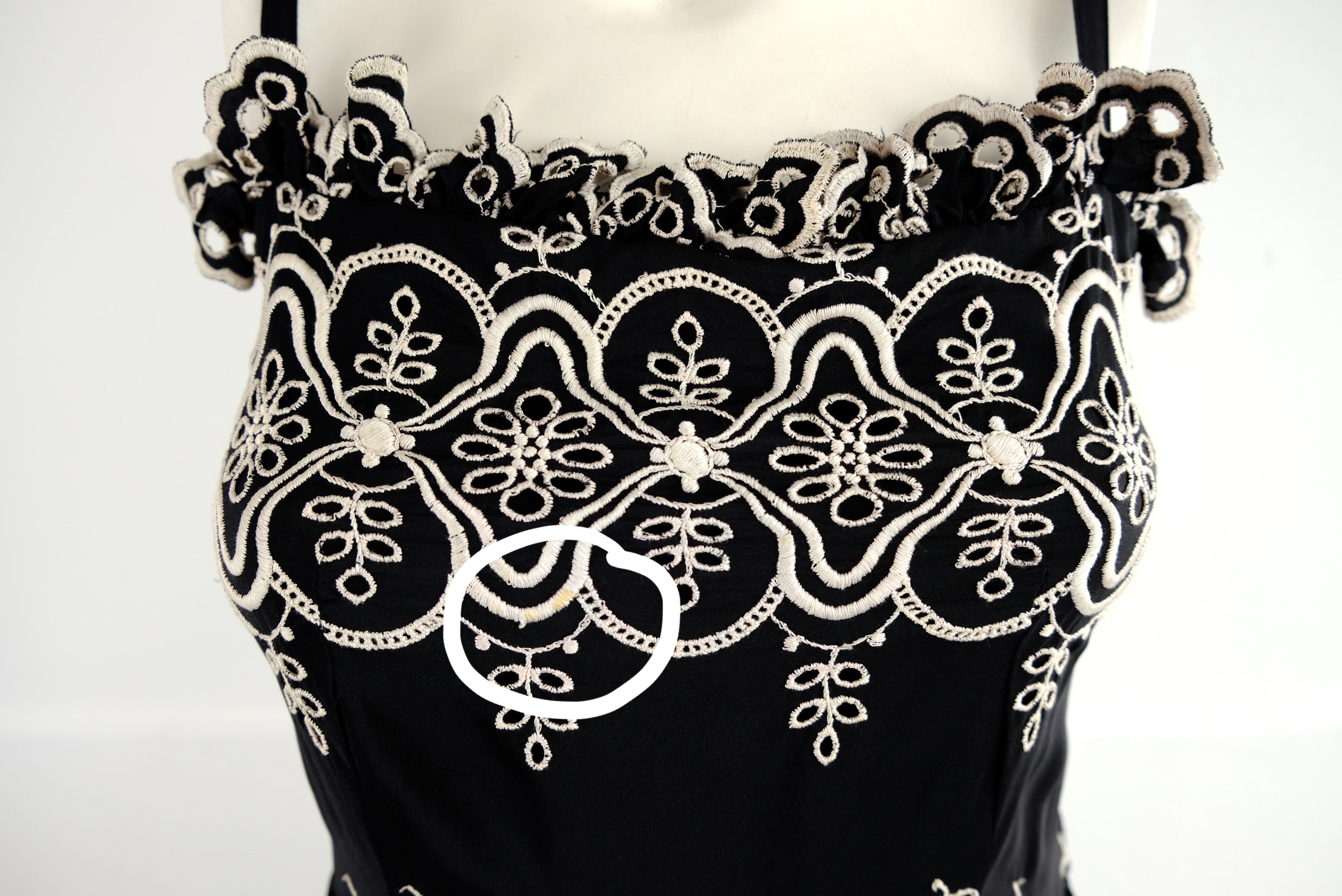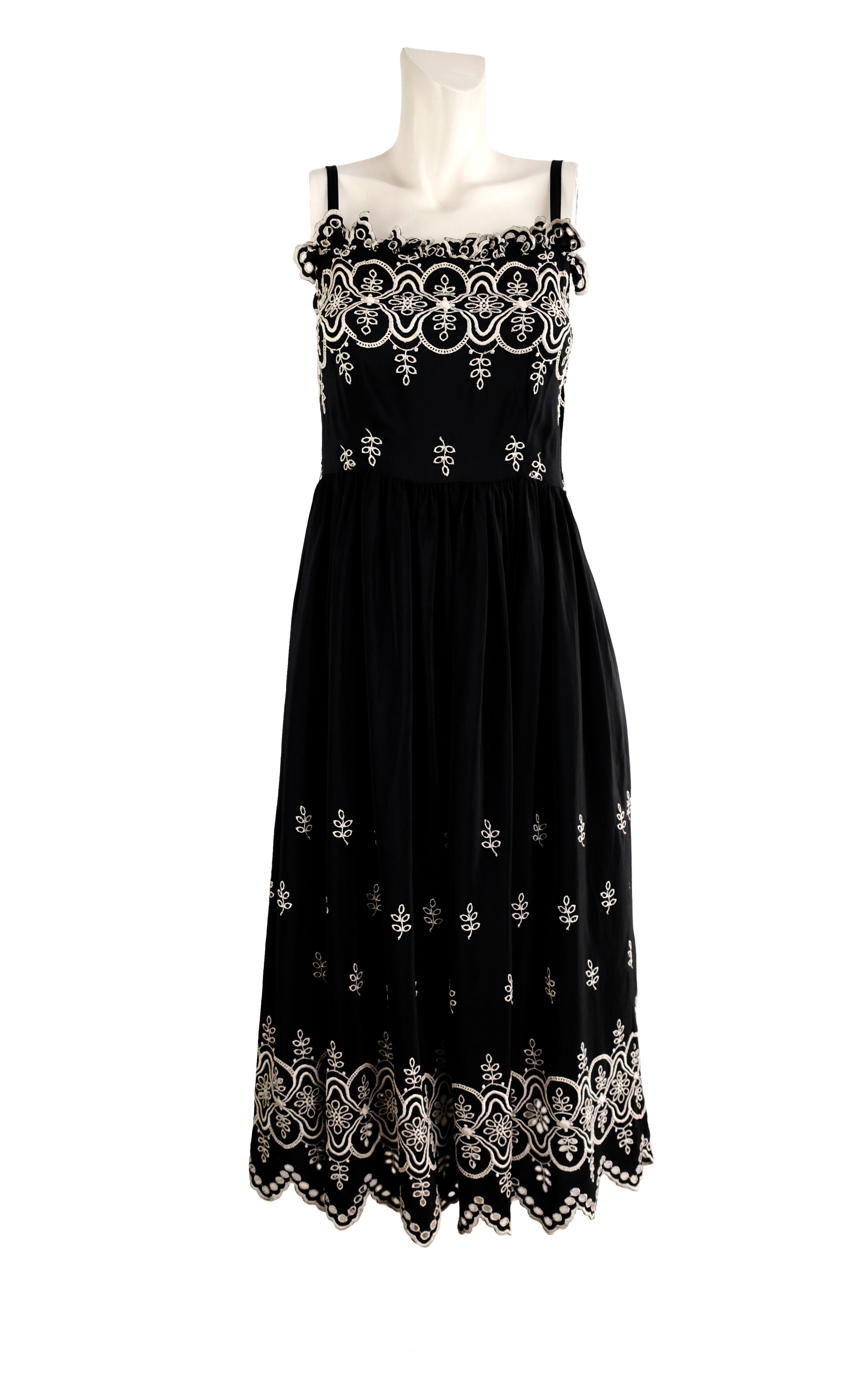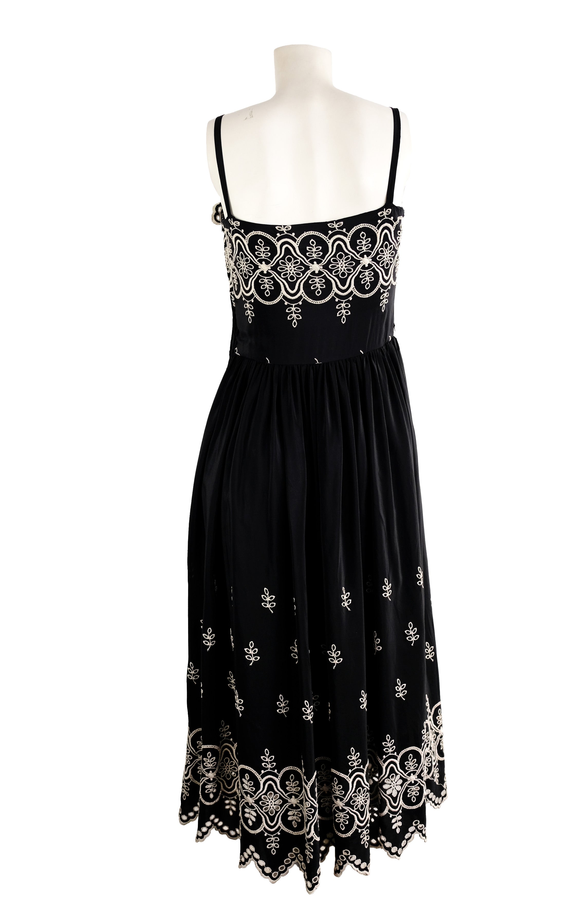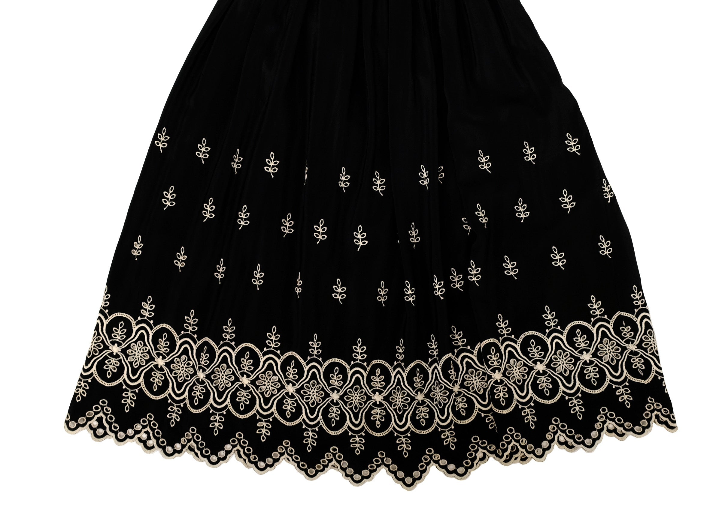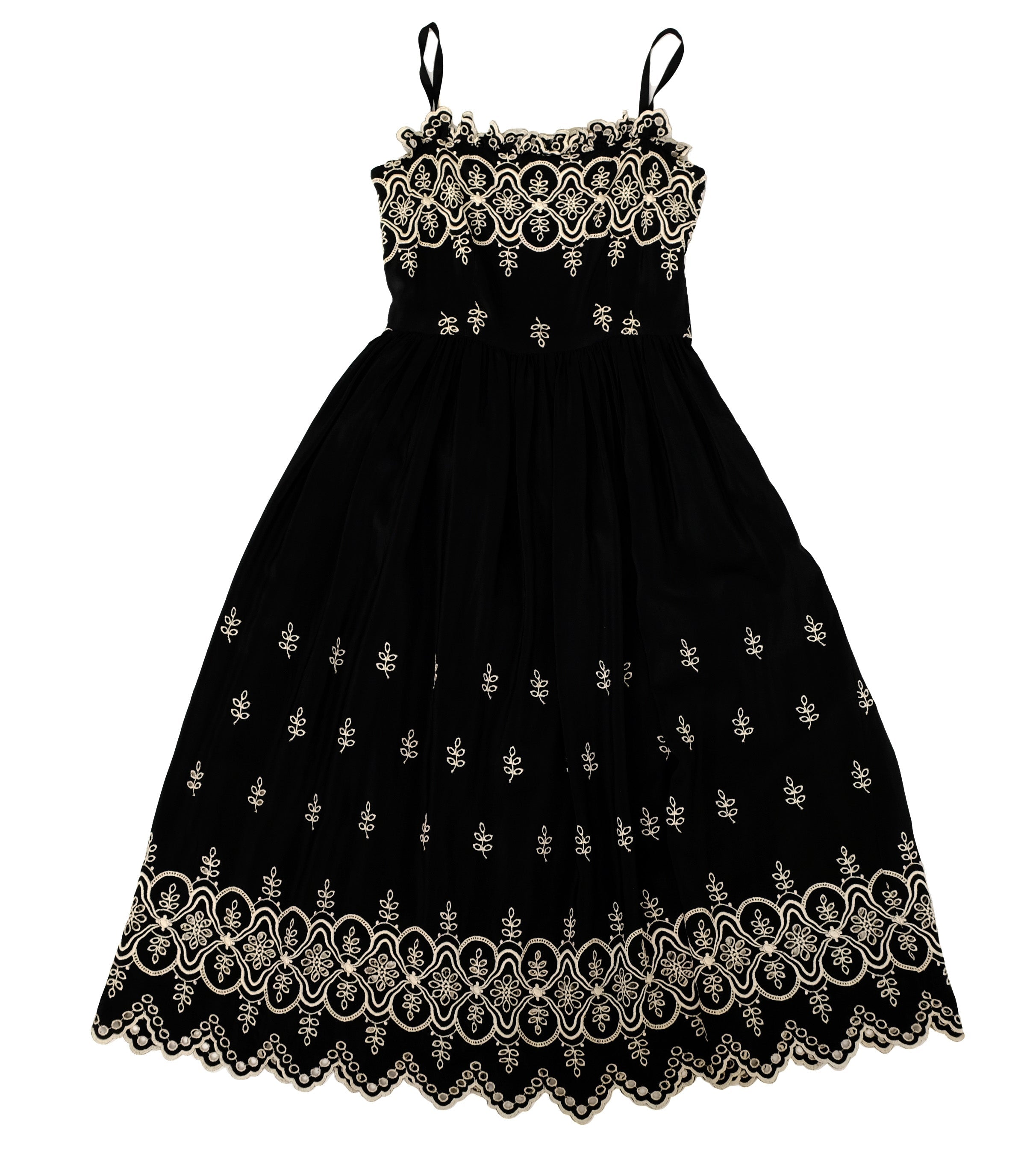 Fitted bodice with narrow shoulder straps and topped with an embroidered frill. High waist with gathered skirt falling gently to mid calf length. Profusion of beautiful embroidery to the bodice and skirt, particularly at the scalloped hem.